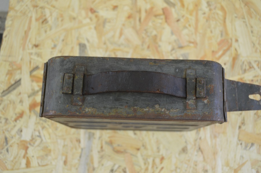 Ящик чердачного сохрана. Немного почищен, помыт. Присутствует небольшая ржавчина, много родной краски. Клейм не обнаружено. Ящик полностью не закрывается (см. фото). На ящике оригинальная кожаная ручка переноски (см. фото).