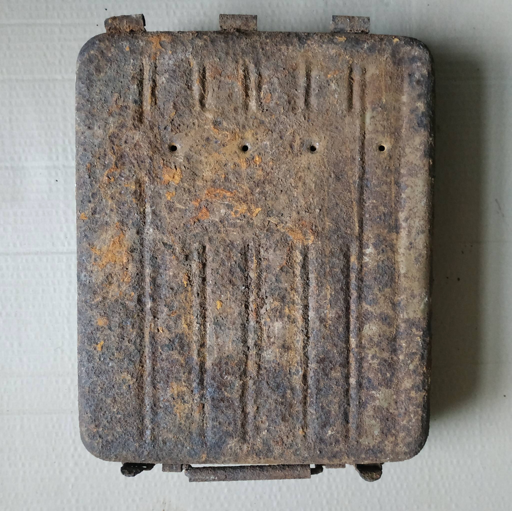 Ящик в задовільному стані, міцний по формі, ручки і замки рухаються, без деформацій. Одна сторона має більшу корозію, якщо чистити до голого металу, то отворів буде більше, але локально, не по всій площі, ці з'явилися від простукування молоточком.