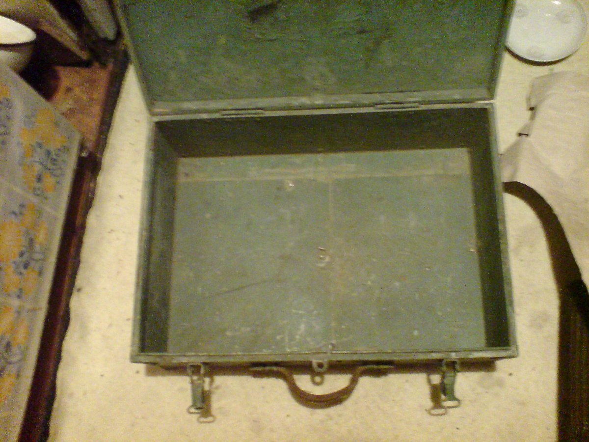 Ящик крепкий.Изготовлен из фанеры.Замки,петли рабочие.Ручка из кожи.Размер19х37х51.Клейм не обнаружил.Чердачный сохран.