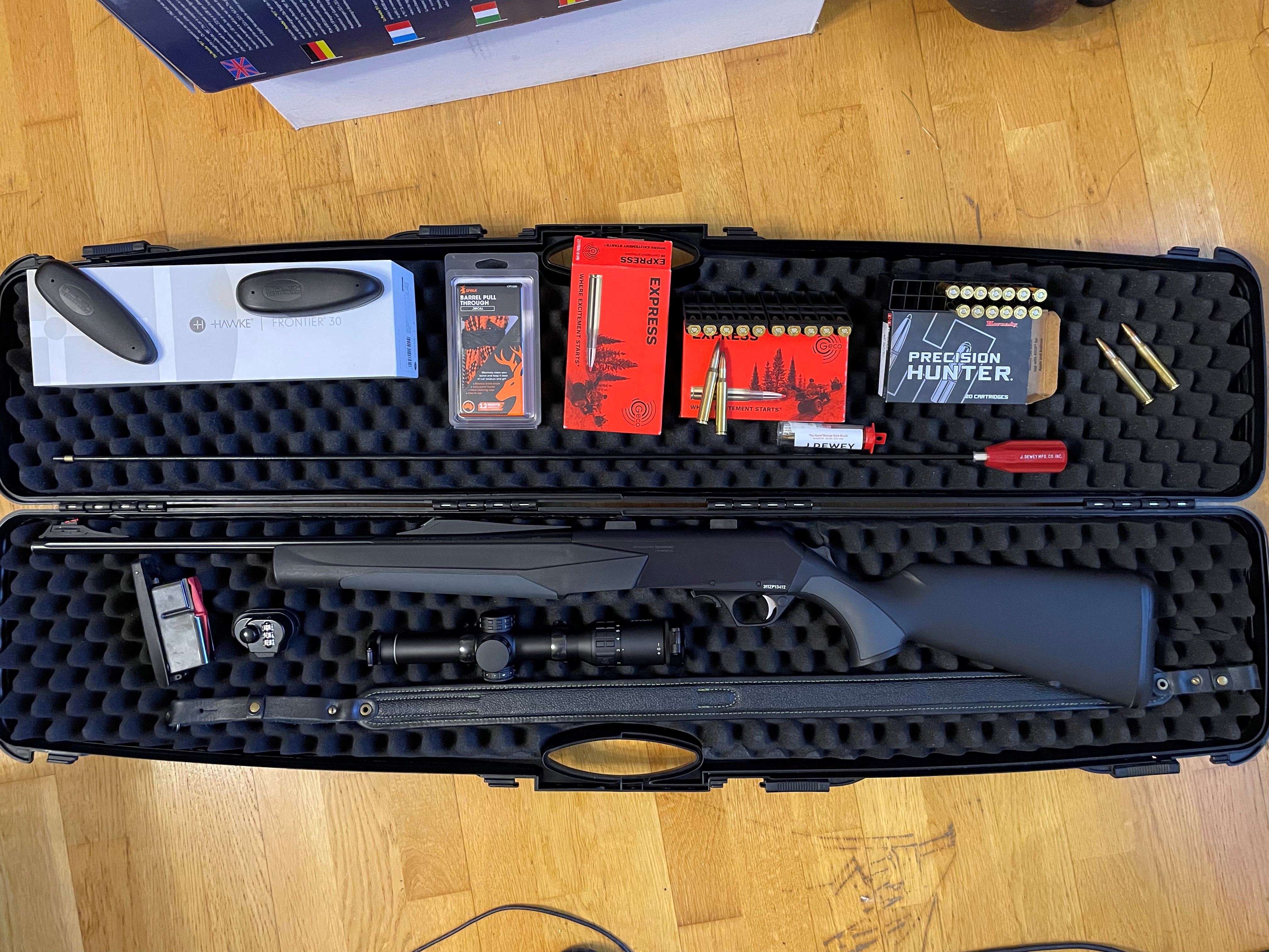 У комплекті з кейсом, двома змінними потиличниками, кодовим замком на спускову скобу, набоями(десь 45шт), шкіряним ременем зі швидкознімними антабками, деякими засобами для догляду за зброєю.
