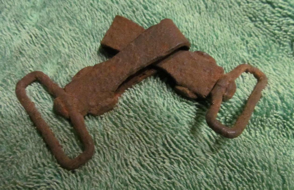 Предложу у карабина, возможно от МГ. Не разработанные, соединены еще в то время. В таком состоянии и были найдены. Ширина петли - 35мм внутри.