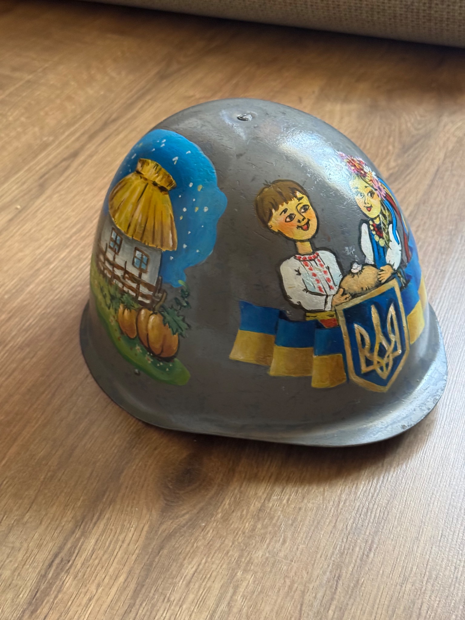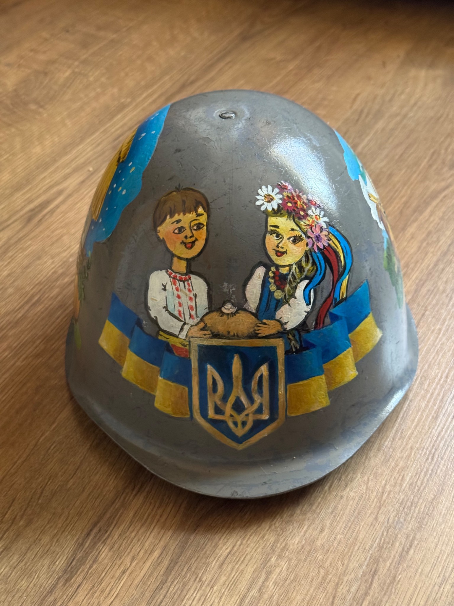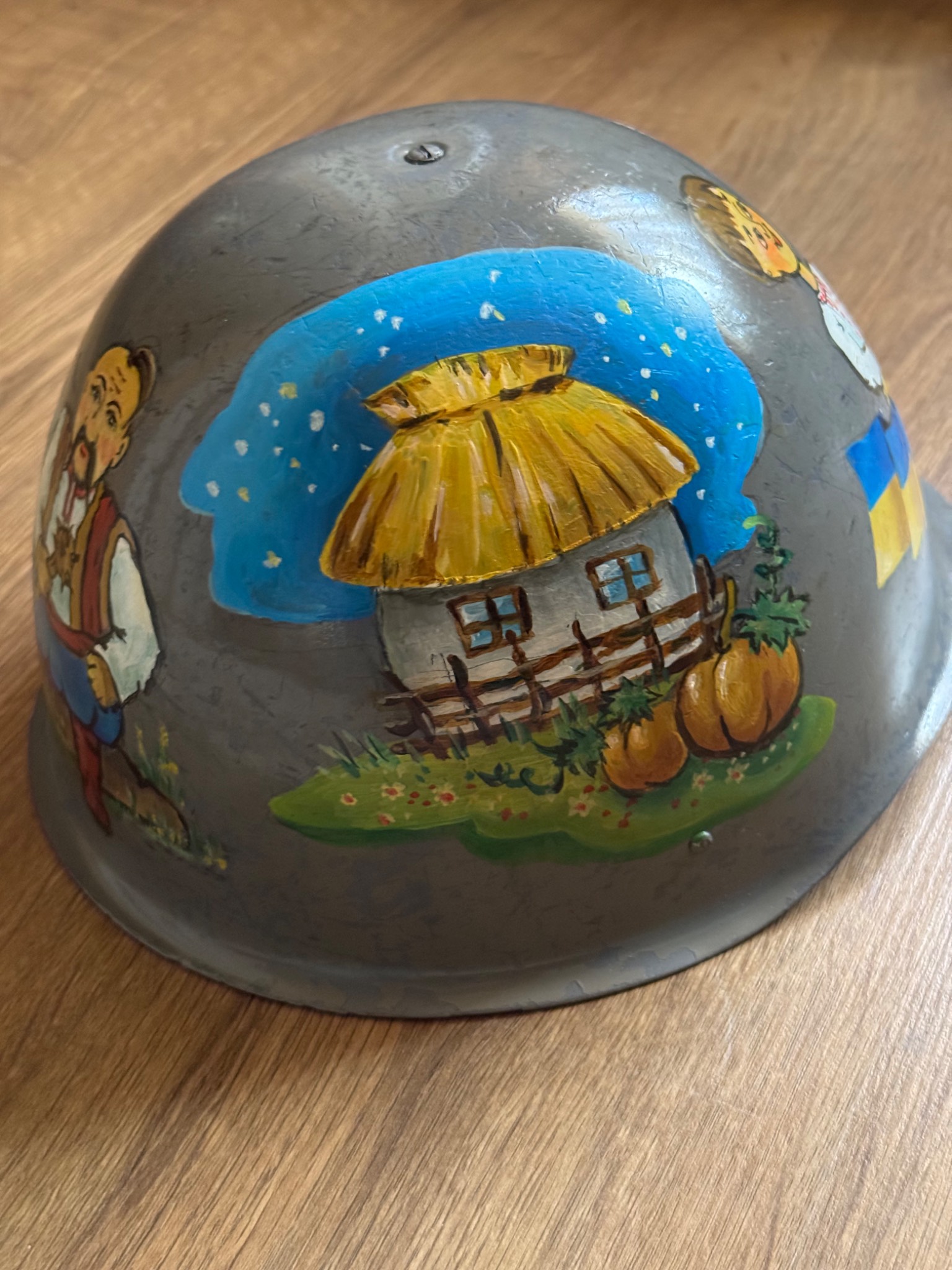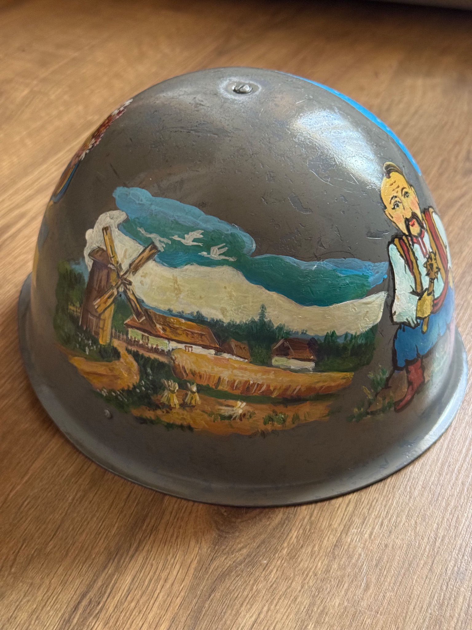 Каска згідно з інформації витягнутої з інтернету, більш за все, що Польського походження. Малюнок ручної роботи, виконаний акриловими фарбами та в критий лаком. Кошти підуть на підтримку наших підрозділів на Запорізькому напрямку.
