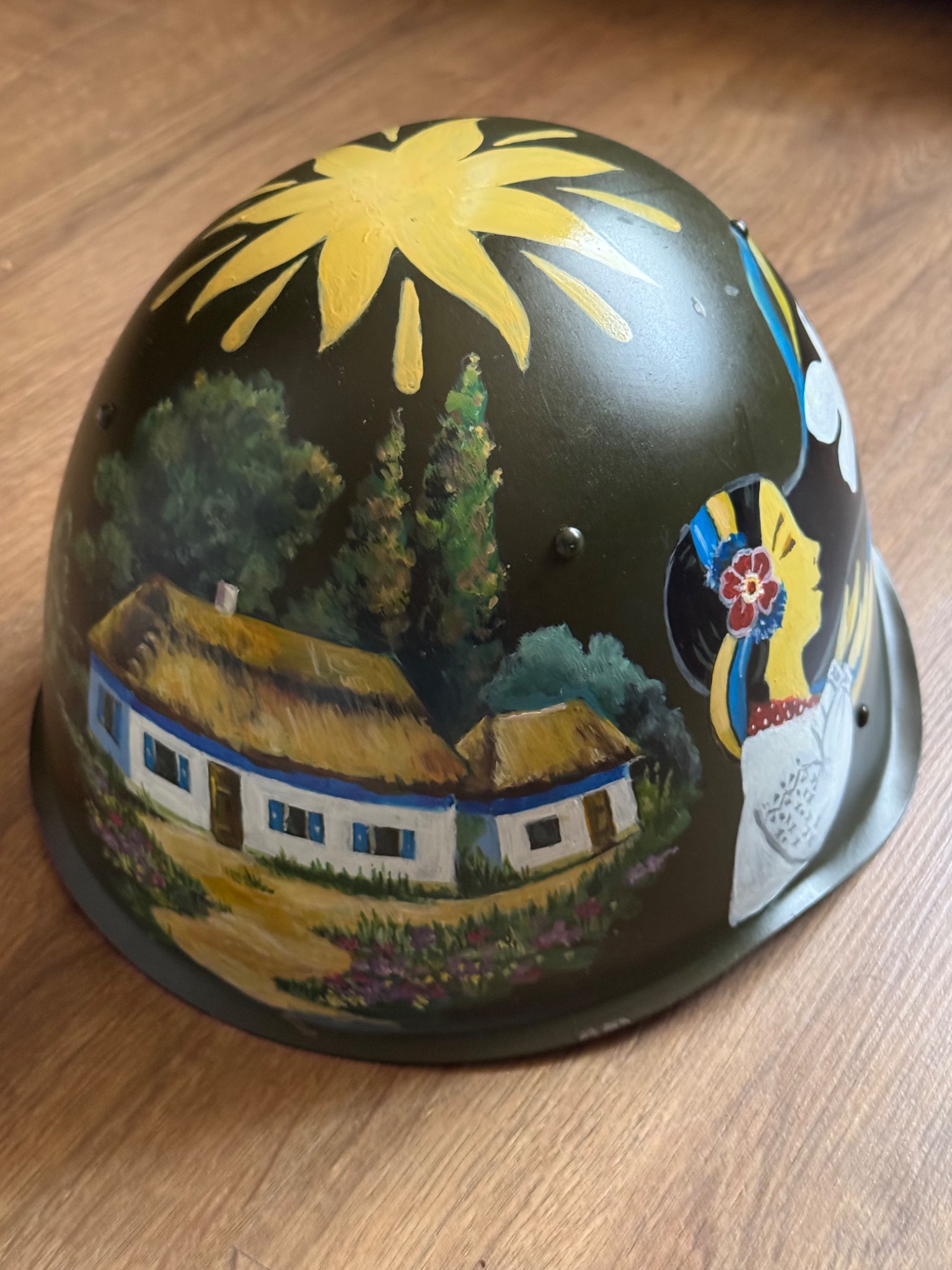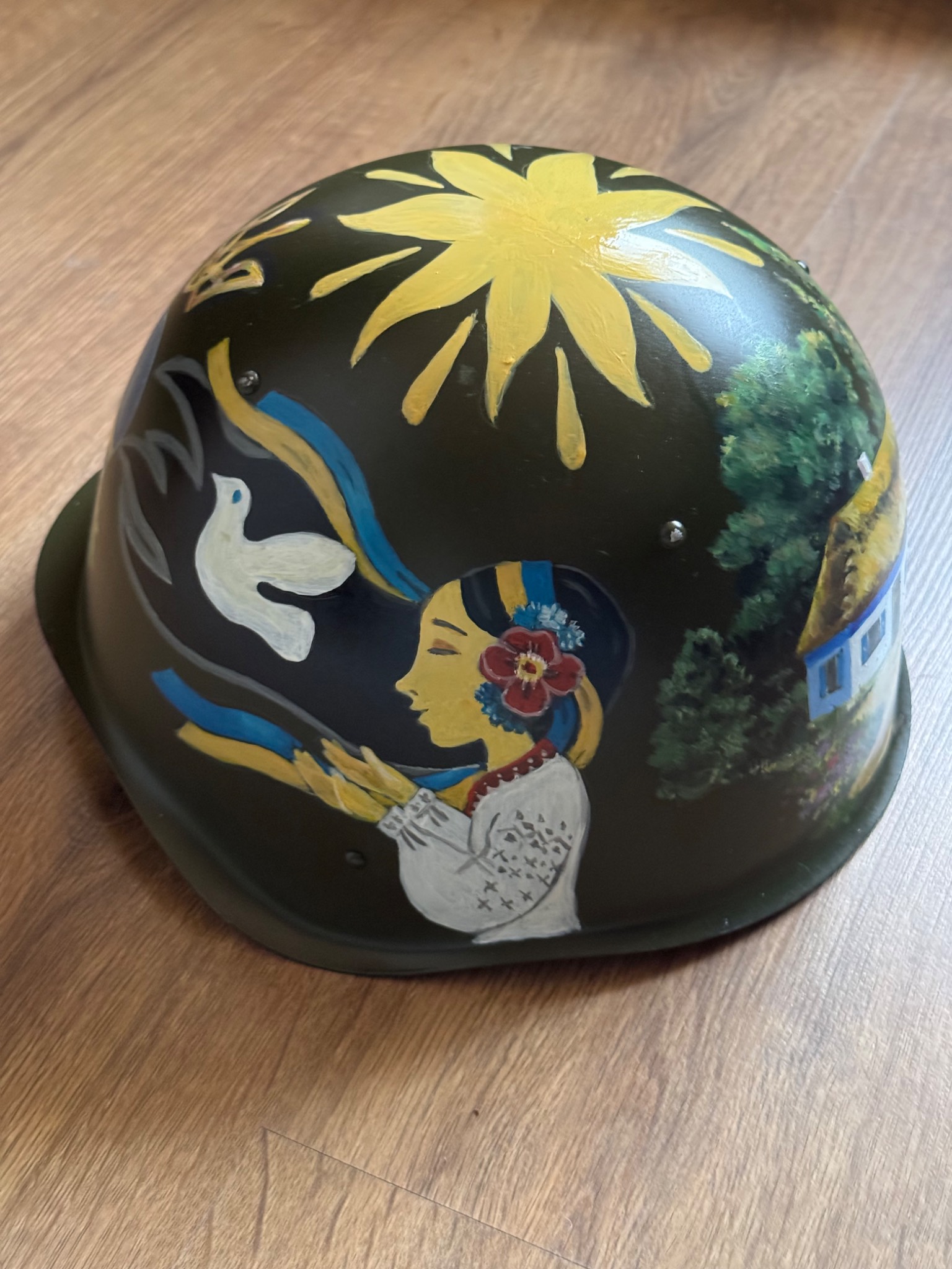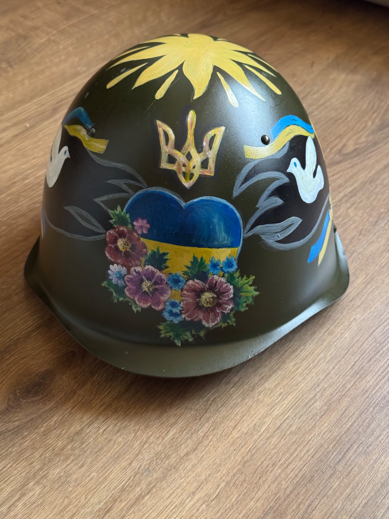 Каска розпис виконано акриловими фарбами, ручної роботи, вкритий захисним лаком. Всі кошти підуть на підтримку наших підрозділів на Запорізькому напрямку.