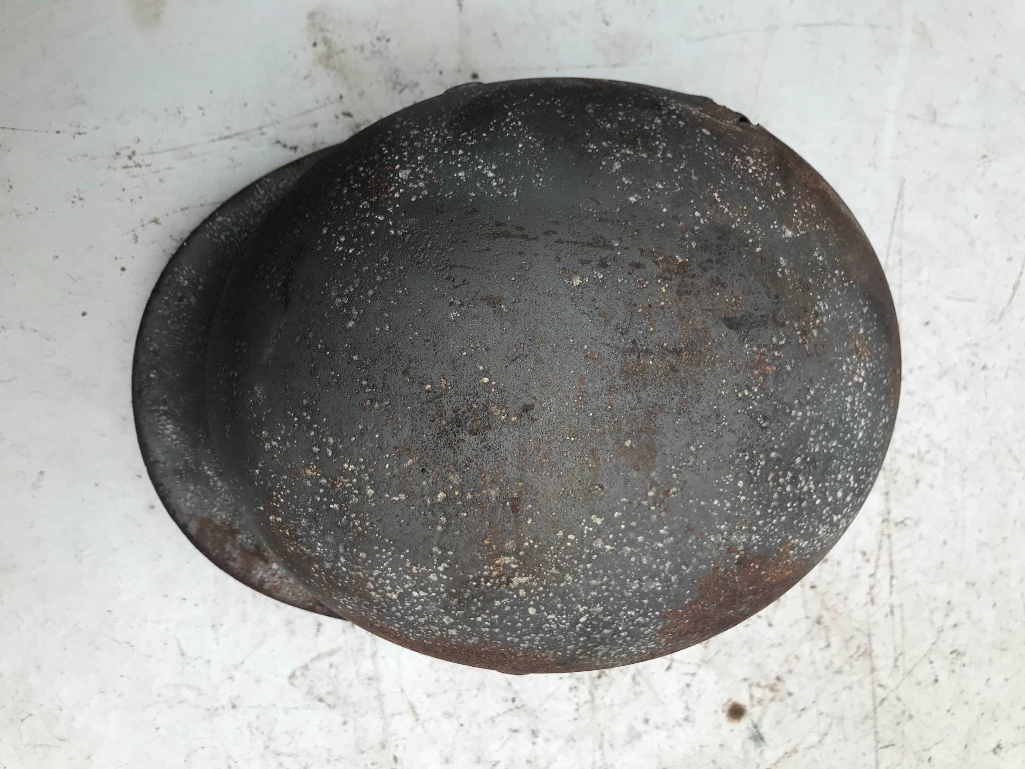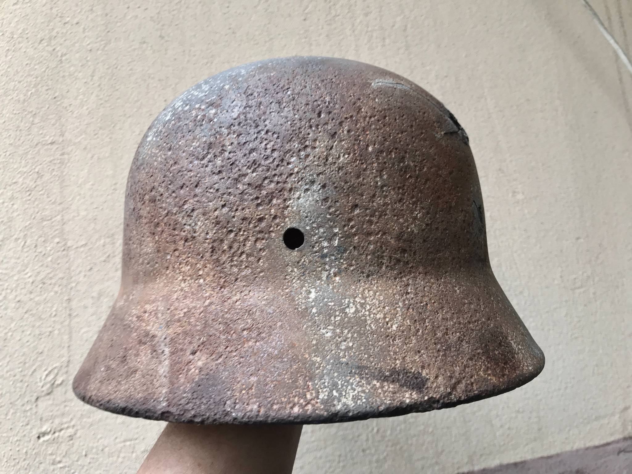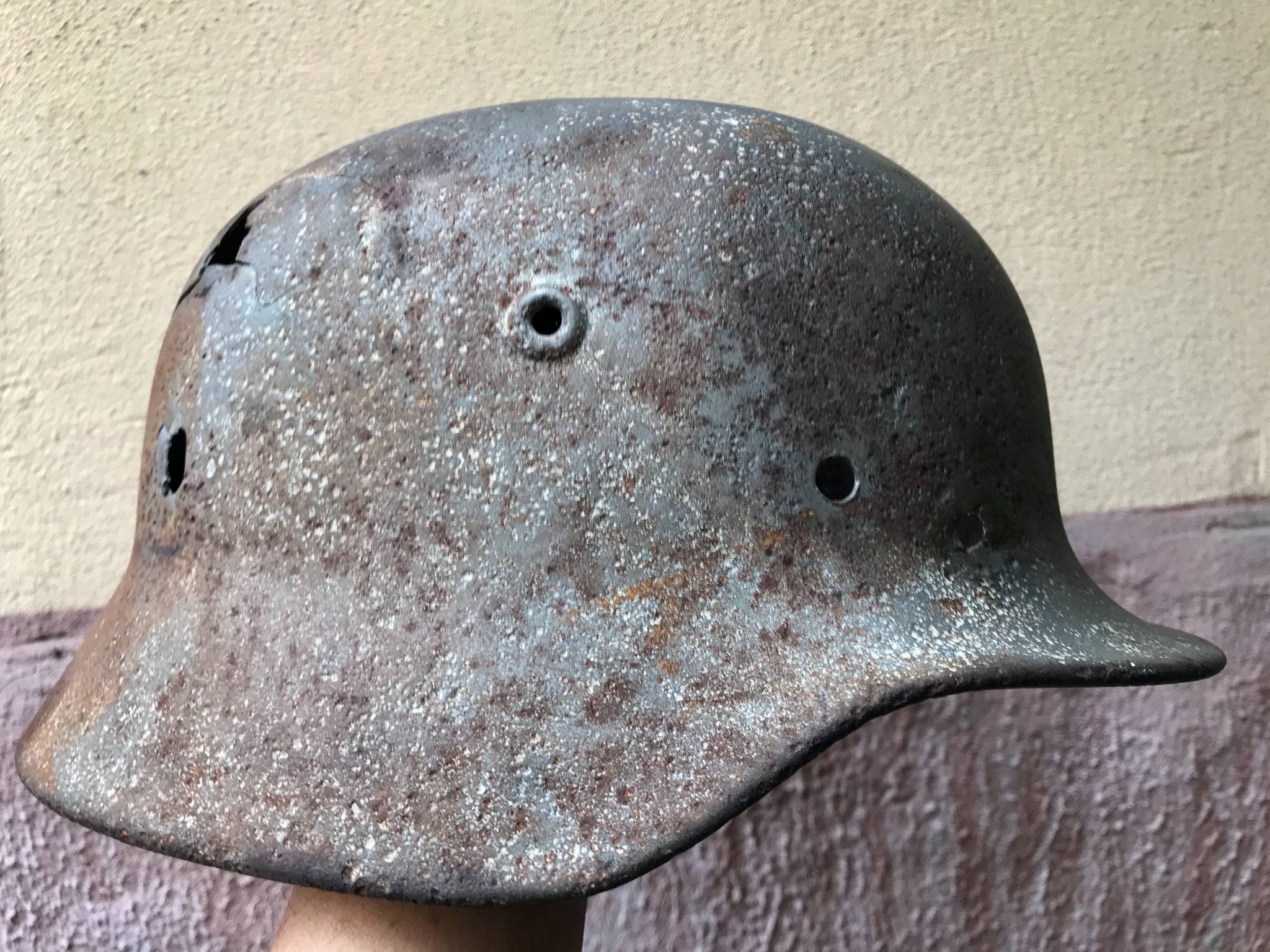 Каска тяжелая, крепкая, свищей нет.Со слов бывшего хозяина много лет пролежала на полке в сарае, но иногда на нее протекала вода поэтому есть потеки.Я никакой реставрации не проводил продаю как есть.