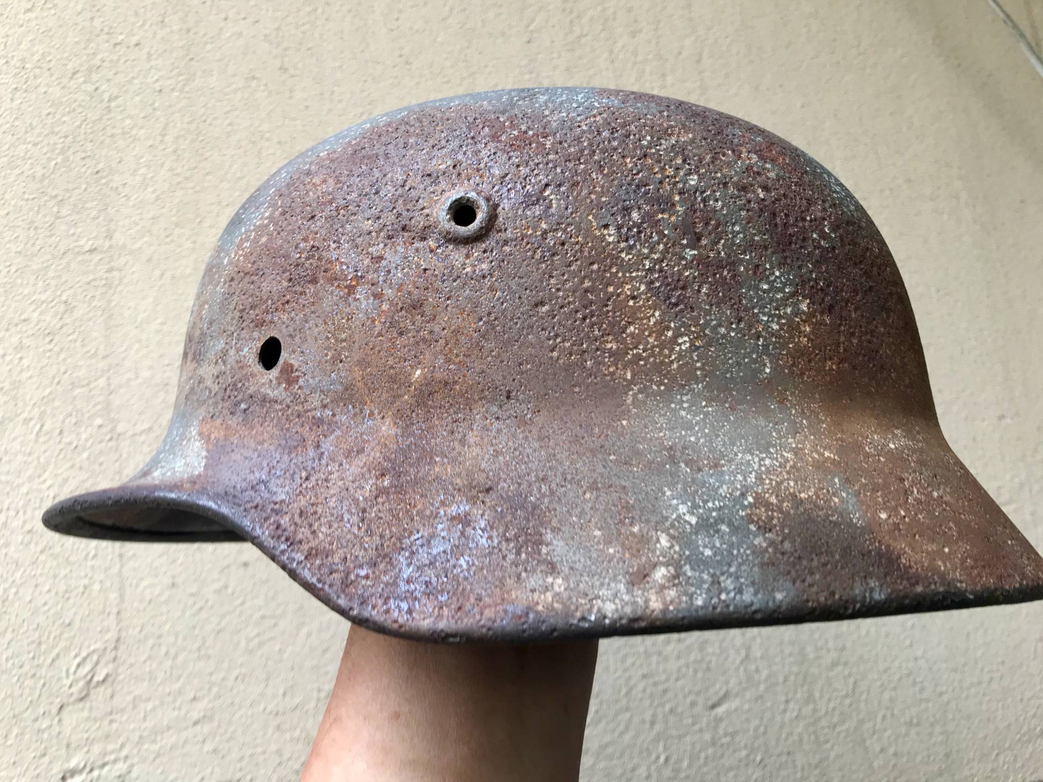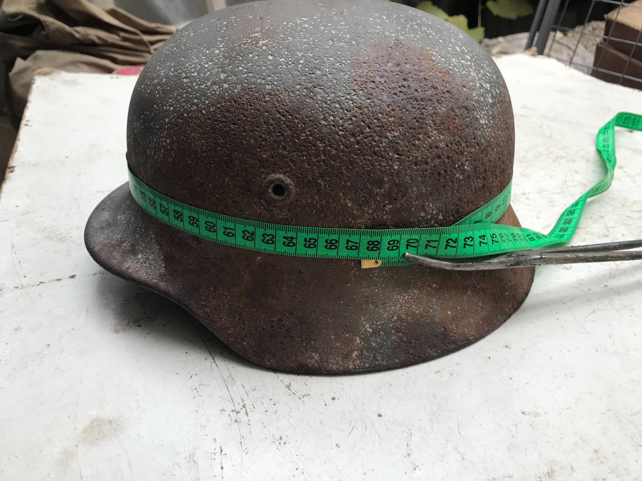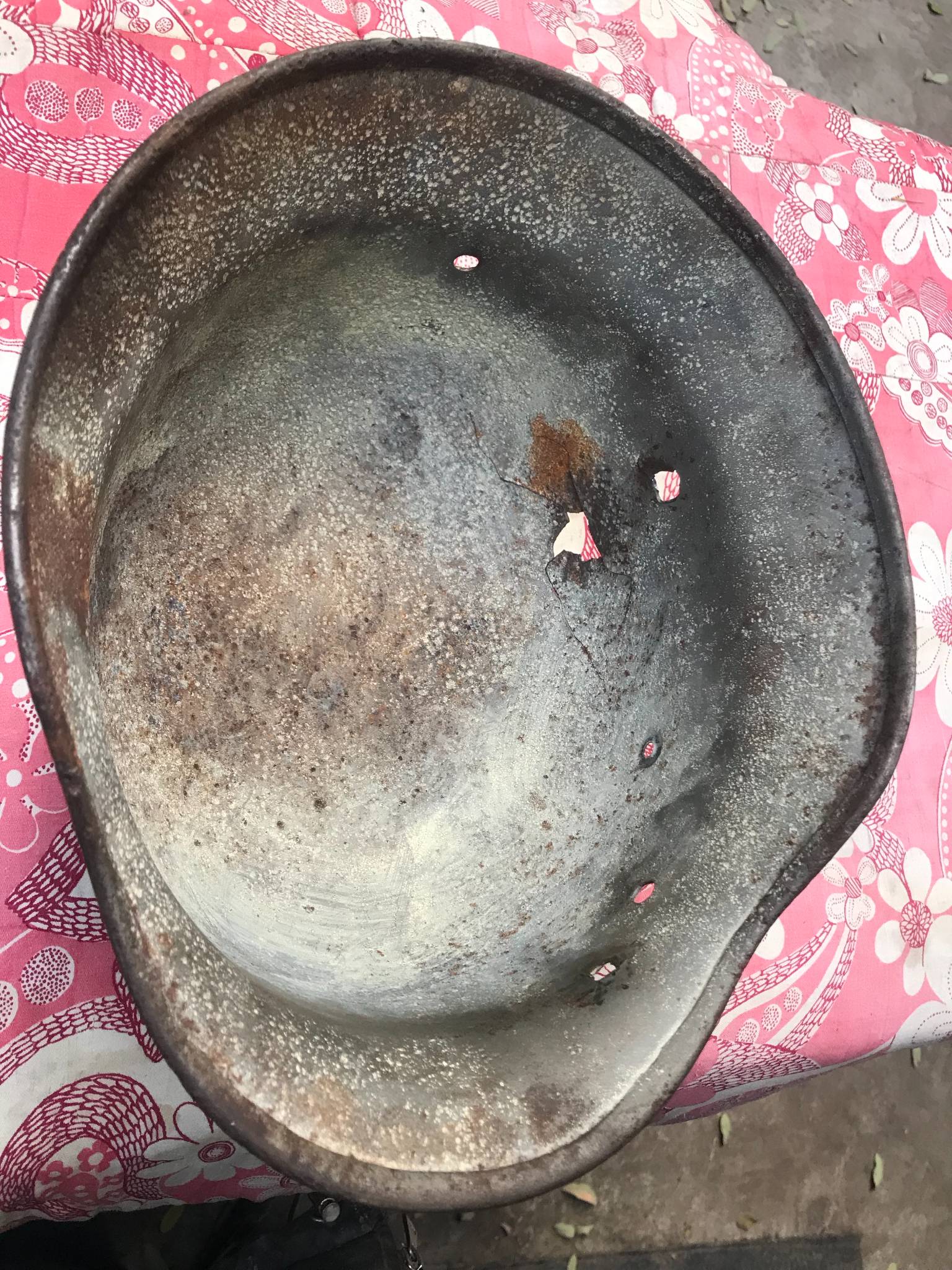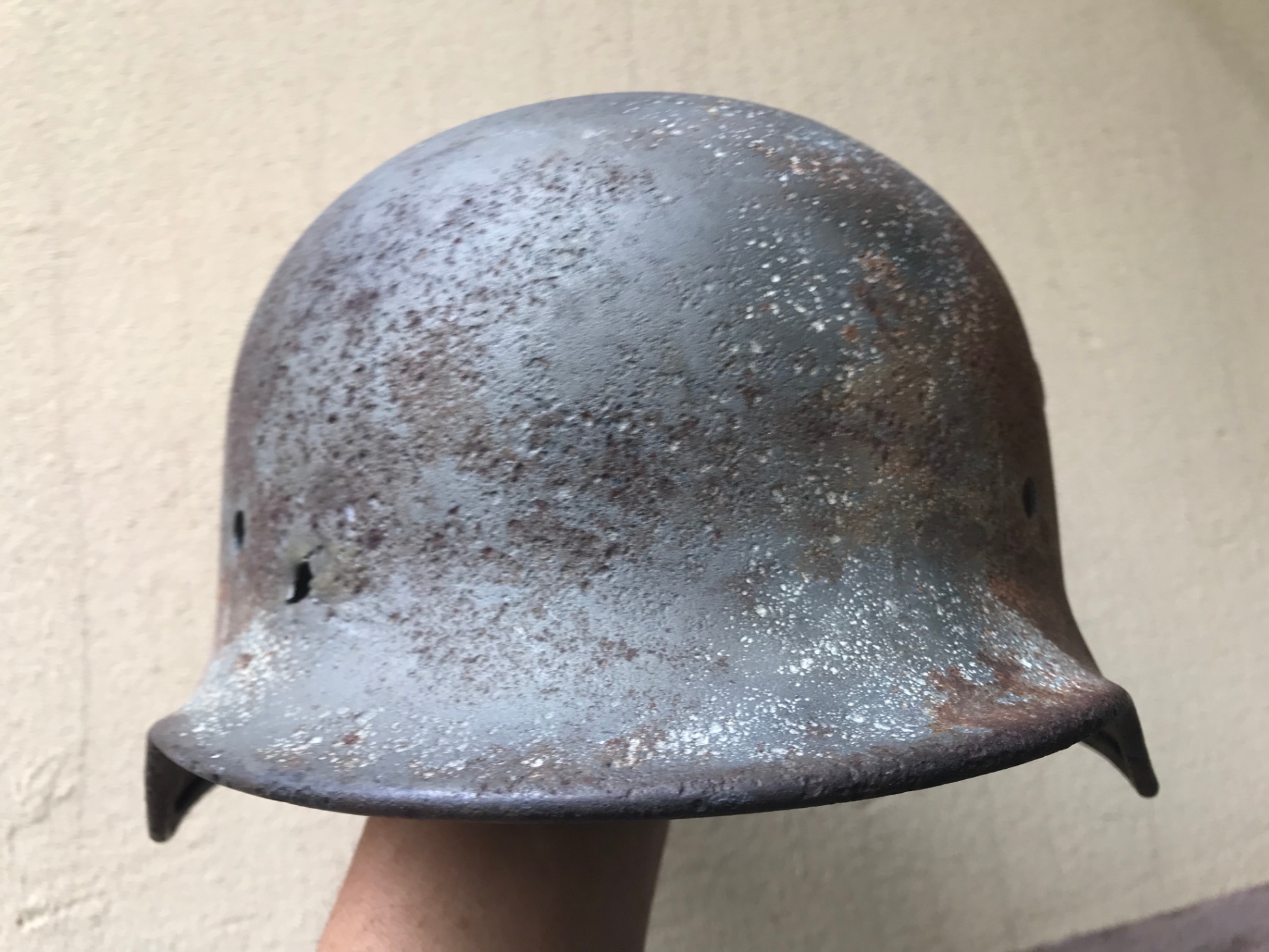 Каска тяжелая, крепкая, свищей нет.Со слов бывшего хозяина много лет пролежала на полке в сарае, но иногда на нее протекала вода поэтому есть потеки.Я никакой реставрации не проводил продаю как есть.
