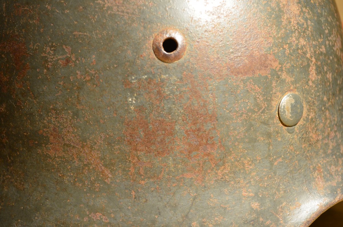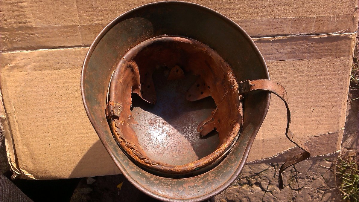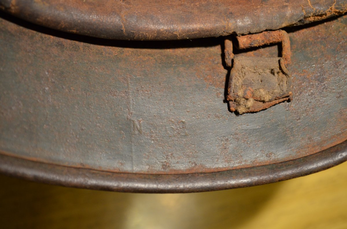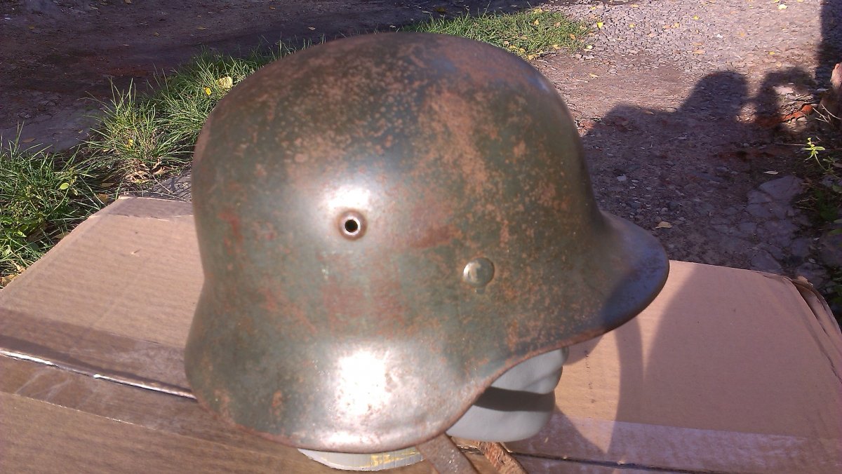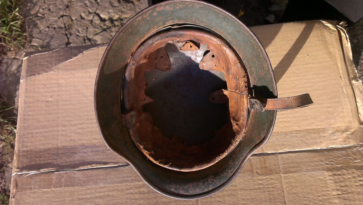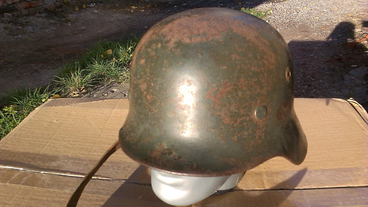 Каска чердачного хранения , в земле не была , подшлёмник родной не разбирался , немного погрызли мыши , подпись владельца , деколь содрали но она находится с правой стороны , что наталкивает на мысль принадлежности к СС , но это мои предположения , каждый может считать как хочет , размер 62 , но для коллекции роли не играет .