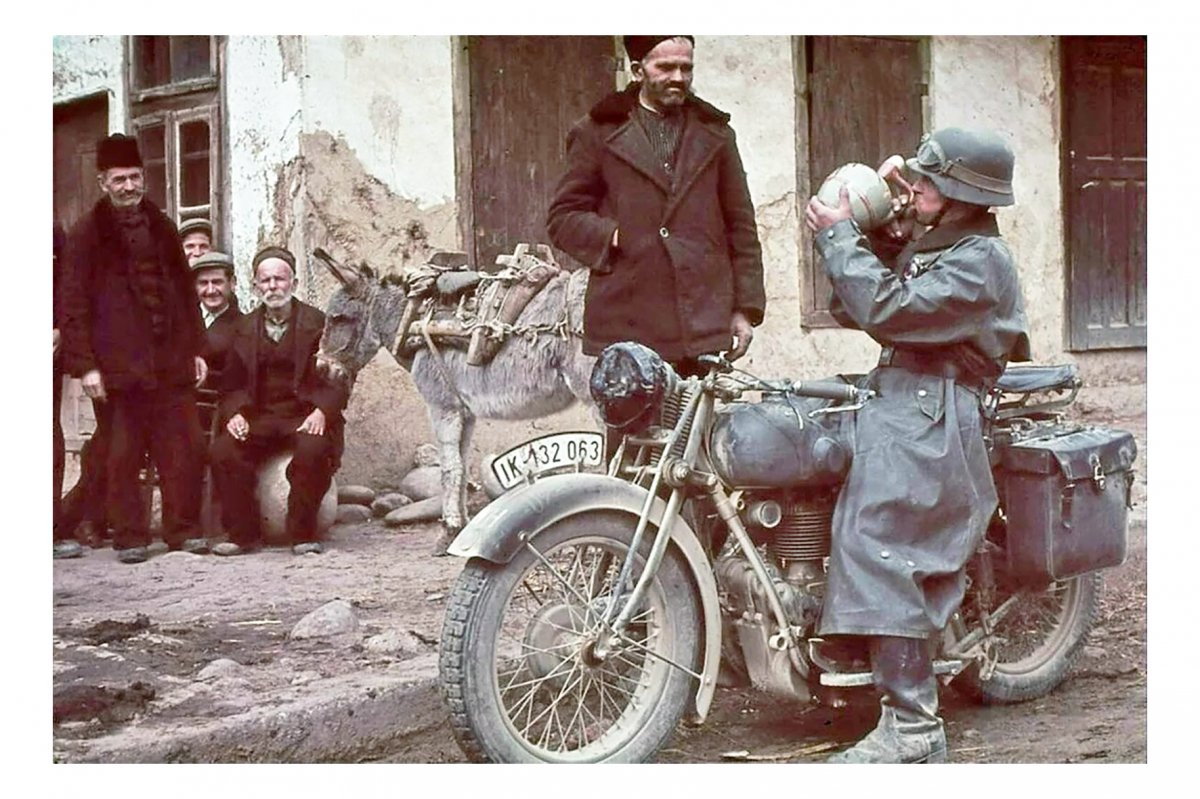 Кавказцы угощают вином из кувшина немецкого мотоциклиста.