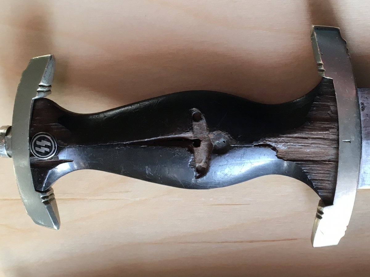 Кинжал SS с родным подвесом , раннее клеймо , мельхиоровые гарды и приборы на ножнах , сам кортик не в идеале , ручка потрескалась и имеет потери , в принципе все погрешности постарался показать на фото . Таблетка копия .