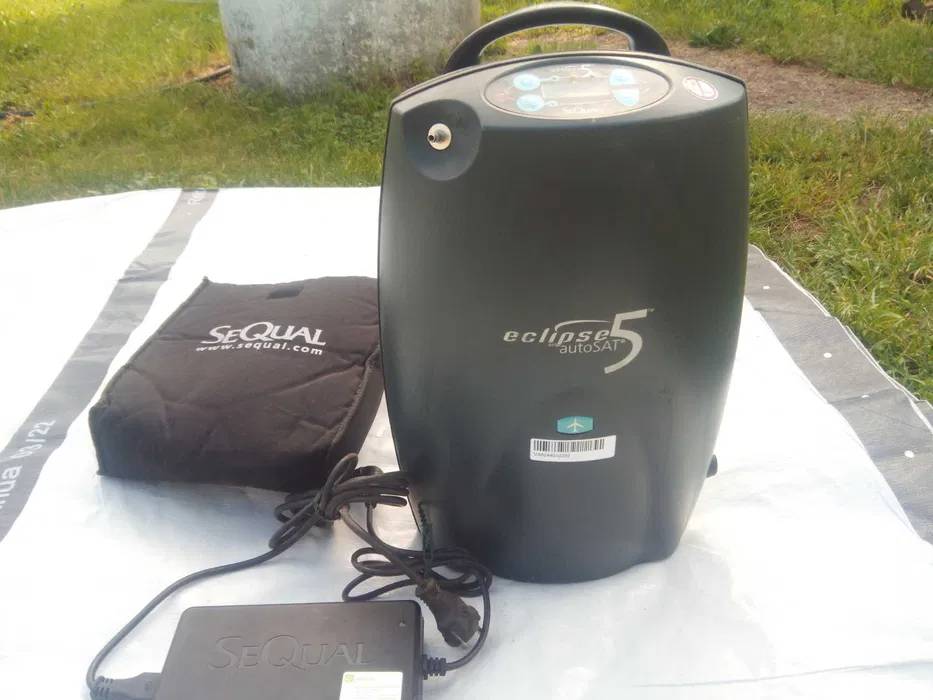 Кисневий концентратор Eclipse 5 - найміцніший і надійніший концентратор для будинку, а також активних подорожей. Прилад працює як в режимі Pulse так і режимі Flow. Прилад поставляється з транспортним візком. Його вага складає всього 6,8 кг(з батареєю). Цей концентратор призначений для цілодобової корекції і підтримки необхідної кількості кисню в крові(сатурация) людини для людей з рівнем сатурации на рівні 88-98%. Рекомендований для використання без обмежень по частоті дихання. Прилад поставляється зі вбудованою батареєю, яка дає можливість автономного використання від 2 до 5,2 годин. Універсальний мережевий адаптер дозволяє підтримувати роботу концентратора 24/7, а також перезаряджати акумуляторні батареї. Панель управління має декілька вигляду індикацій і сигналізації, що дозволяє бути упевненим в його коректній роботі: втрата живлення, низький заряд батареї, низька концентрація кисню, низький терапевтичний ефект, від'єднання канюлі Прилад оснащений унікальним голосовим інтерфейсом, який повідомляє користувача об зміни потоку кисню, стані батареї і системи в цілому. Як і в усіх продуктах компанії SeQual, в Eclipse 5 застосовується технологія autoSAT, яка підлаштовує прилад під частоту дихання людини. SeQual Eclipse 5 схвалений Федеральною Авіаційною Адміністрацій(FFA США) і може бути використаний на авіаційному транспорті. (ВІДСУТНІЙ ВІЗОК)