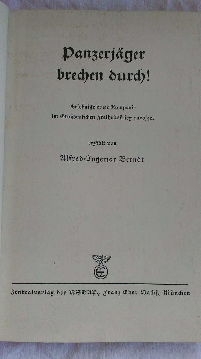 Книга "Истребители танков прорываются!",издательство НСДАП,1942г.,Мюнхен.Опыт военных компаний вермахта за 1939/40гг.Размер 22,5*15,5см,твердая политурка,255стр.,только текст+карта-схема.Имеется печать и надпись того периода.