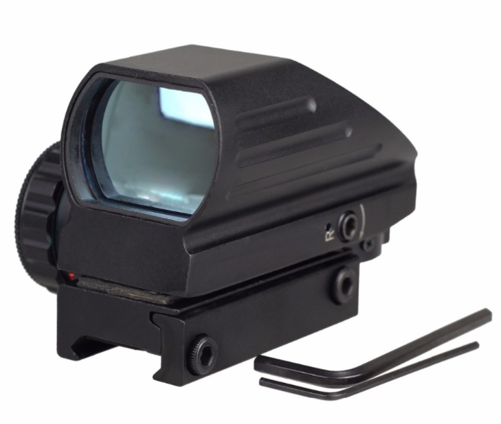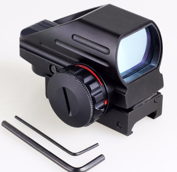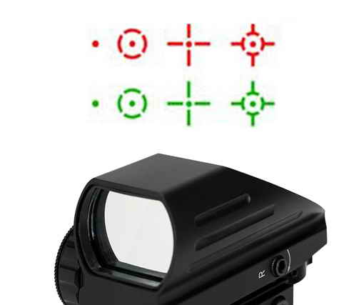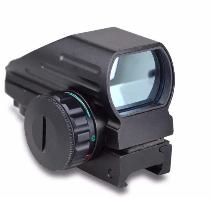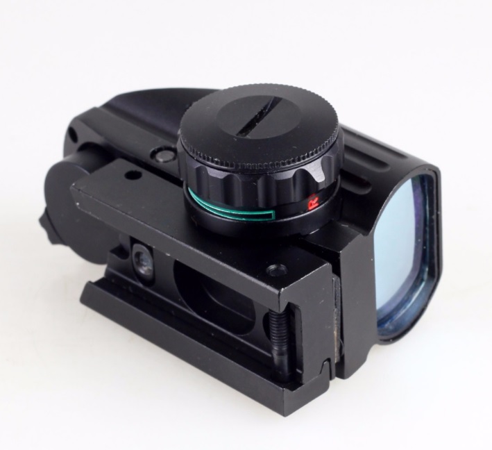 Коллиматорный компактный прицел.Четыре типа прицельной марки в красном или зеленом цвете. Выбор типа и цвета прицельной марки производится переключателями.Также регулируется яркость марки. Марка-точка немного размыта.Питание от батарейки(таблетка)типа CR2032. Изготовлен из авиационного алюминия.