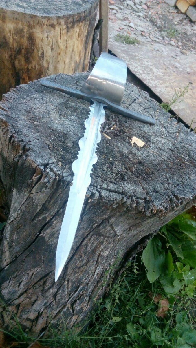 Клинок двулезвийный, полирован. Закалка - масло, отпуск - вода. При прямом ударе(без подворота) может пробить 1,5 мм стальной лист.