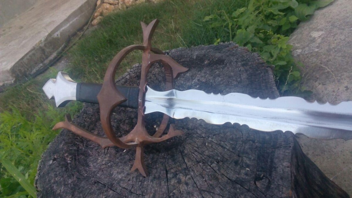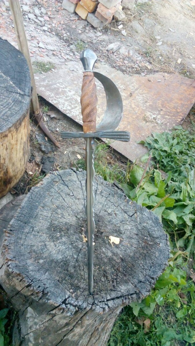 Эфес сварной, выполнен в "растительных" мотивах(гарда - ветка дерева, навершие - стилизованная лилия). Состоит из 2 квилонов, 2 колец, фигурной дужки и 2 ловушек для клинка.