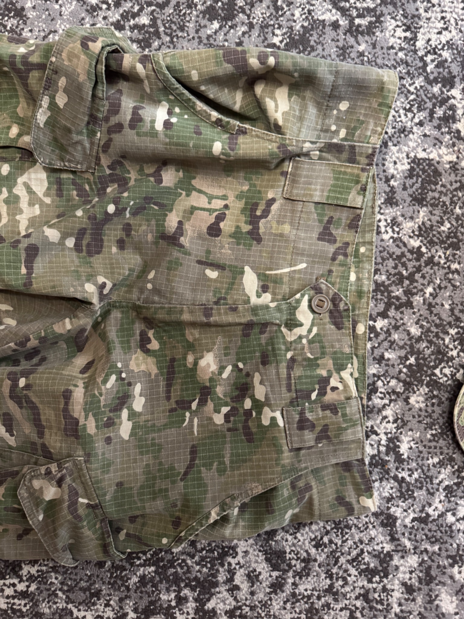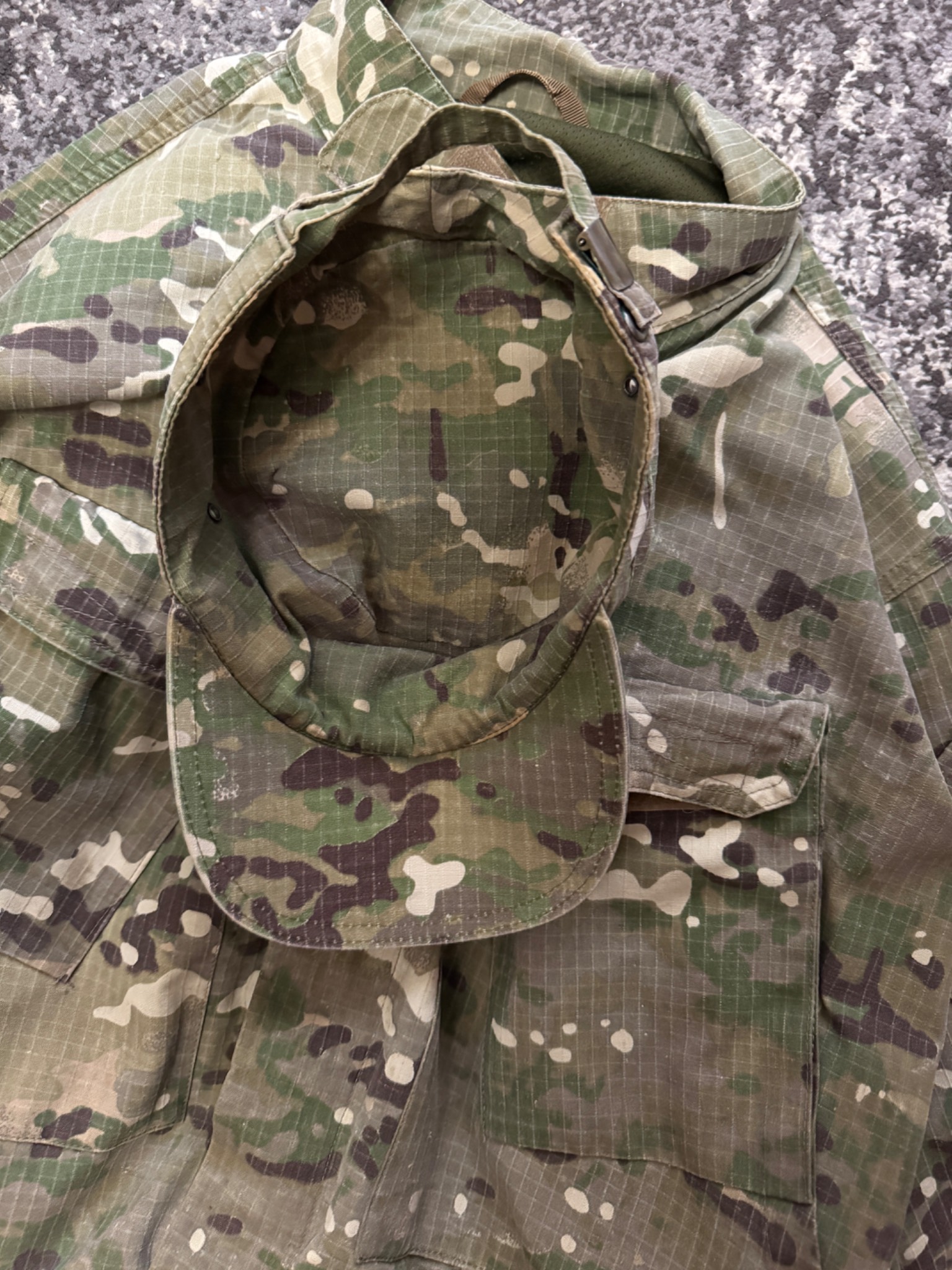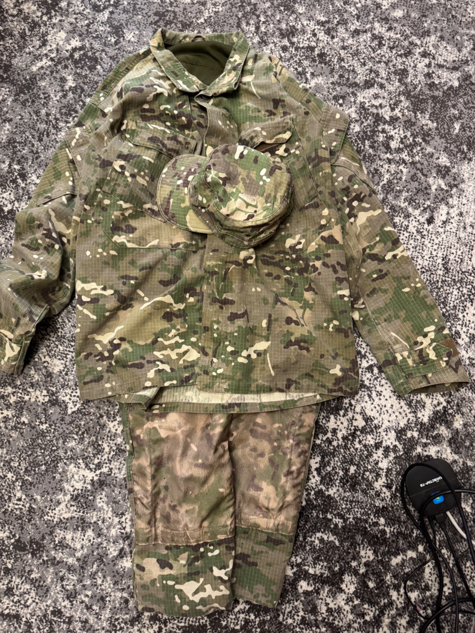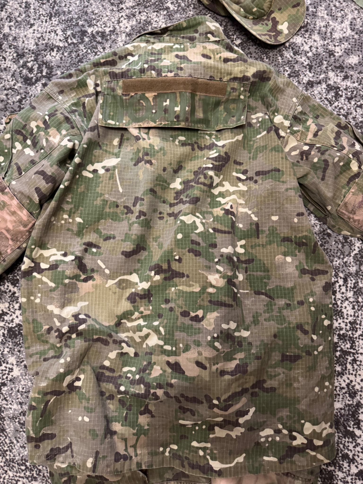 Комплект в мультикамі. Кітель, штани та кепі. Виробник Україна. Тканина ріп-стоп, лікті та коліна посилені кордурою і являють кишені під захист. На спині ховається напис «Поліція» - можна відпороти. Присутні незначні сліди використання. Взагалі комплект добрий із нормальної тканини.