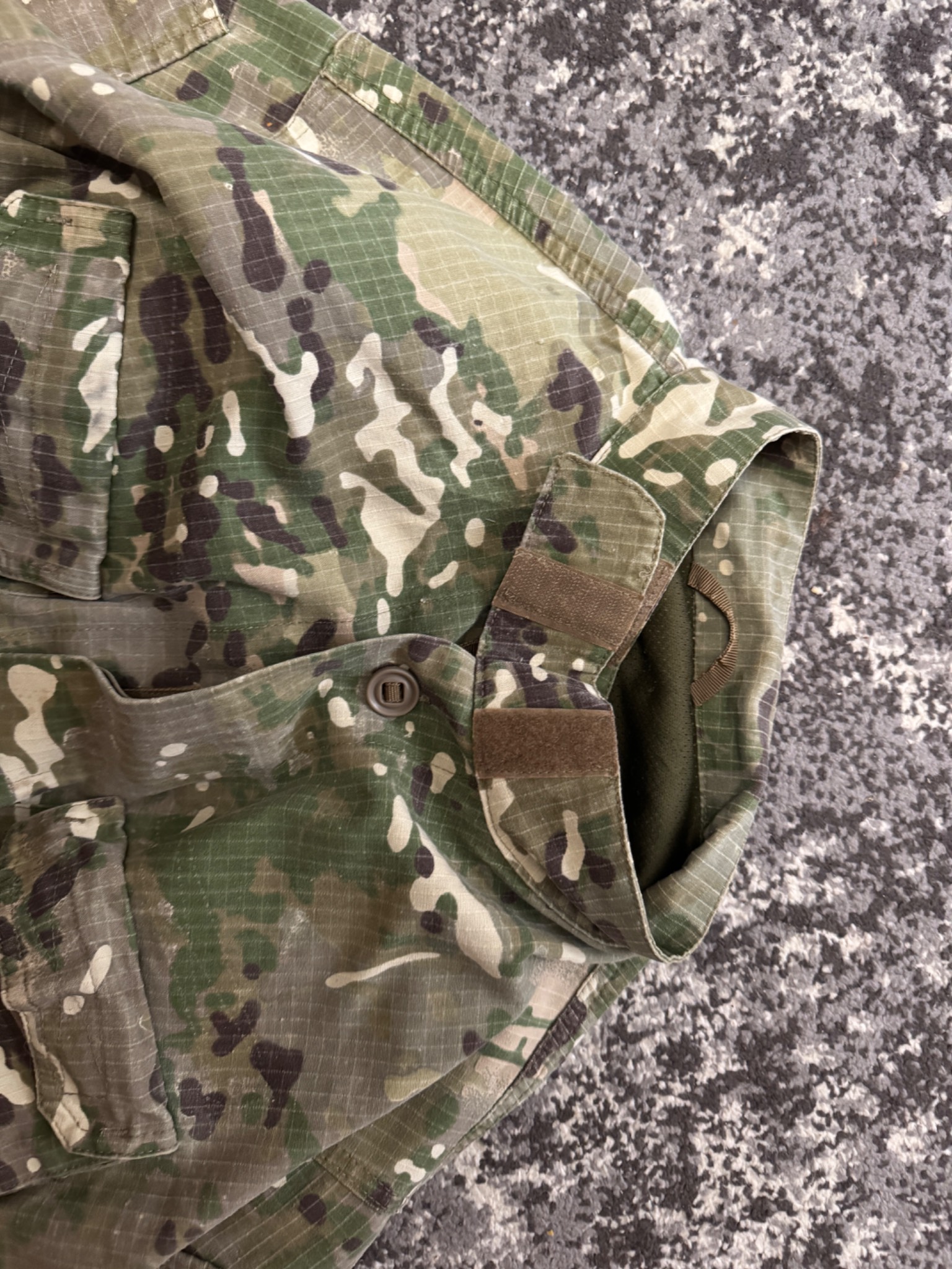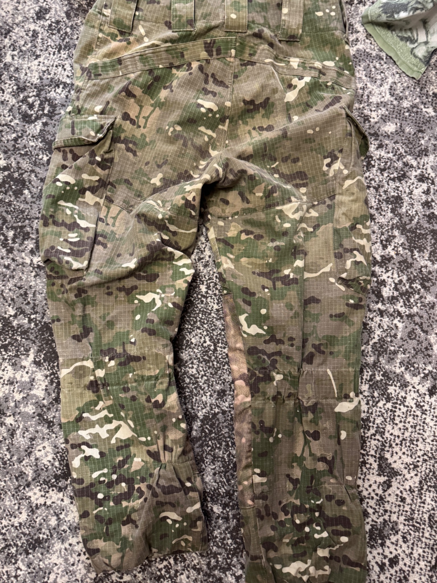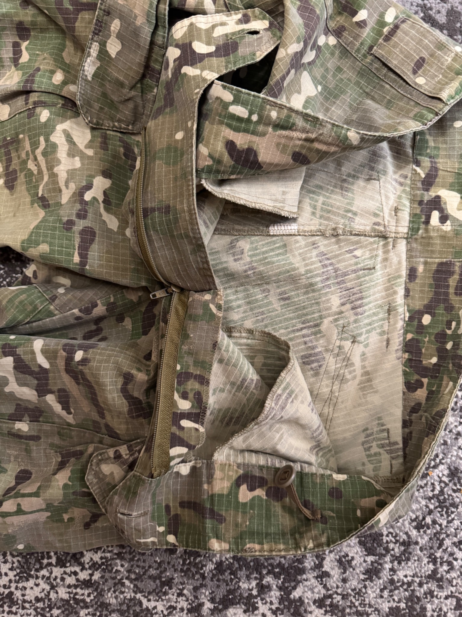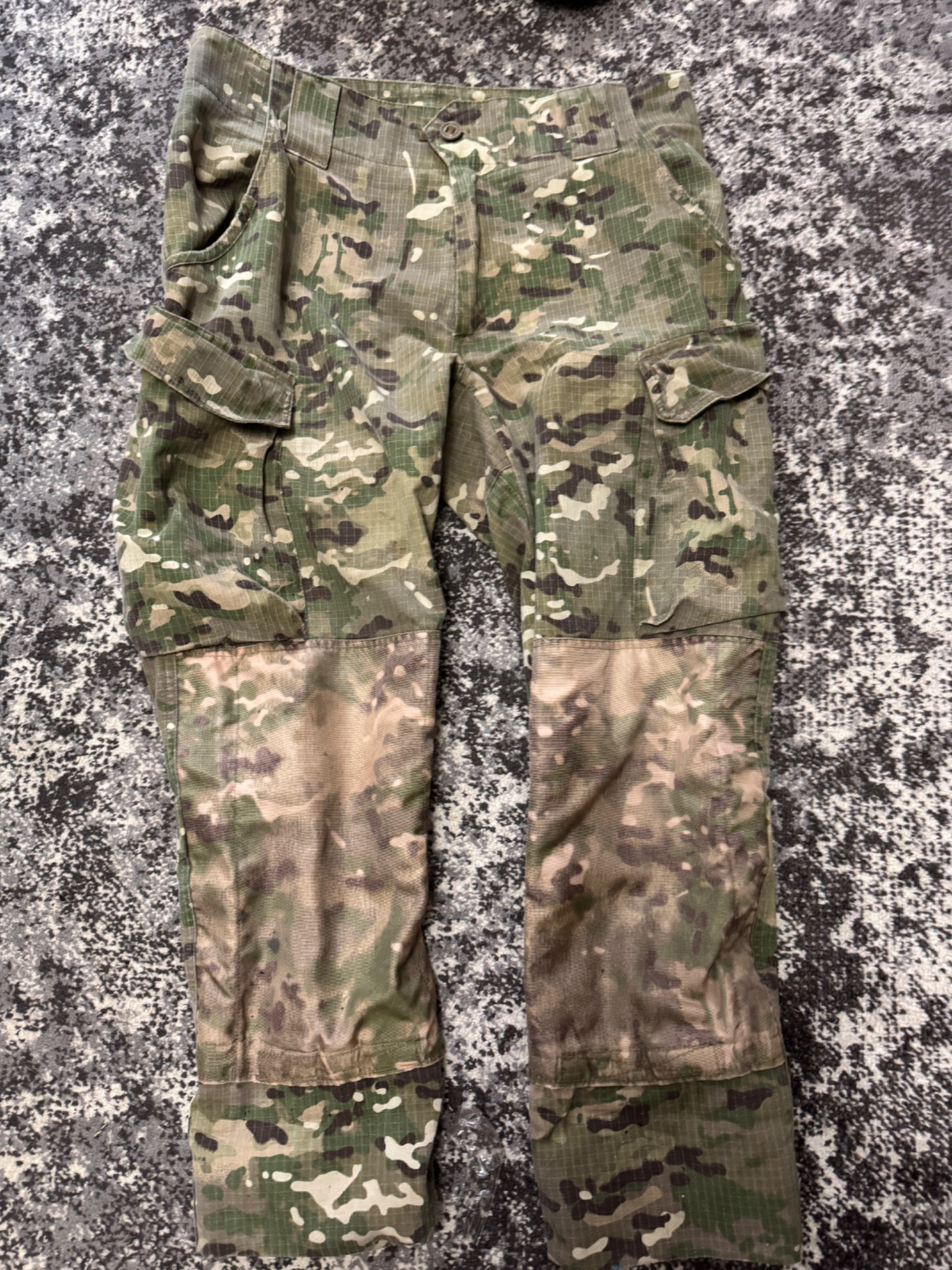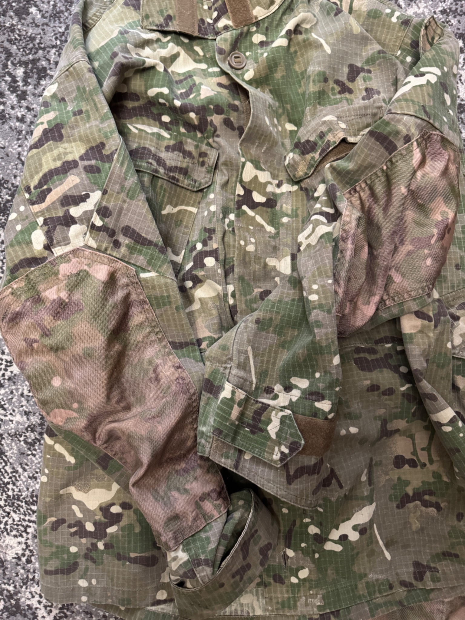 Комплект в мультикамі. Кітель, штани та кепі. Виробник Україна. Тканина ріп-стоп, лікті та коліна посилені кордурою і являють кишені під захист. На спині ховається напис «Поліція» - можна відпороти. Присутні незначні сліди використання. Взагалі комплект добрий із нормальної тканини.