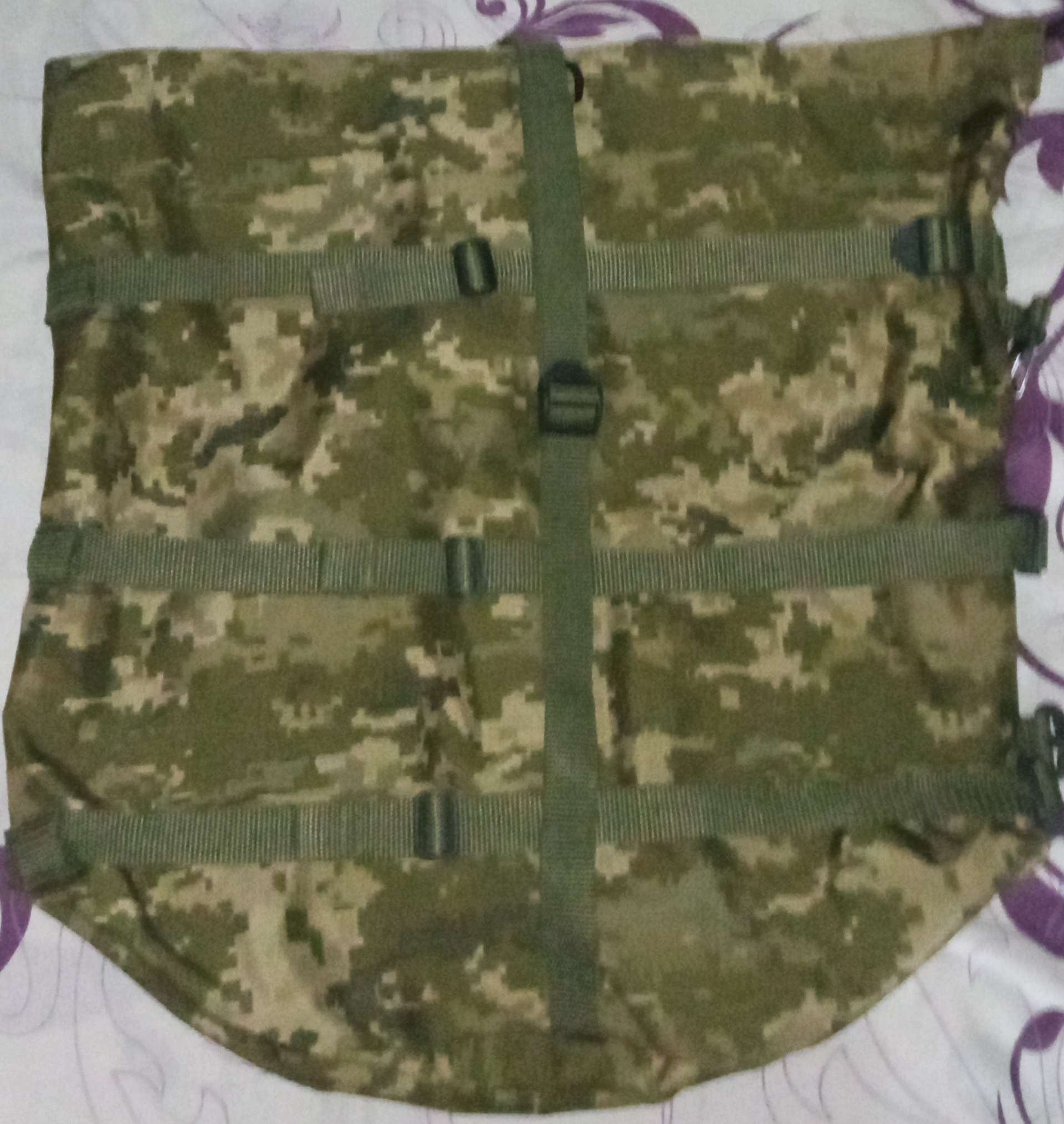 По периметру 3 ременных ленты с регуляторами - затяжками. 2-а повторных карабина для фиксации на рюкзаке, ремне и т.д.