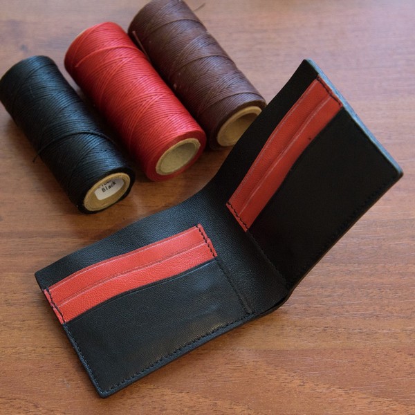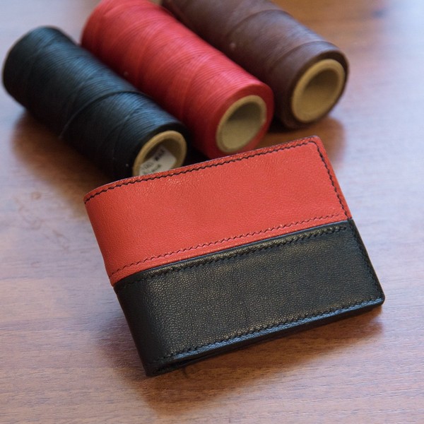 Кожаный кошелек ручной работы. Изготовлен из натуральной итальянской кожи козы черного и красного цветов, прошит вручную вощеной нитью. 1 отделение для купюр, 6 отделений для пластиковых карт. Размер 11.5х8.5 см.