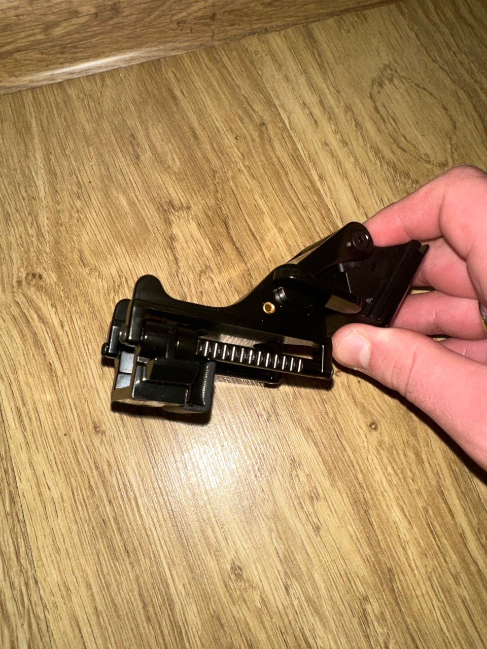 Основні переваги цього кріплення в тому, що воно виконано міцного алюмінієвого сплаву (вага: 150 г.) , при користуванні у вас буде задіяна лише 1 рука – це для підняття та опускання ПНБ на шоломі! Відправка в день оплати, дякую!