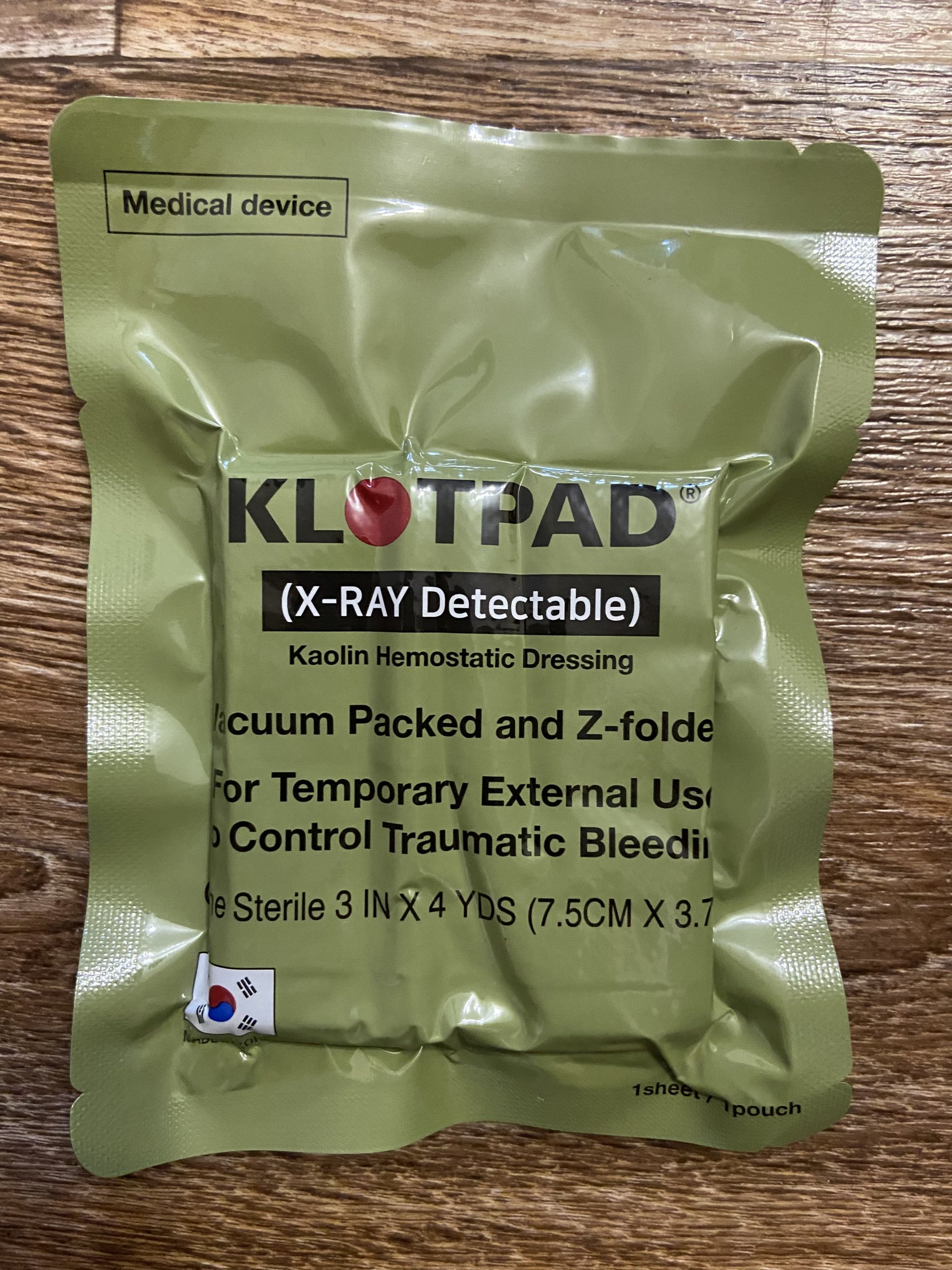 КЛОТПАД — це військова кровоспинна пов’язка високої концентрації на основі каоліну, розміри 7,5 см х 3,7 м. Каолін — це природний неорганічний мінерал, який підтримує природний процес згортання крові в організмі, викликаючи швидкий кровоспильний ефект. Каоліновий компонент, який підтримує гемостатичний процес, не містить шкідливих речовин і є клінічно безпечною речовиною – не викликає лихоманки, алергії, побічних реакцій або реакцій гіперчутливості.