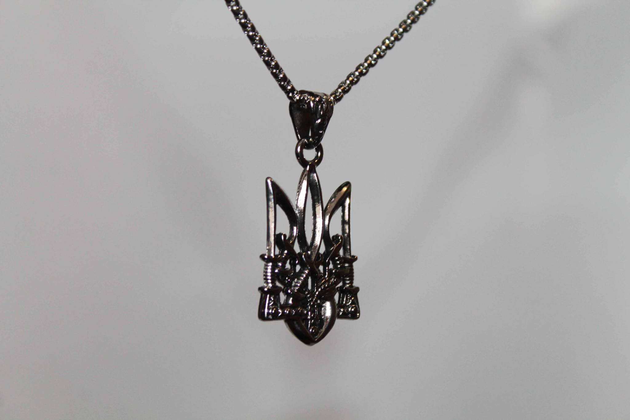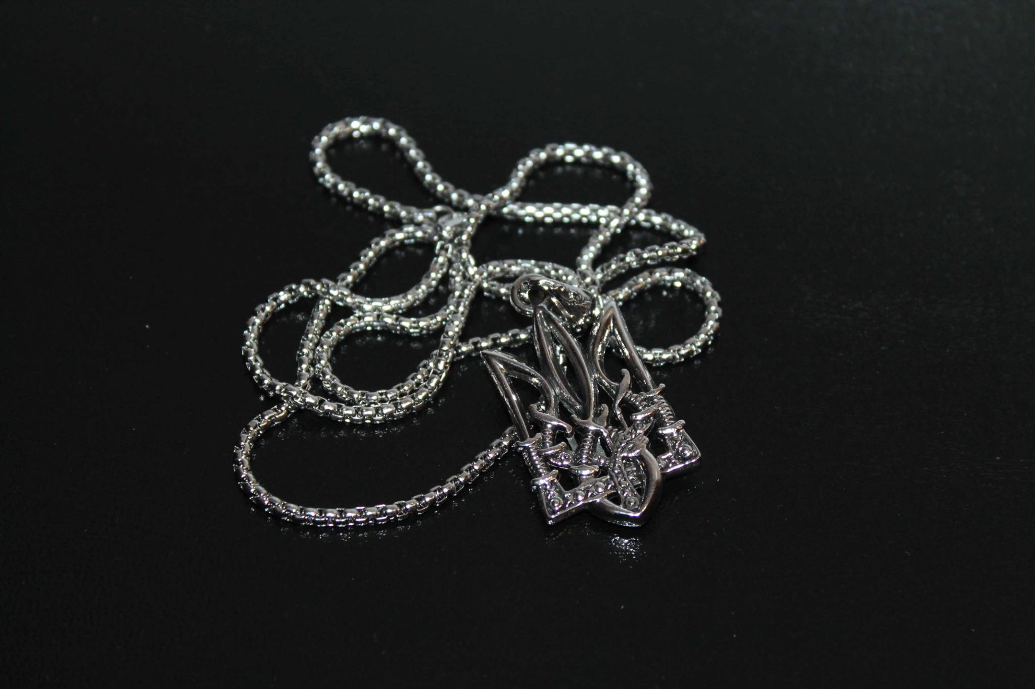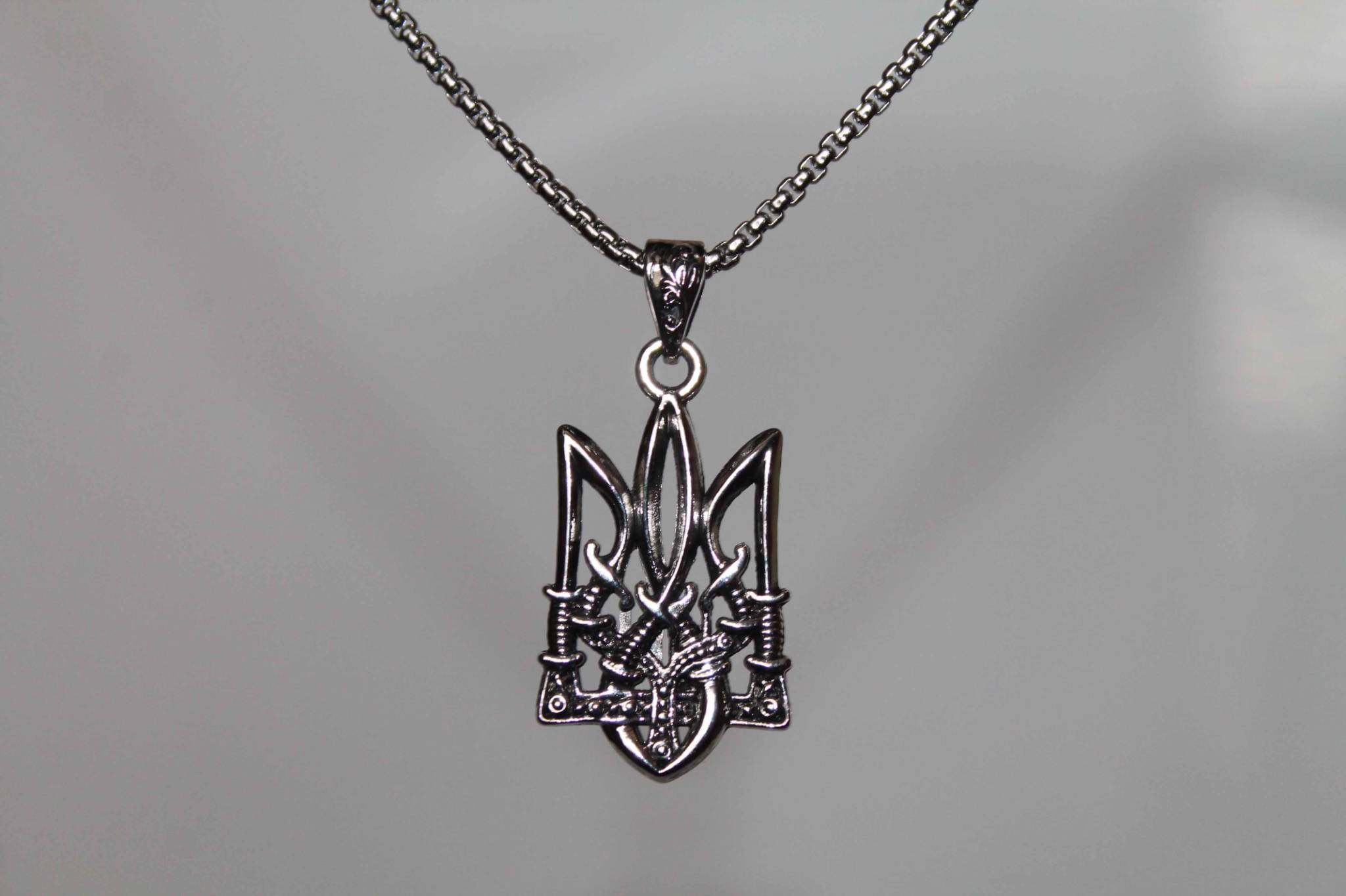 Кулон підвіска тризуб з гербом України та ланцюжком - це стильний аксесуар, який приверне увагу цінителів культури та історії. Орнаменти на гербі виконані у вигляді козацьких переплетених шабель, що надає кулону особливий характер і символізує силу та захист.