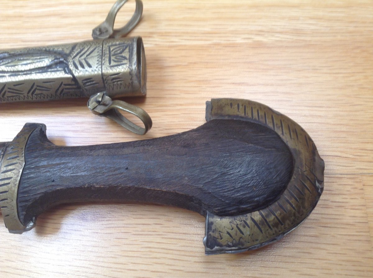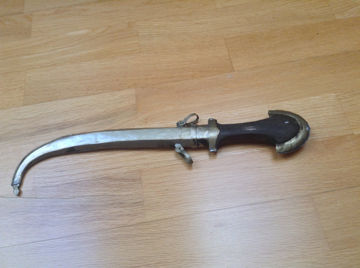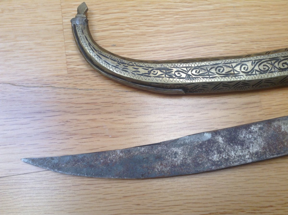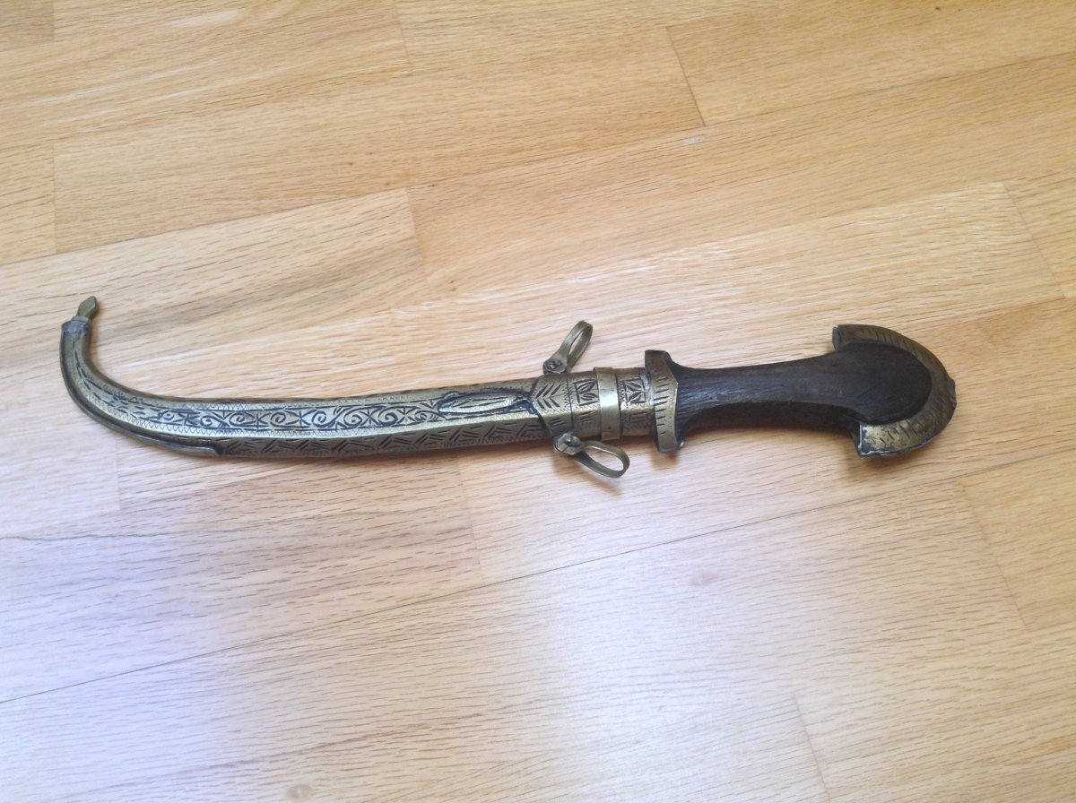 Куммия - этническое холодное оружие Марокко/можно иногда встретить в других странах Магриба/.Разновидность арабской джамбии. Главная отличительная черта - так называемый павлиний хвост на навершии рукояти. Атрибут повседневного ношения у мужчин. Служит так же показателем статуса хозяина кинжала. Можно встретить экземпляры которые передавались из поколения в поколение. Примитивное изготовление добавляет шарм этому прекрасному предмету. Имеются следы ржавчины на клинке - всё на фото