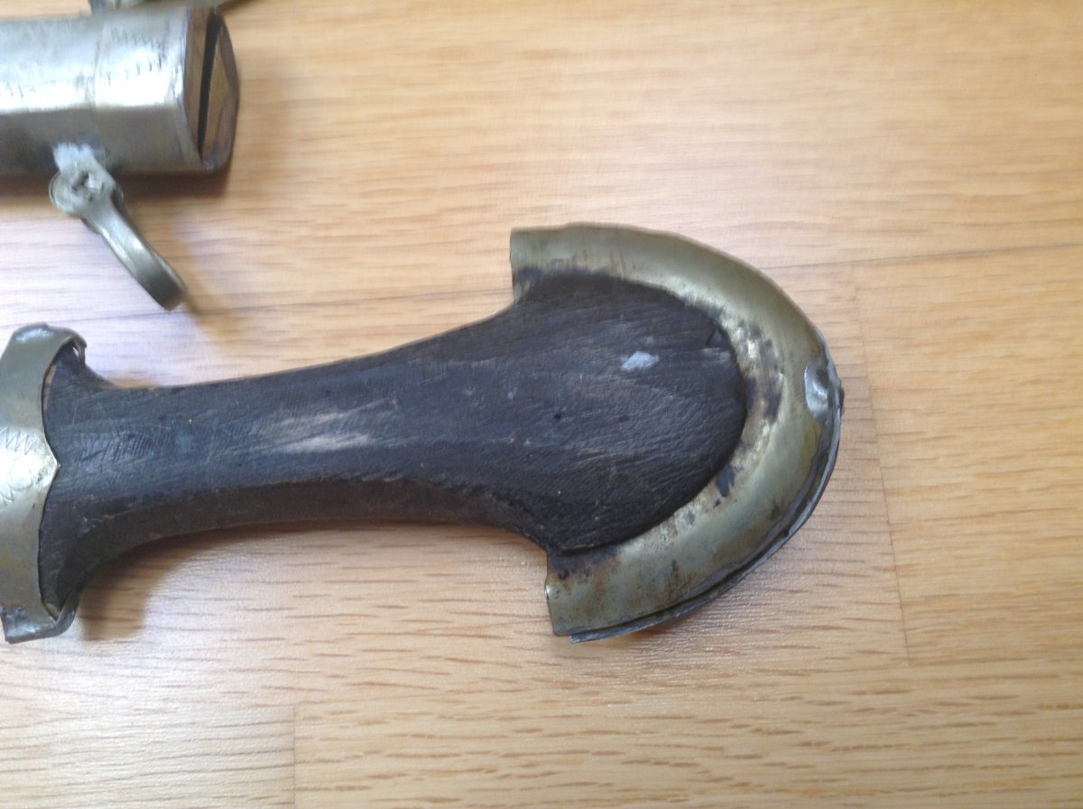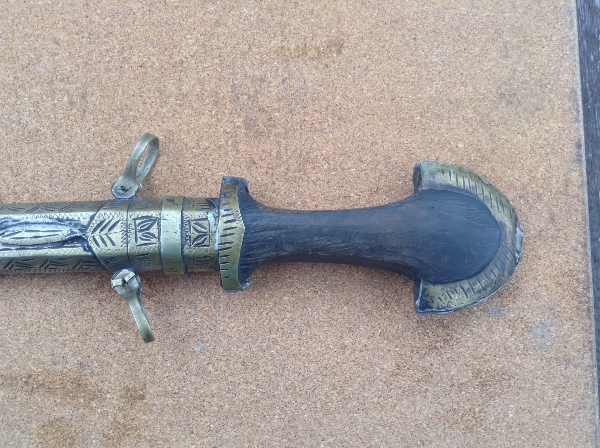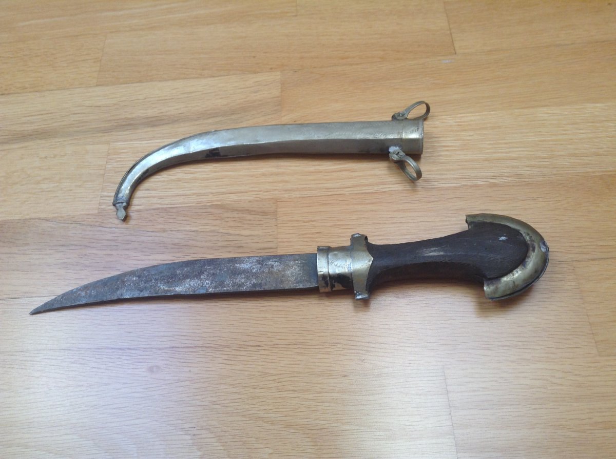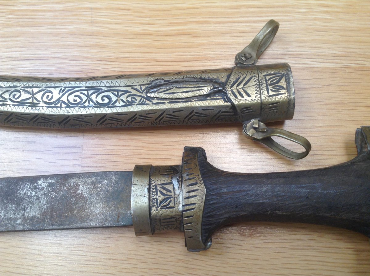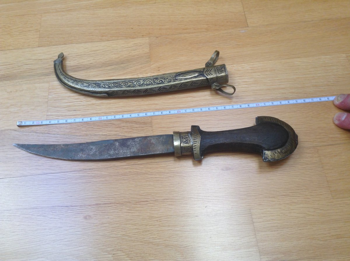 Куммия - этническое холодное оружие Марокко/можно иногда встретить в других странах Магриба/.Разновидность арабской джамбии. Главная отличительная черта - так называемый павлиний хвост на навершии рукояти. Атрибут повседневного ношения у мужчин. Служит так же показателем статуса хозяина кинжала. Можно встретить экземпляры которые передавались из поколения в поколение. Примитивное изготовление добавляет шарм этому прекрасному предмету. Имеются следы ржавчины на клинке - всё на фото