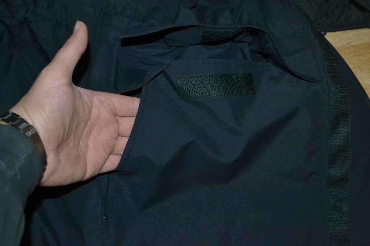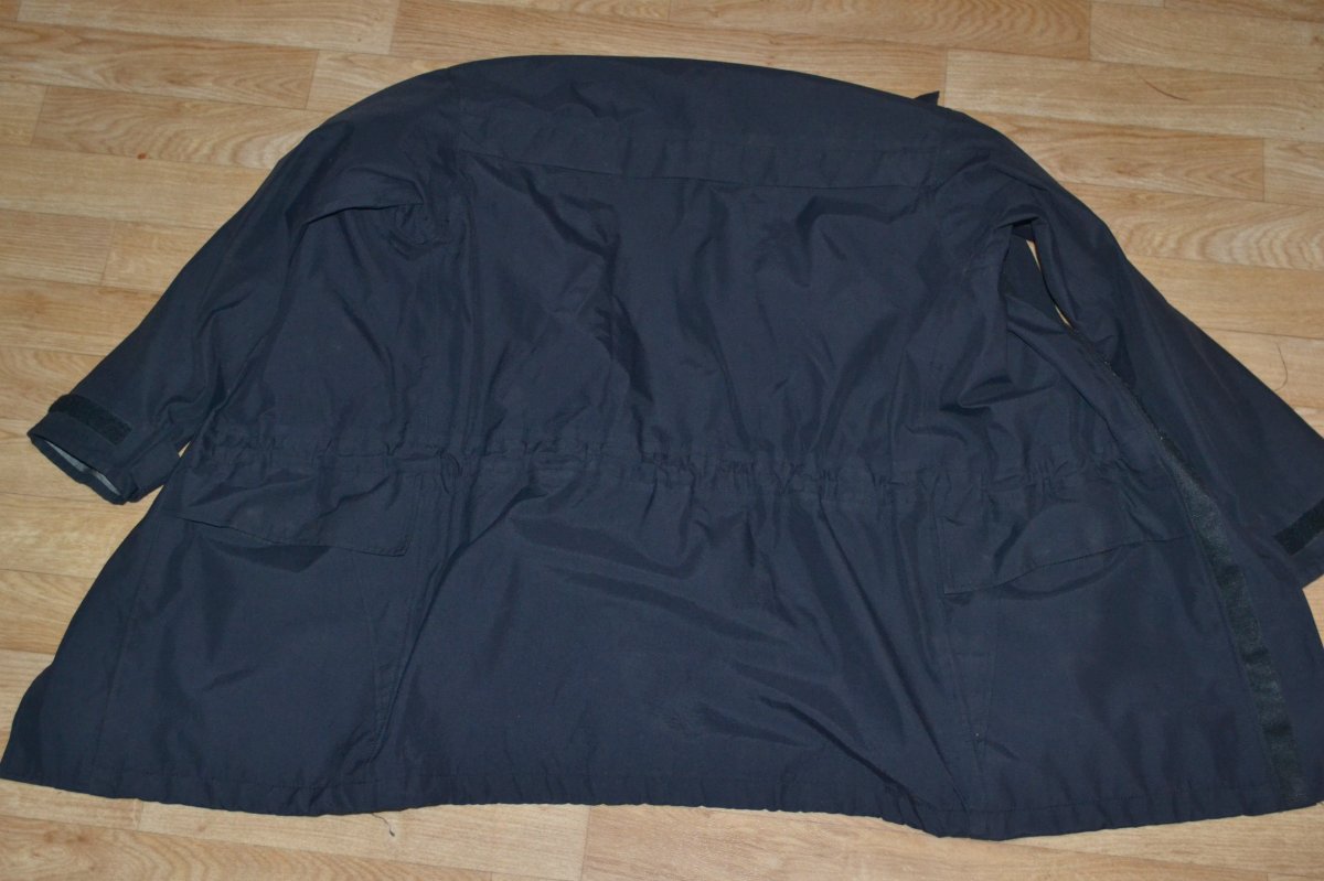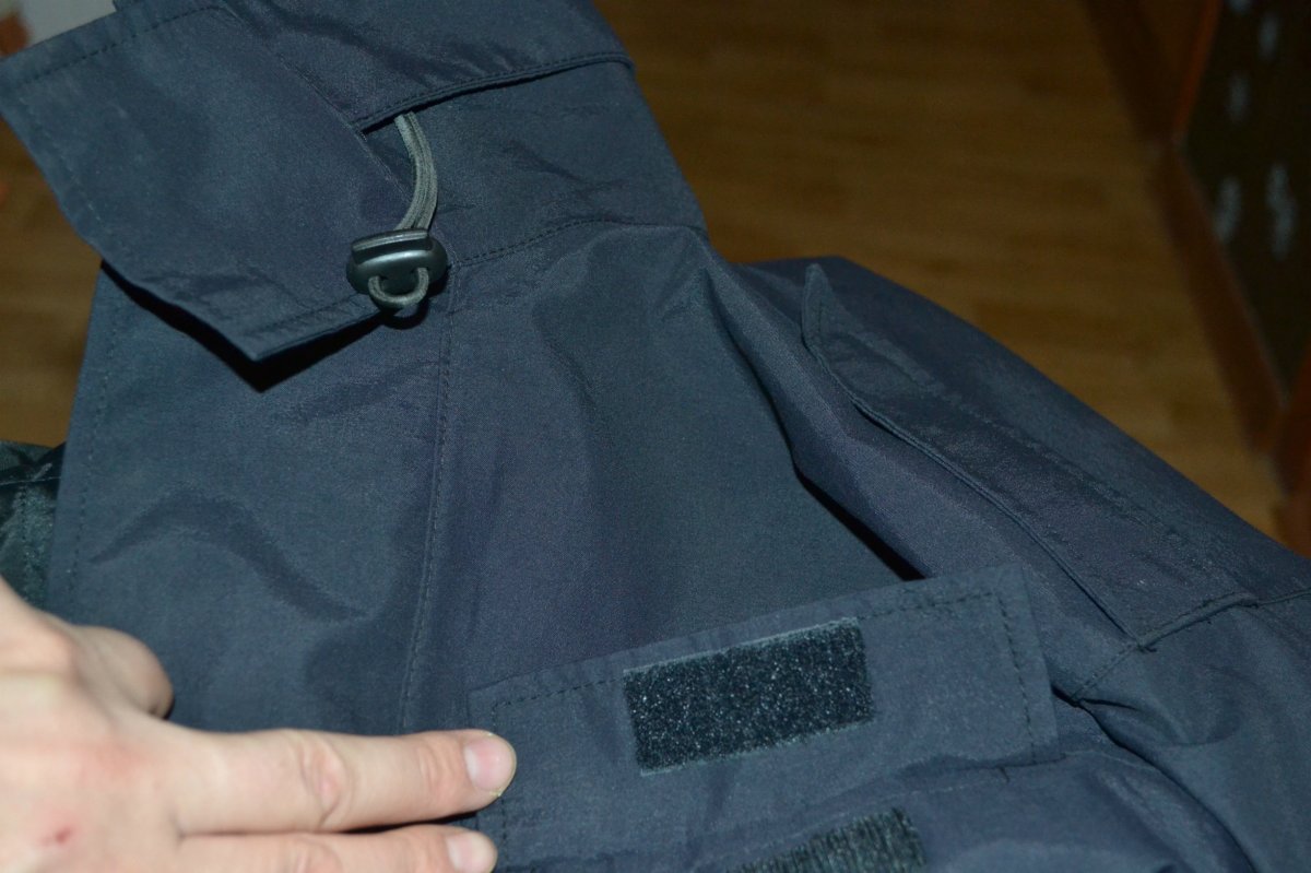 Куртка ветро-влаго защитная черного цвета, без потерь, потёртостей и следов износа. Воротник стойка, на затяжках и липучках. На плечах лямки под погон, слева на груди карман на липучке. Карманы по бокам на липучках в верхней части и боковые карманы на клапанах. Застегивается га молнию и клапан на липучке.
