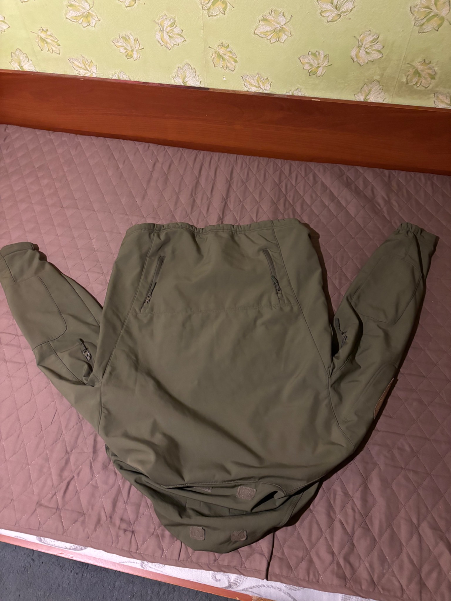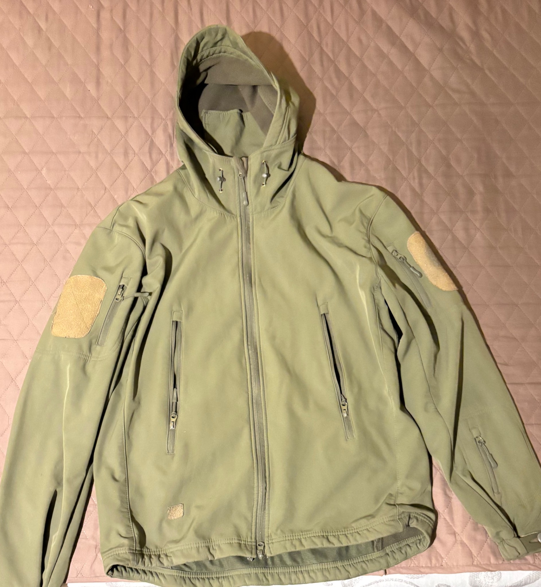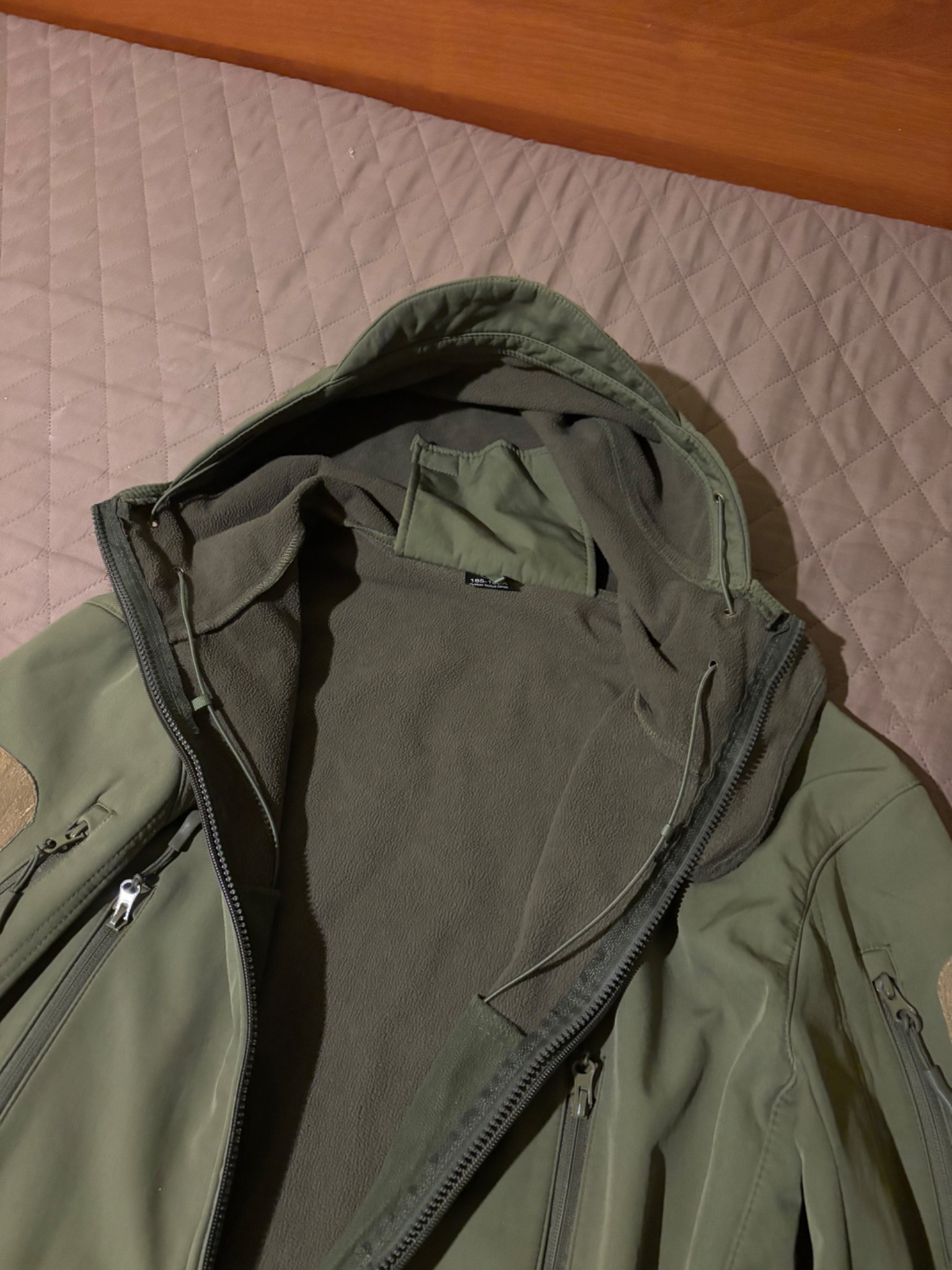 Вітаю, куртка розміру XL на фото є заміри по зросту, матеріал softshell в середині фліс, всі бігунки працюють, купа карманів, утяжка на низу по талії, утяжка на капюшоні, велкрл на плечах по бокам, без порізів, надривів і тд, дивіться ініші мої лоти багато цікавого по тематиці