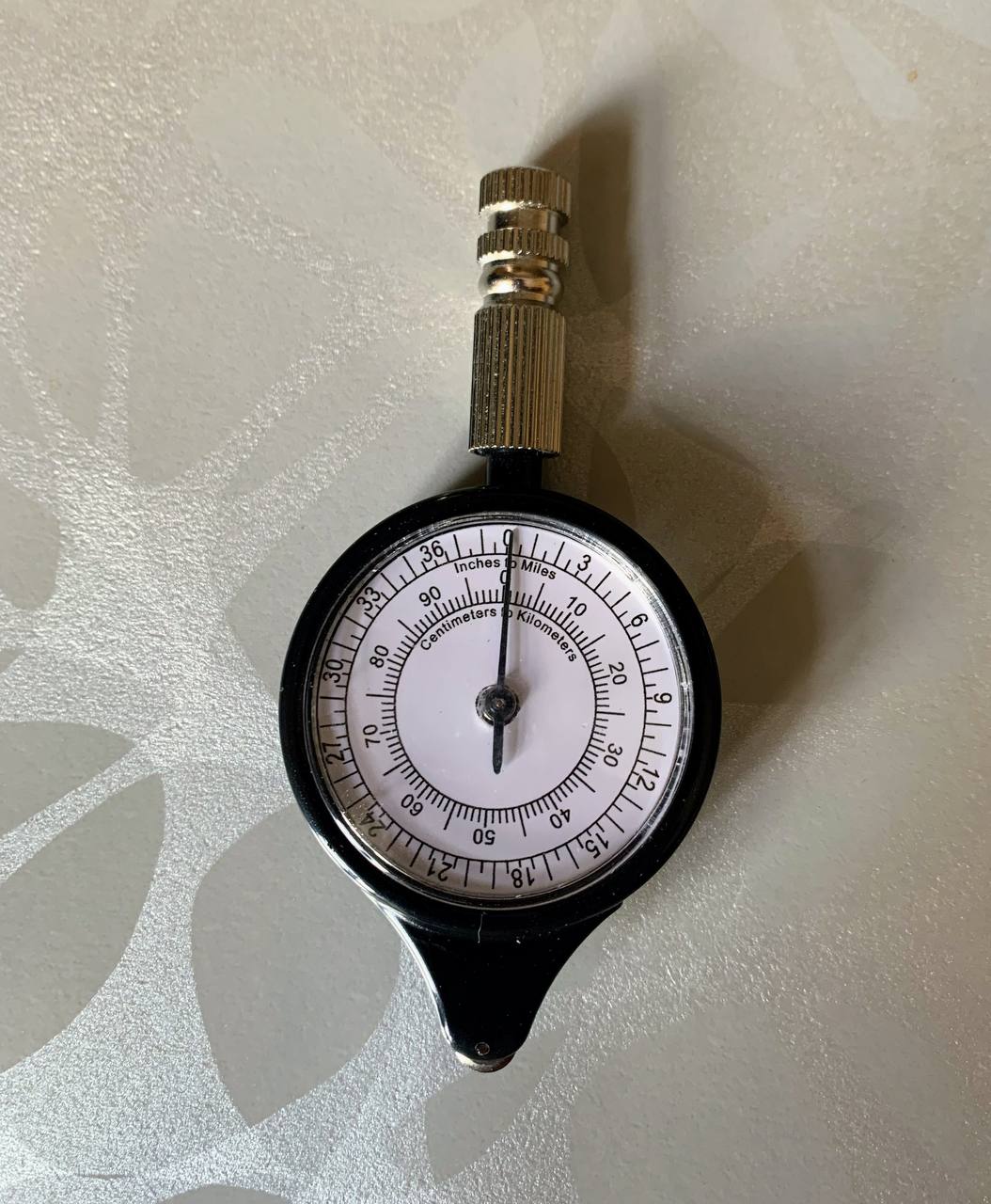 В нижней части курвиметра расположено рифленое колесико, которое измеряет необходимое расстояние, а циферблат при помощи стрелки отображает количество "пройденных" сантиметров. Полученный результат просто умножаете на масштаб карты и получаете нужное расстояние.