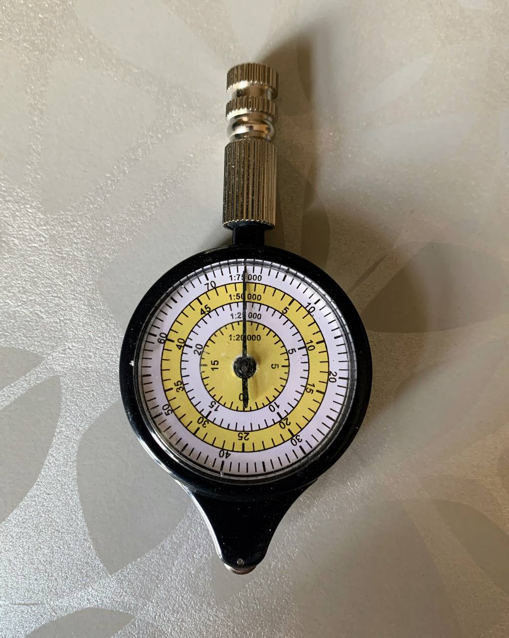 В нижней части курвиметра расположено рифленое колесико, которое измеряет необходимое расстояние, а циферблат при помощи стрелки отображает количество "пройденных" сантиметров. Полученный результат просто умножаете на масштаб карты и получаете нужное расстояние.