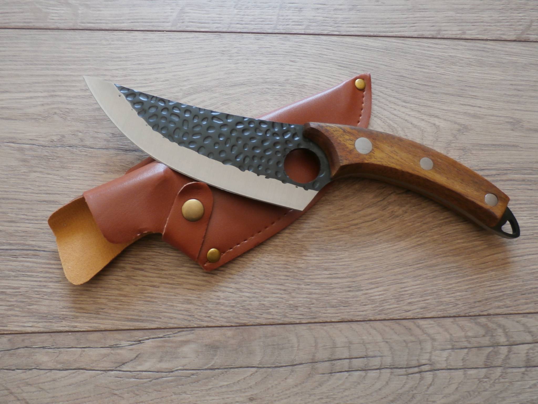 Дополнительно нож мясника оснащен ножнами с Экокожи