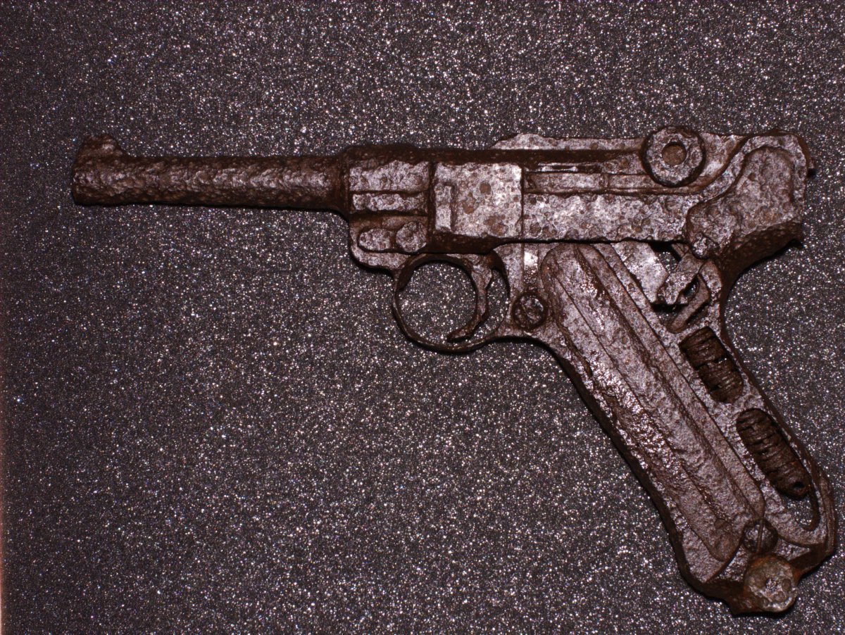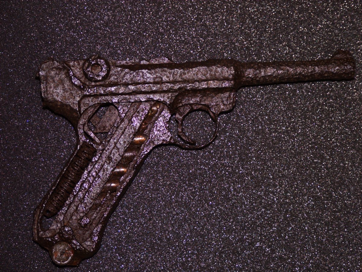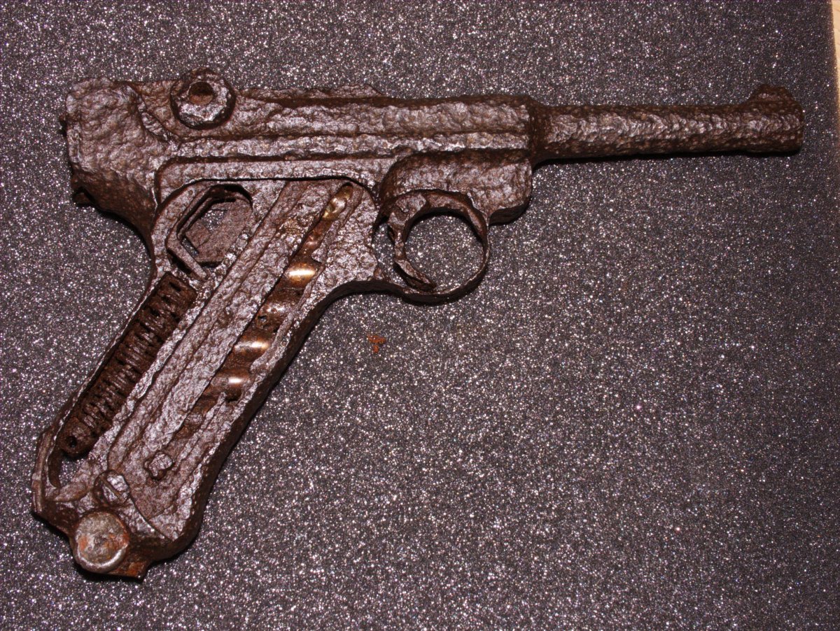 Люгер,копаний. Довший час лежав в маслі. Нічого не робив,ні в чому не замочував (крім масла),ніяких механічних робіт з ним не проводив. Метал не сипеться,не слоїться,силою обстукував дерев"яним кийком (думав,що може таким чином розрухаю деталі)-не відпало ні крихти металу. Якщо людина має час,терпіння і сталеві нерви,то може запросто довести макет до путя. Кулі в магазині всі пробиті так,щоб ззовні не кидалось в очі (на фото під кутом видно місця проколів).Якщо буде потреба,можу повиймати всі,але з повною втратою магазину. Після завершення торгів,зроблю деактив ствола в місці,вказане покупцем.