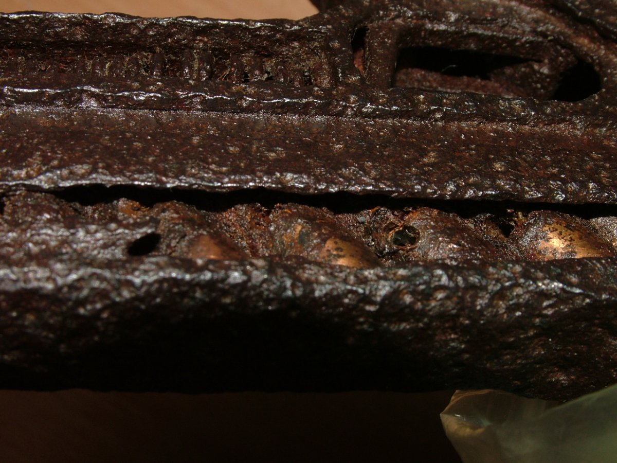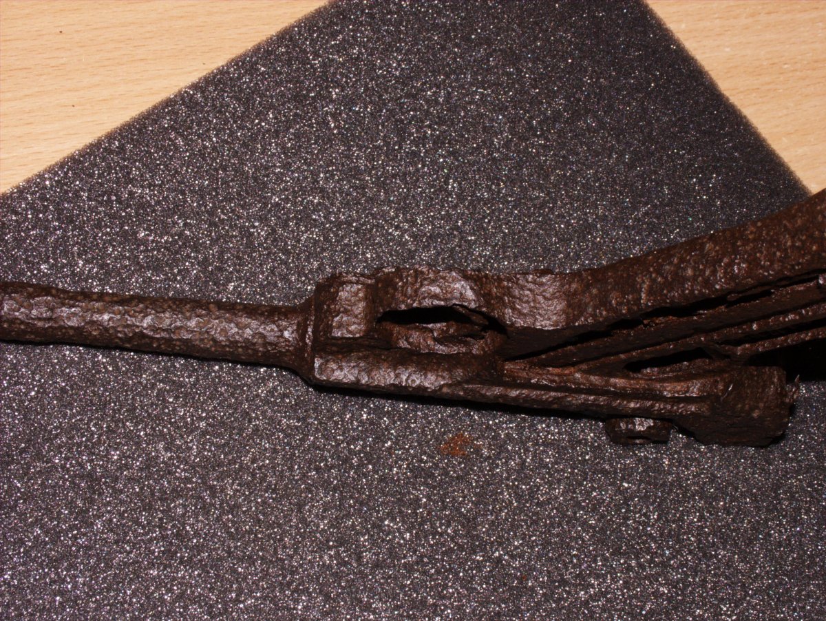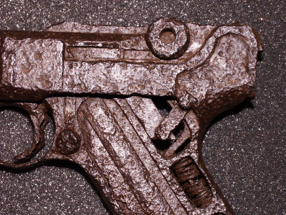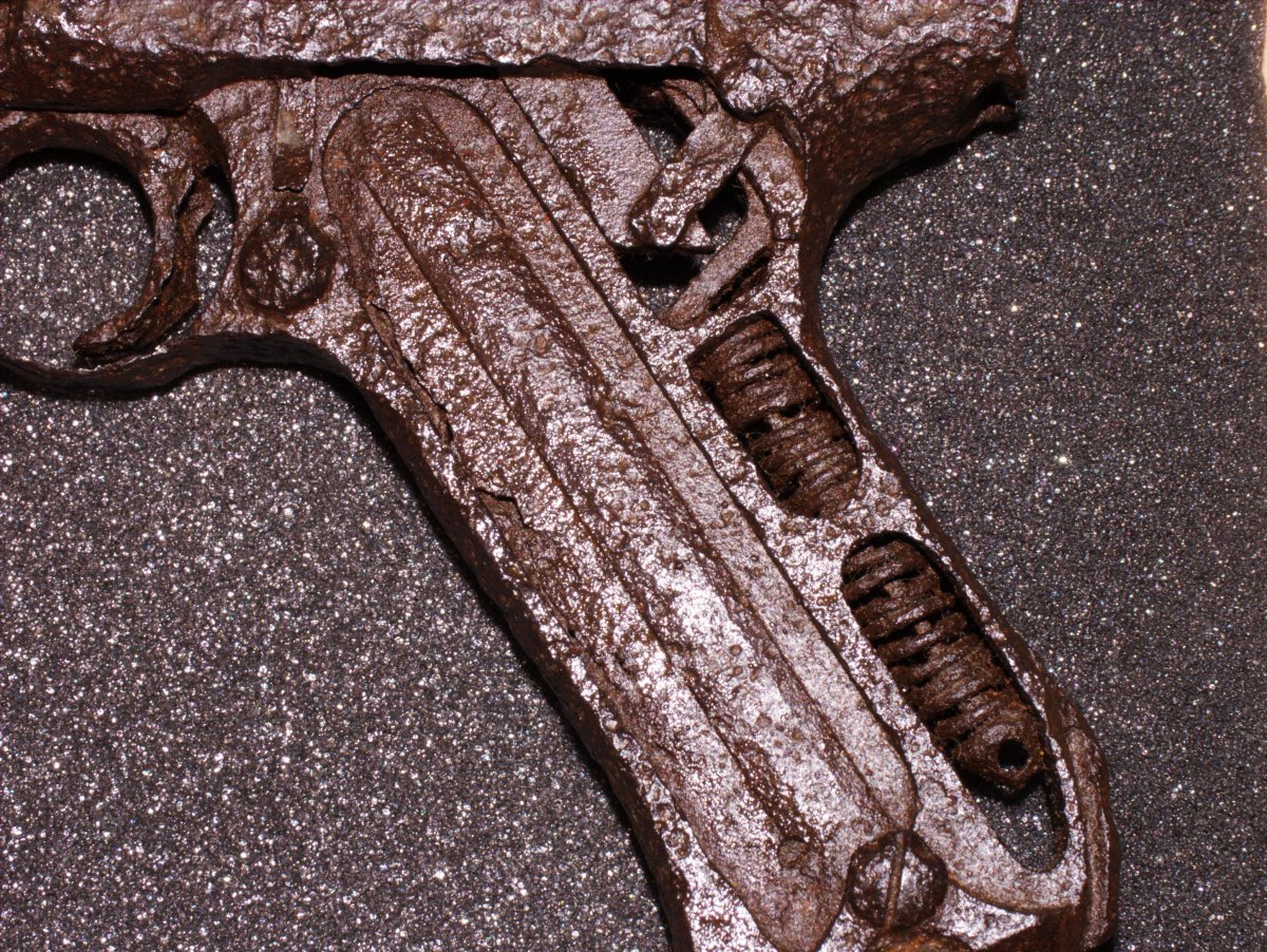 Люгер,копаний. Довший час лежав в маслі. Нічого не робив,ні в чому не замочував (крім масла),ніяких механічних робіт з ним не проводив. Метал не сипеться,не слоїться,силою обстукував дерев"яним кийком (думав,що може таким чином розрухаю деталі)-не відпало ні крихти металу. Якщо людина має час,терпіння і сталеві нерви,то може запросто довести макет до путя. Кулі в магазині всі пробиті так,щоб ззовні не кидалось в очі (на фото під кутом видно місця проколів).Якщо буде потреба,можу повиймати всі,але з повною втратою магазину. Після завершення торгів,зроблю деактив ствола в місці,вказане покупцем.