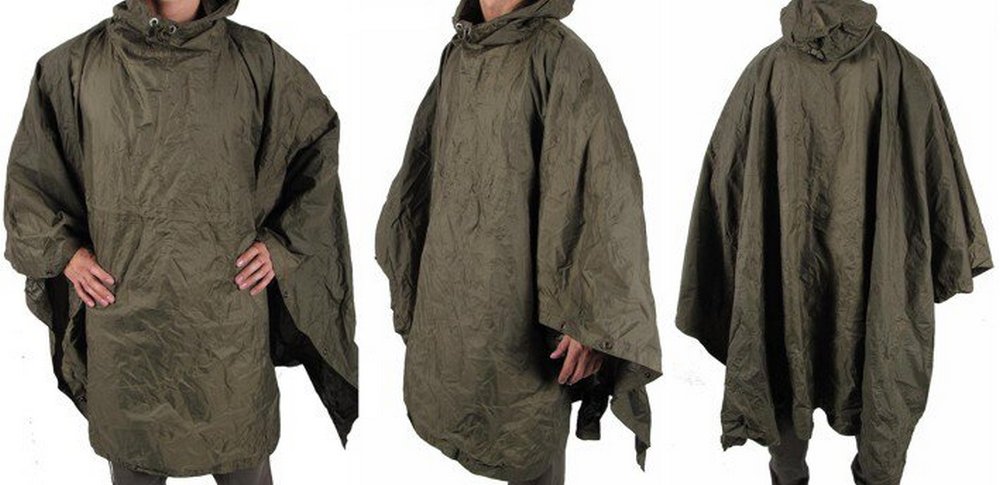Может использоваться и как пончо и как тент/навес (по краям вшиты люверсы для растяжки тента), капюшон при этом завязывается в узел и не пропускает воду через горловину.