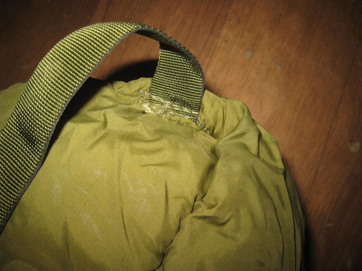 Спальник - немного б/у в нормальном состоянии, есть надписи на бирке и с внутренней и внешней стороны, присаленность на капюшоне, следы ремонта на днище (восстановлена стропа) и на капюшоне (нет утяжки), припылен (складское хранение).