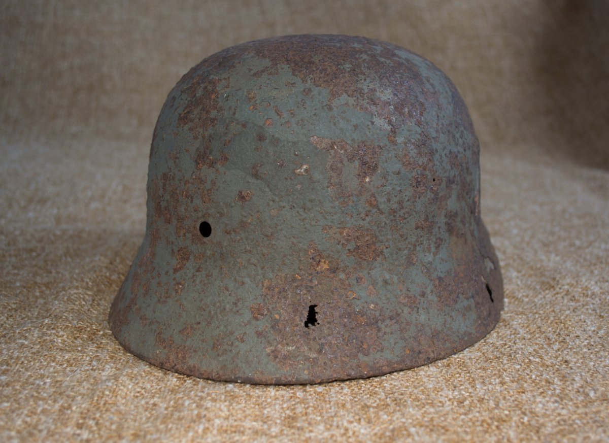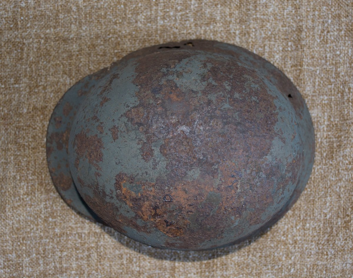 Каска М-35, размер 64 завод ET. Есть трещина и несколько мест с сильной коррозией. Большое количество краски, если почистить более тщательно вылезет ещё. Двойной перекрас. Остатки триколора, птица отсутствует.