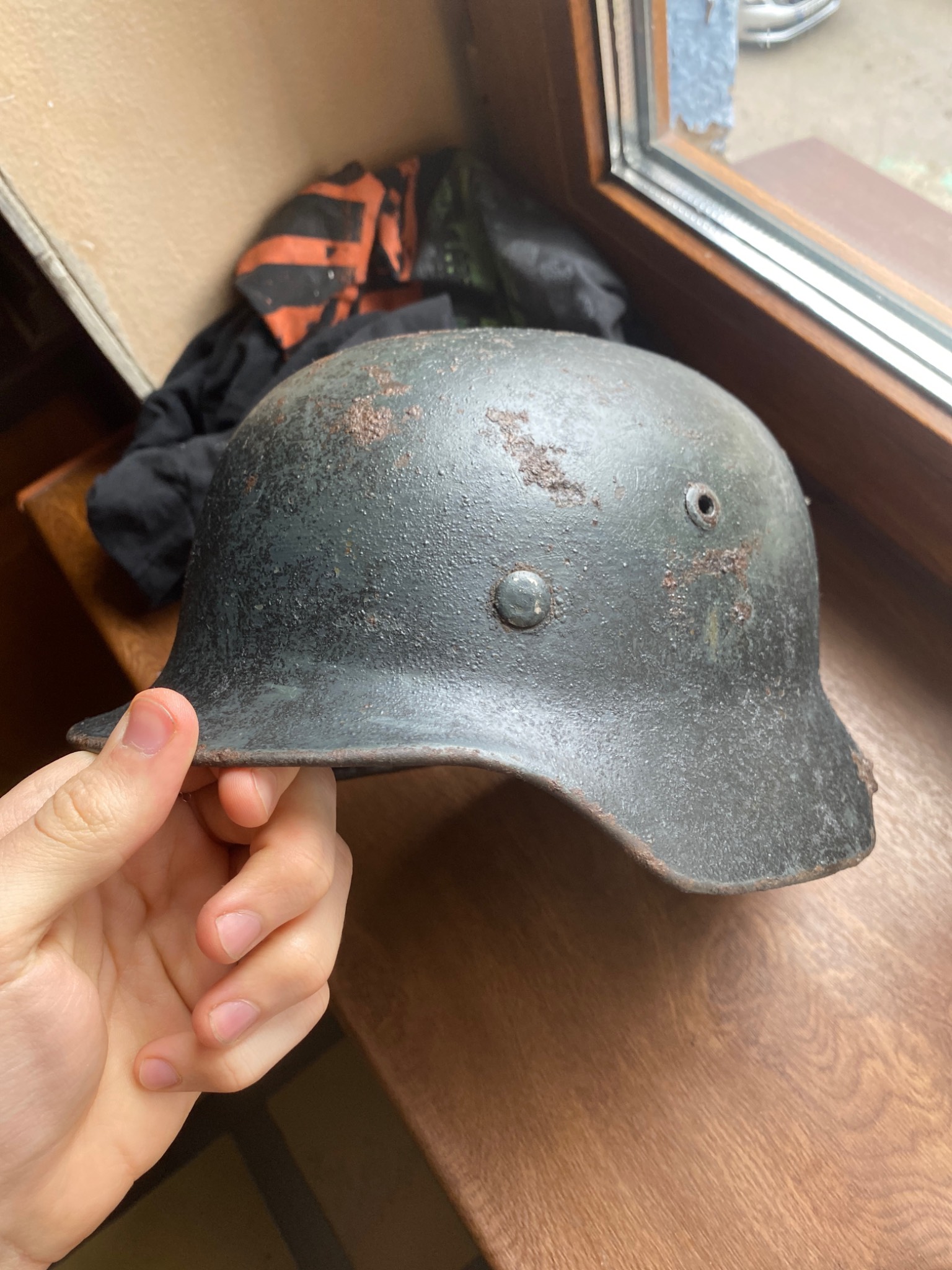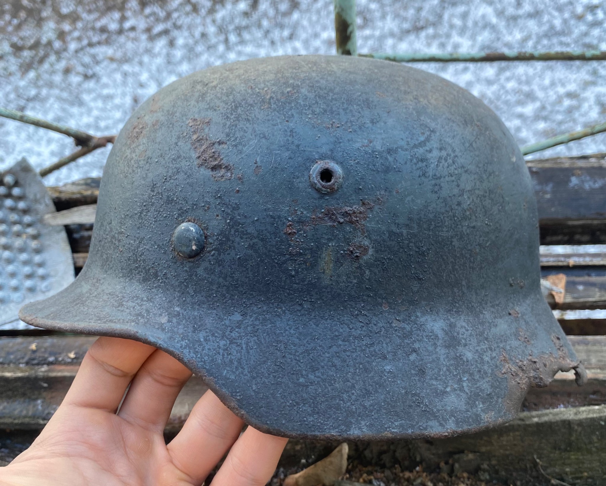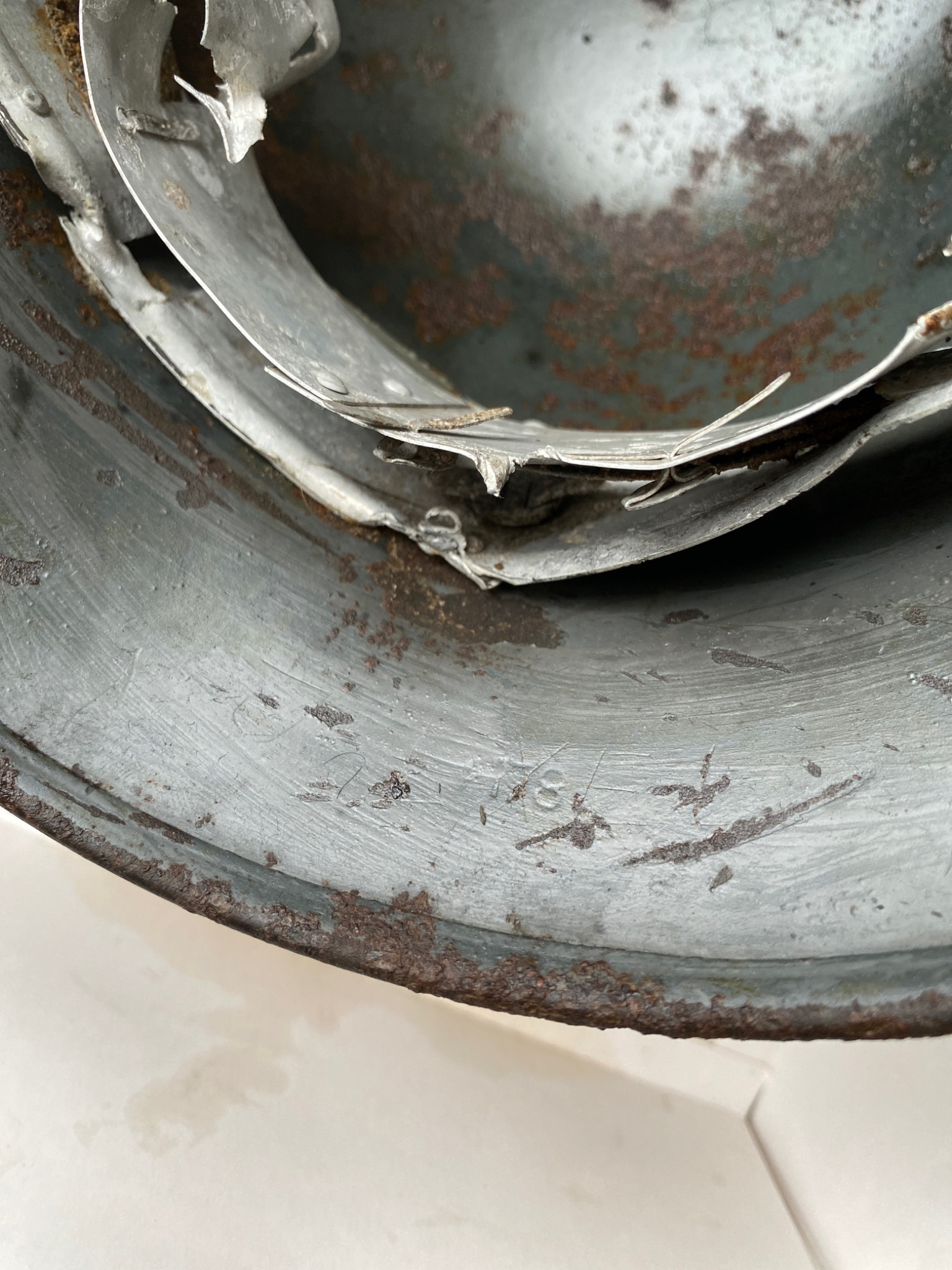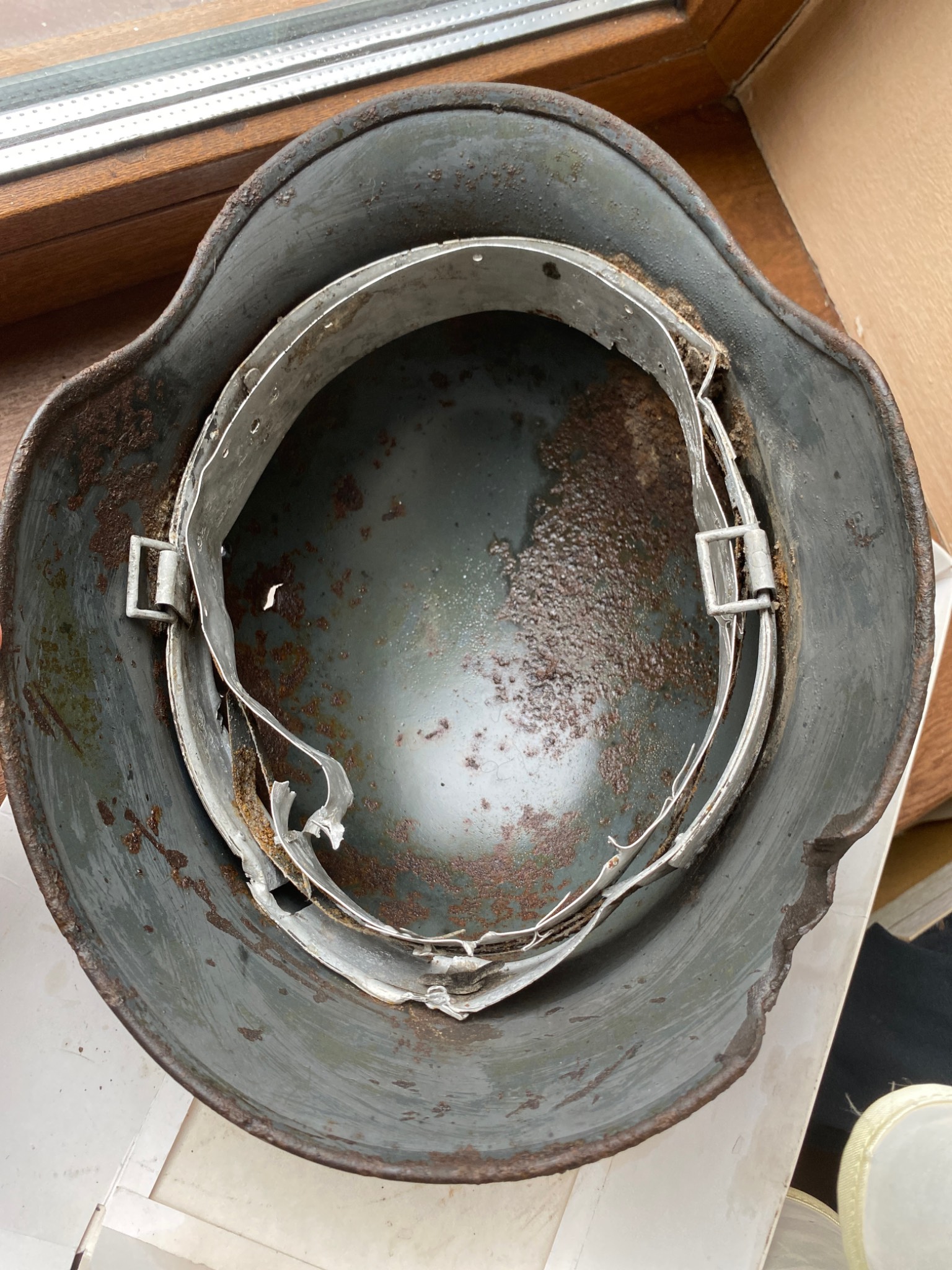 Состояние просто фантастика. Ржавчина настолько пощадила шлем, что видны даже клейма и выцарапанная внутри подпись владельца. Латунные кламмеры, алюминиевый подшлемник.