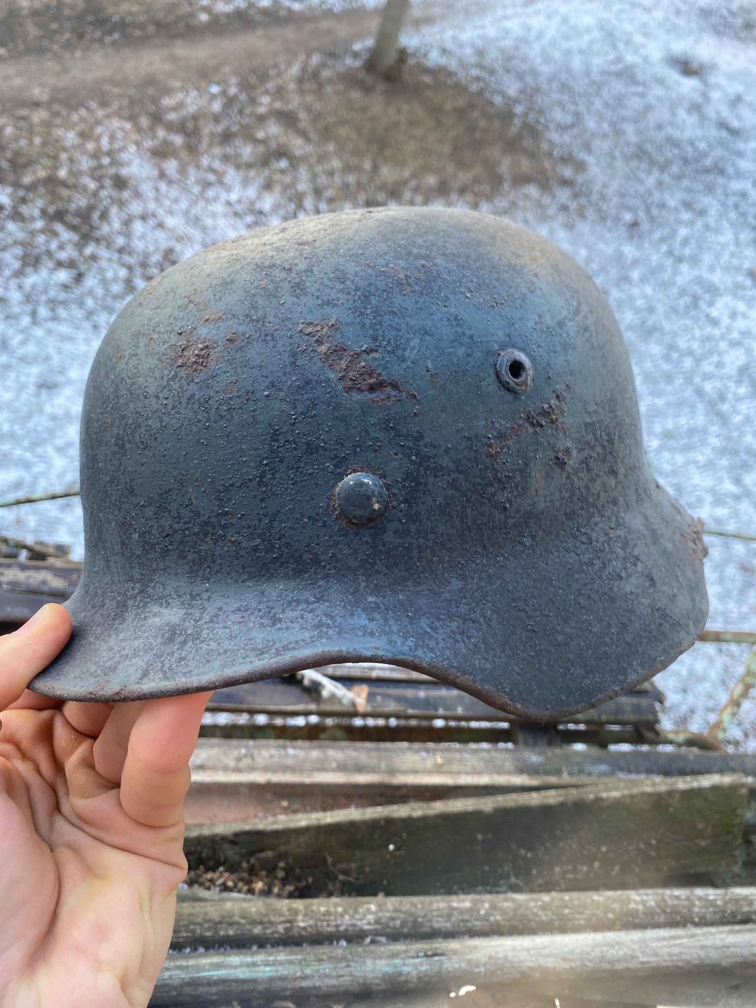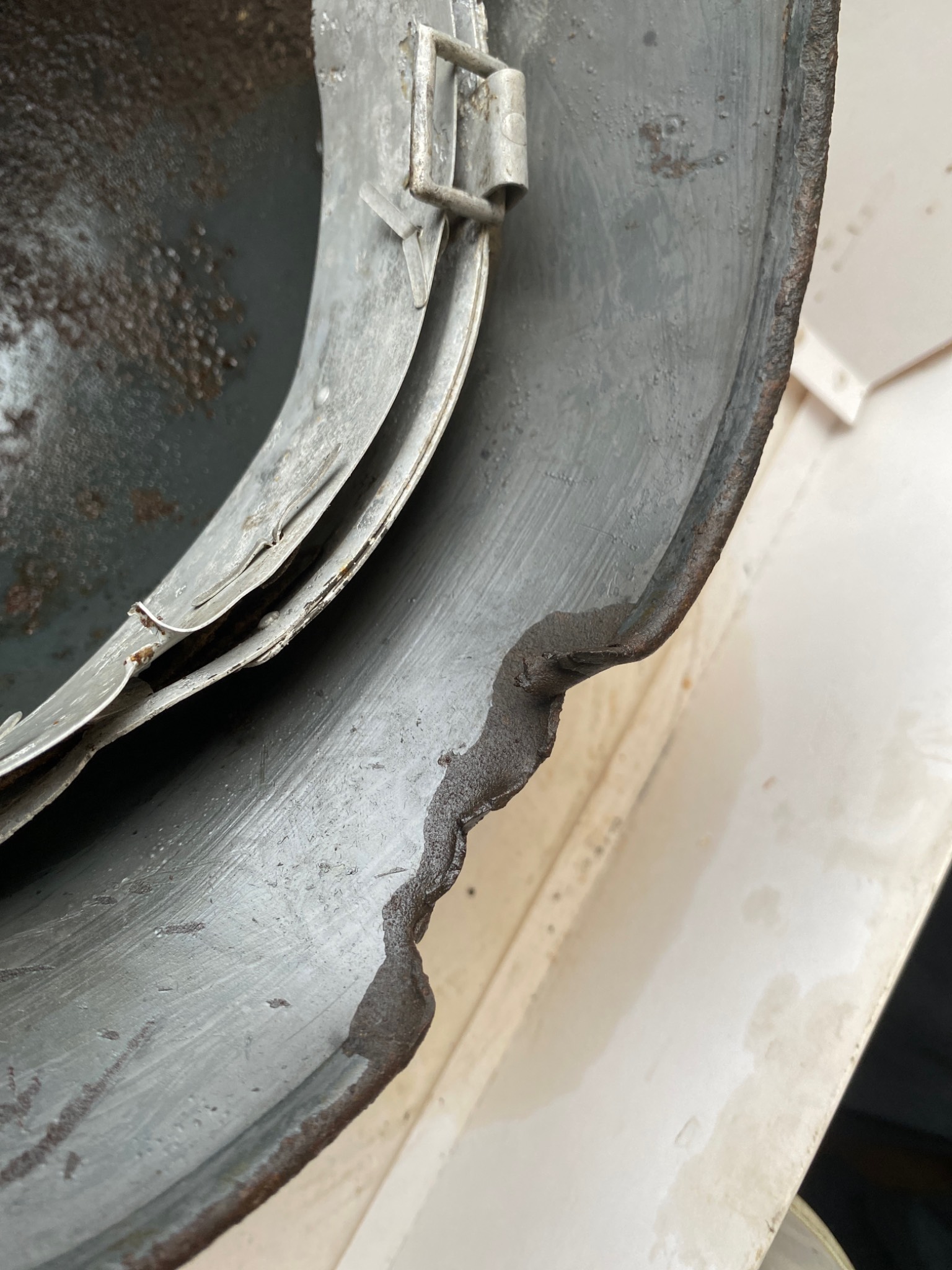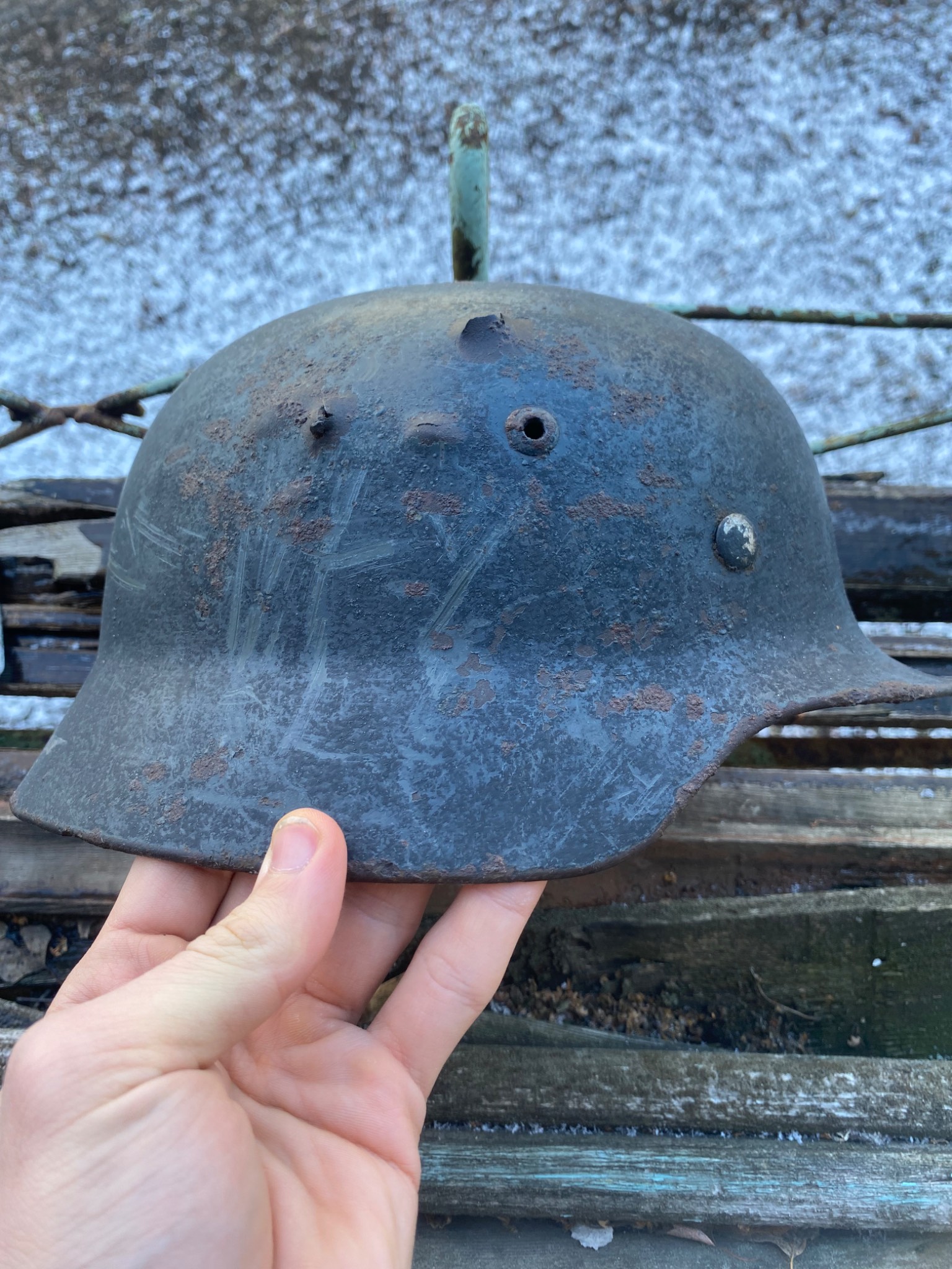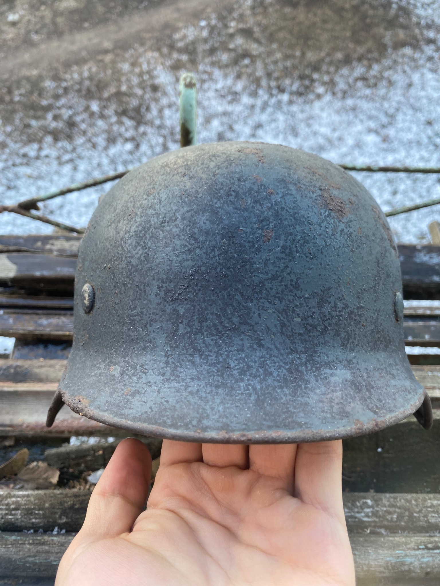 Состояние просто фантастика. Ржавчина настолько пощадила шлем, что видны даже клейма и выцарапанная внутри подпись владельца. Латунные кламмеры, алюминиевый подшлемник.