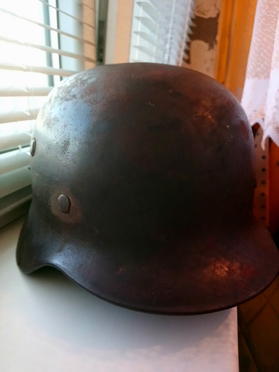 Предложу крепкий шлем под восстановление, на куполе есть отверстие 1 см, вмятина-рихтуется на раз и две трещины в затылочной части и по юбке, каверн мало, клеуна месте, в одном месте утрачена часть вальца, в другом расхождение,в люверсах и отверстия под кламмера заклёпки,![]()