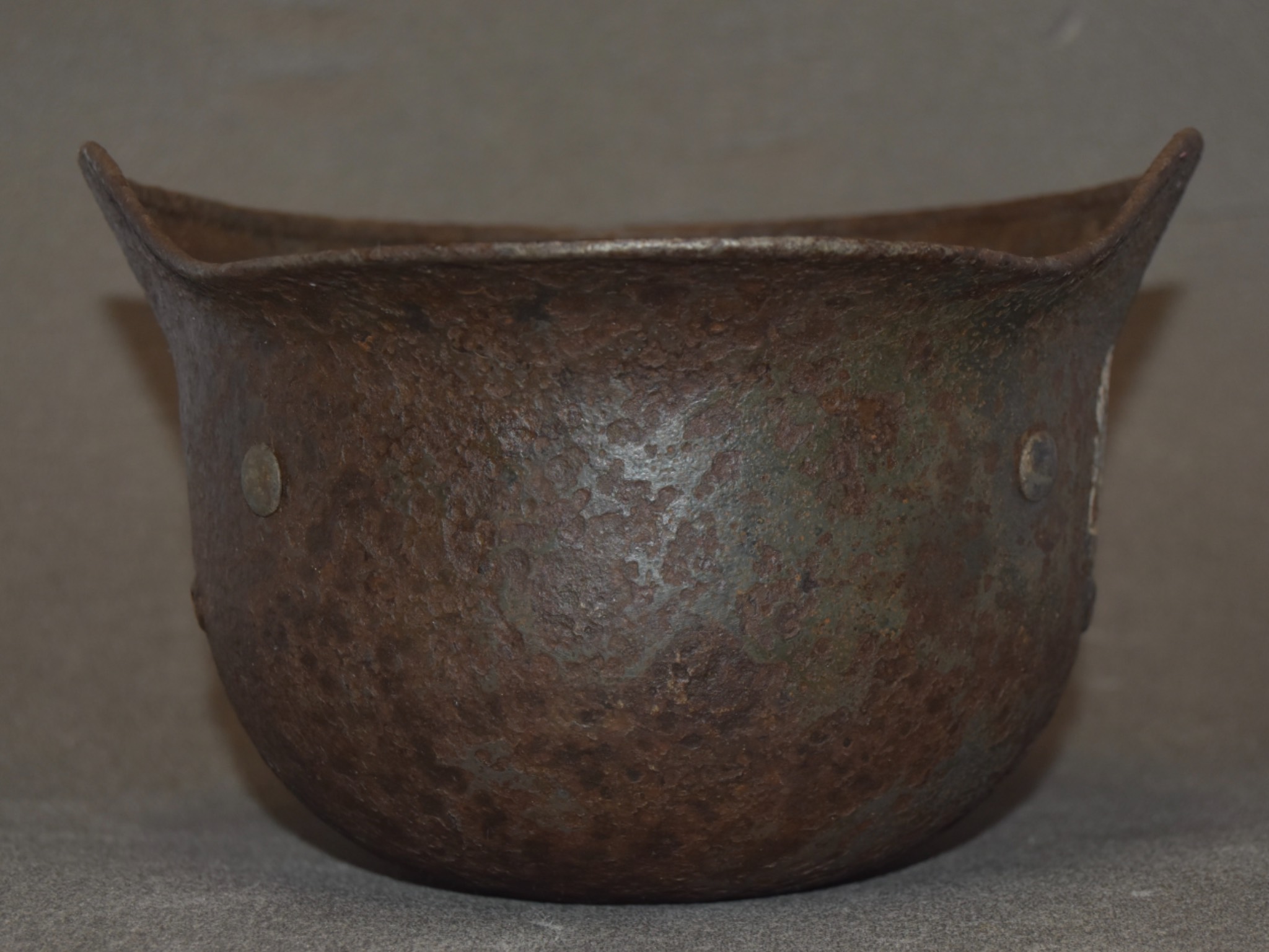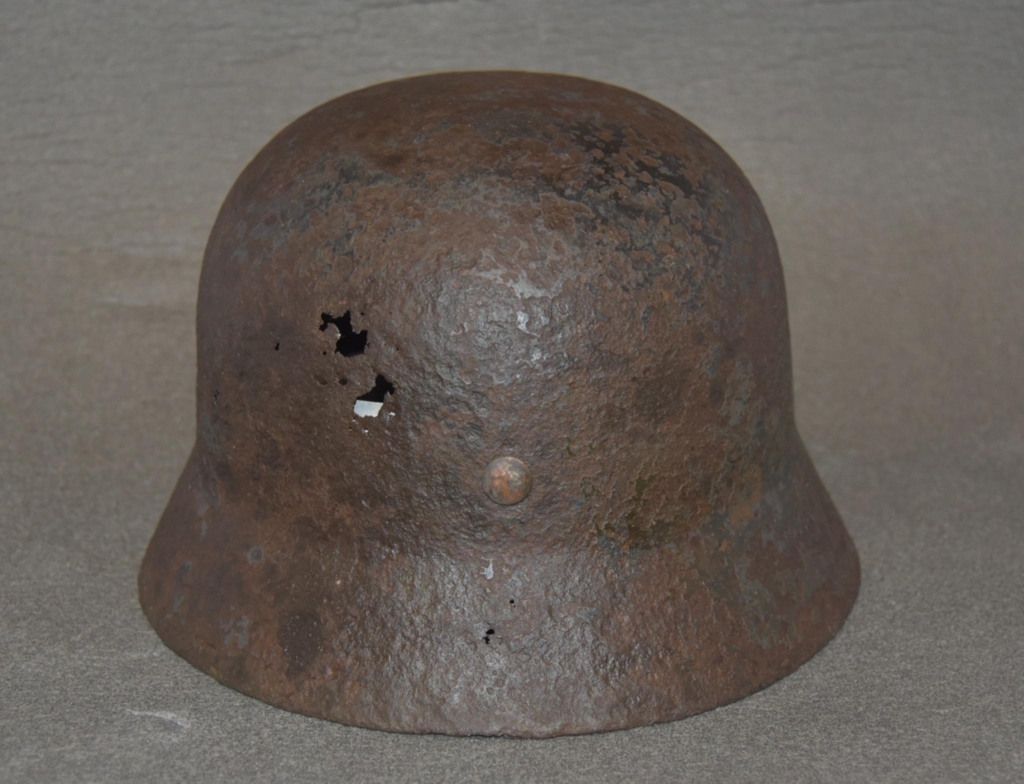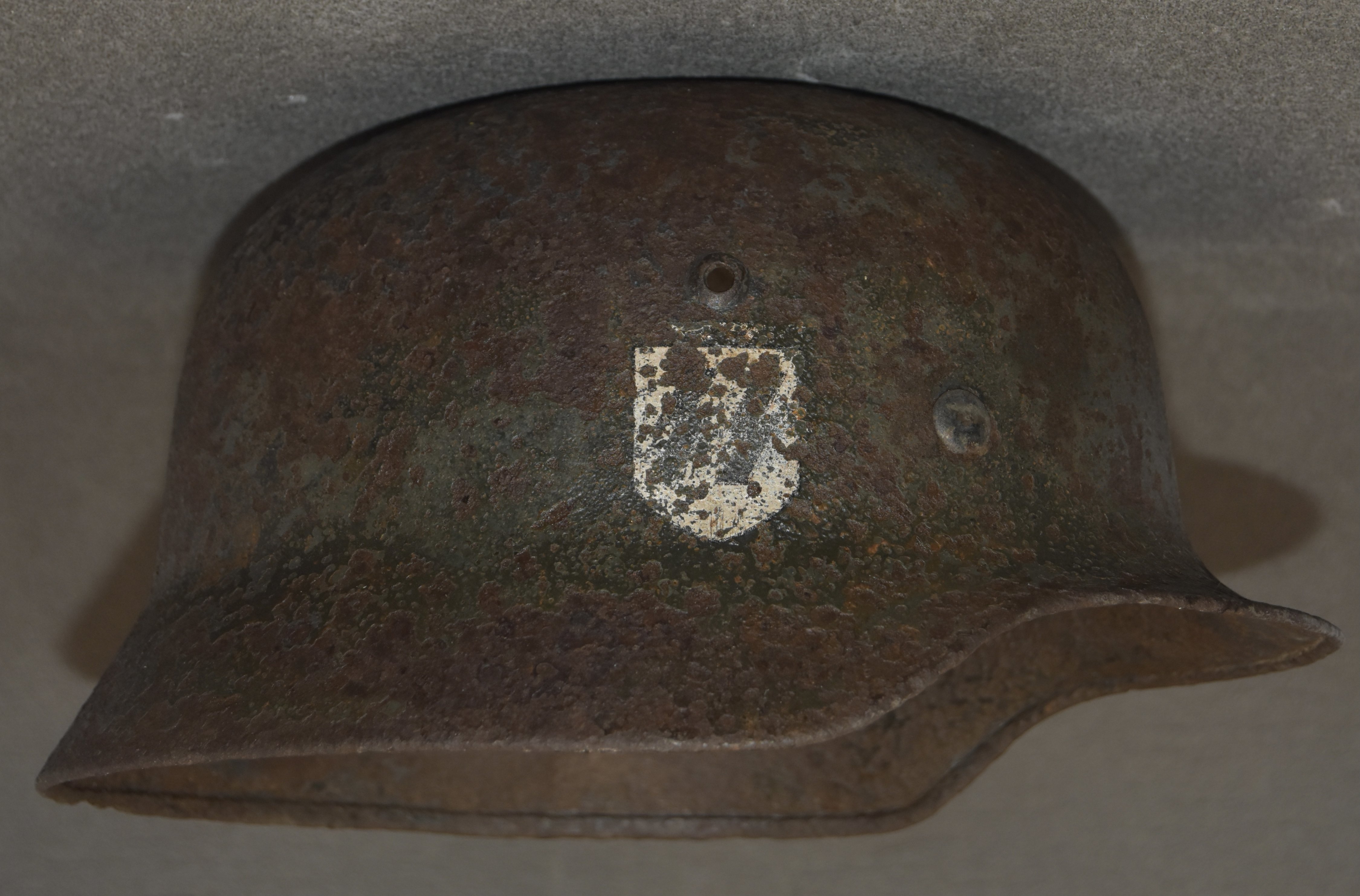 Оригинальная М-35 SS Две декали SS одна поверх другой( вервую видно была чуть выше наклеена за ем закрашена , было несколько слоев краски-перекрасов . Левая сторона немного хуже по сохрану несколько дырок. Но Каска крепка бодрая гладкая, вальц четкий целый .