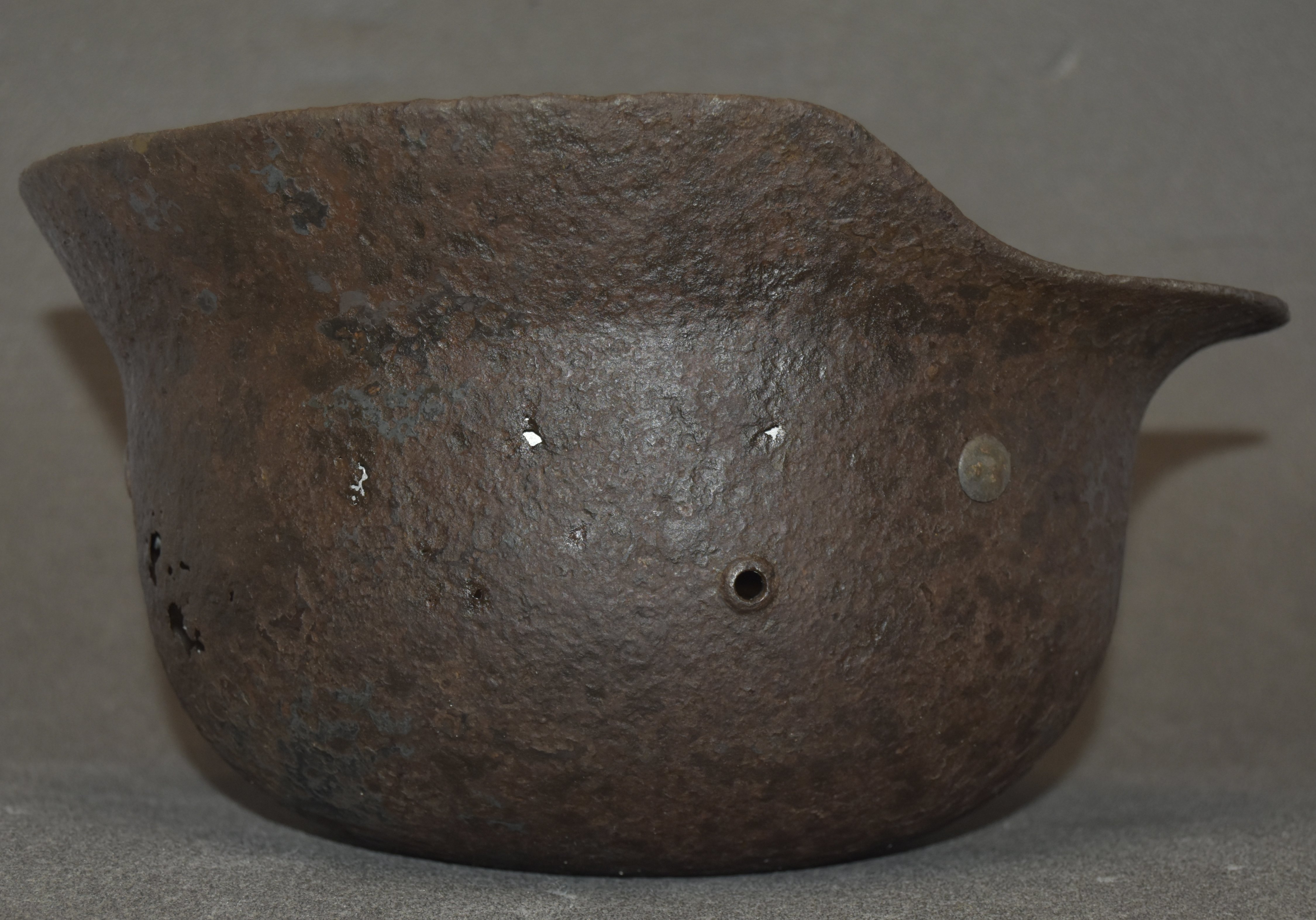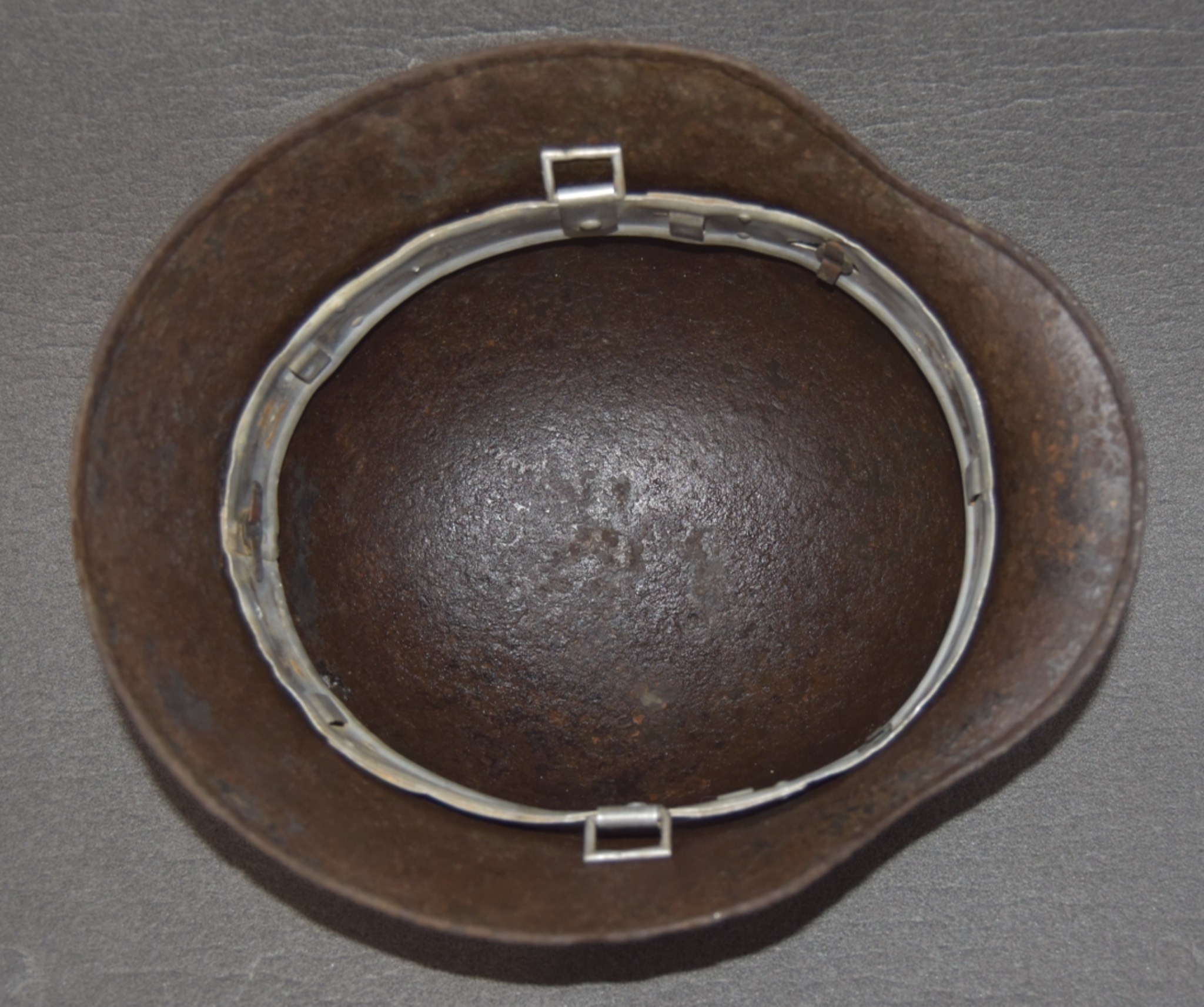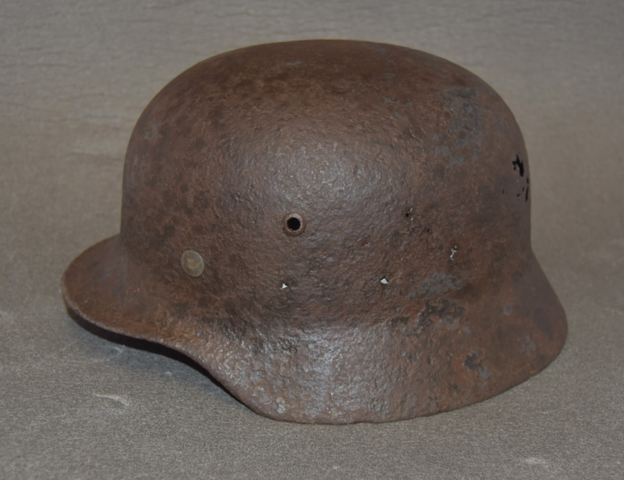 Оригинальная М-35 SS Две декали SS одна поверх другой( вервую видно была чуть выше наклеена за ем закрашена , было несколько слоев краски-перекрасов . Левая сторона немного хуже по сохрану несколько дырок. Но Каска крепка бодрая гладкая, вальц четкий целый .