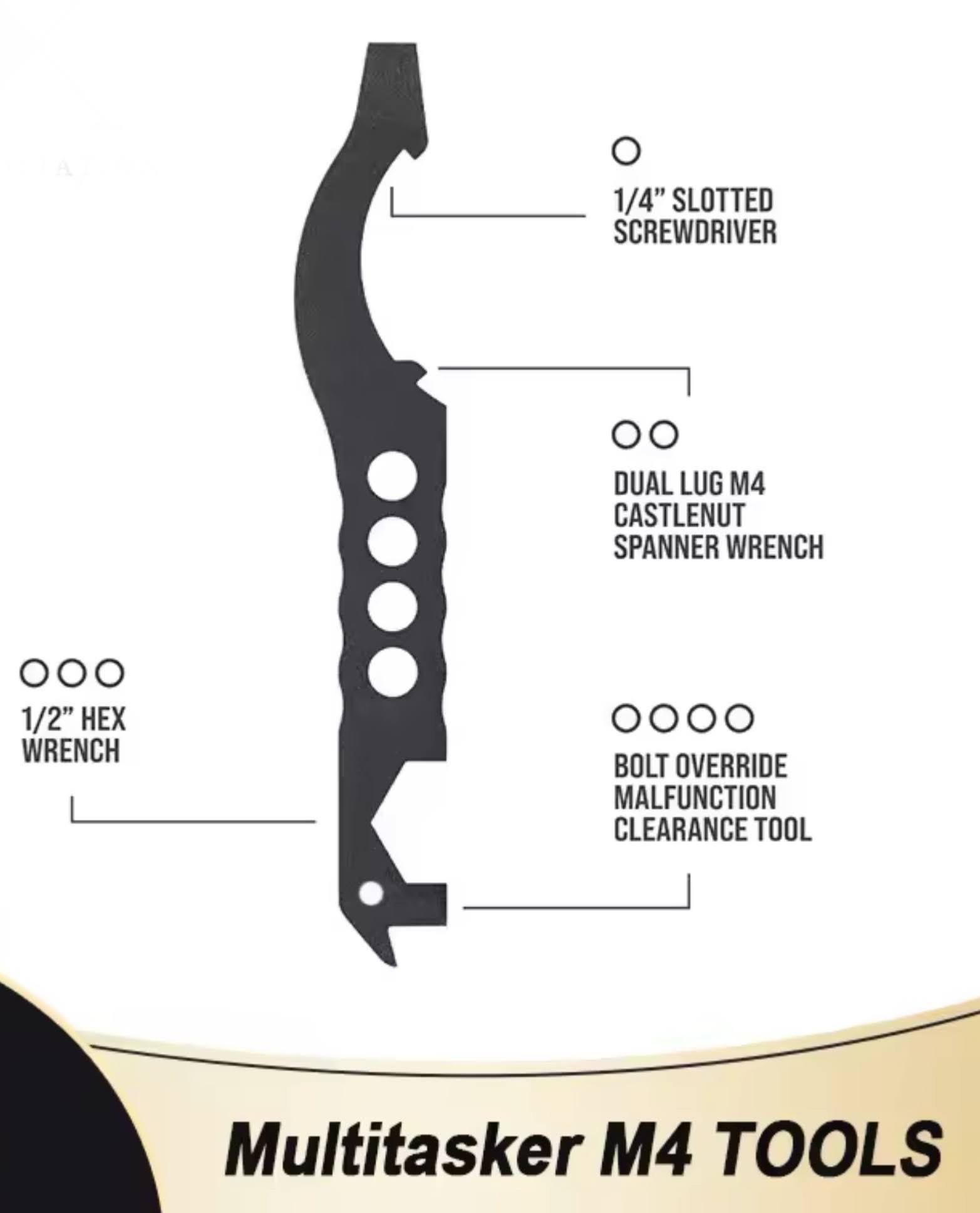 Крім того, цей багатофункціональний інструмент можна використовувати як шлицеву викрутку на ¼ дюйма та шестигранний ключ на ½ дюйма, що ідеально підходить для встановлення кріплень для прицілів та оптики. Нарешті, інструмент M:4 також може усунути несправності затвора, які можуть виникнути, коли стріляну гільзу або кулю заклинило.