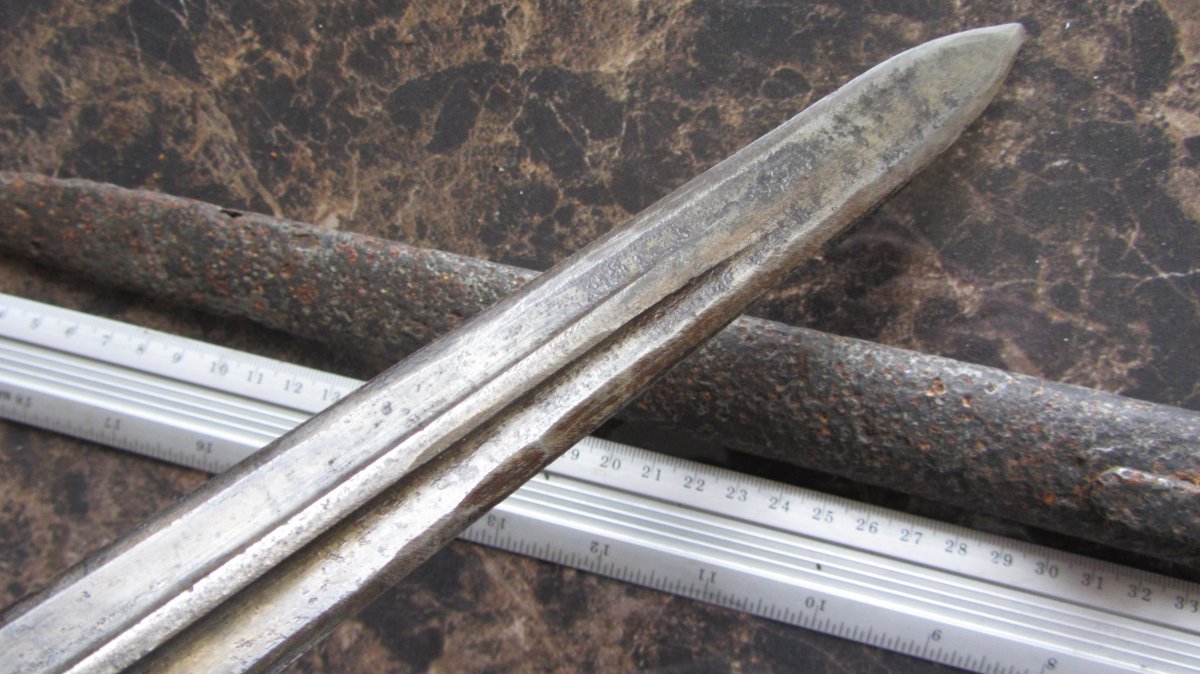 Стан на фото. Ножни копані є діри предмет до кінця не входить пружини на місці, дерево саморобне, кнопка не працює (вжата), лезо точене (не повністю).