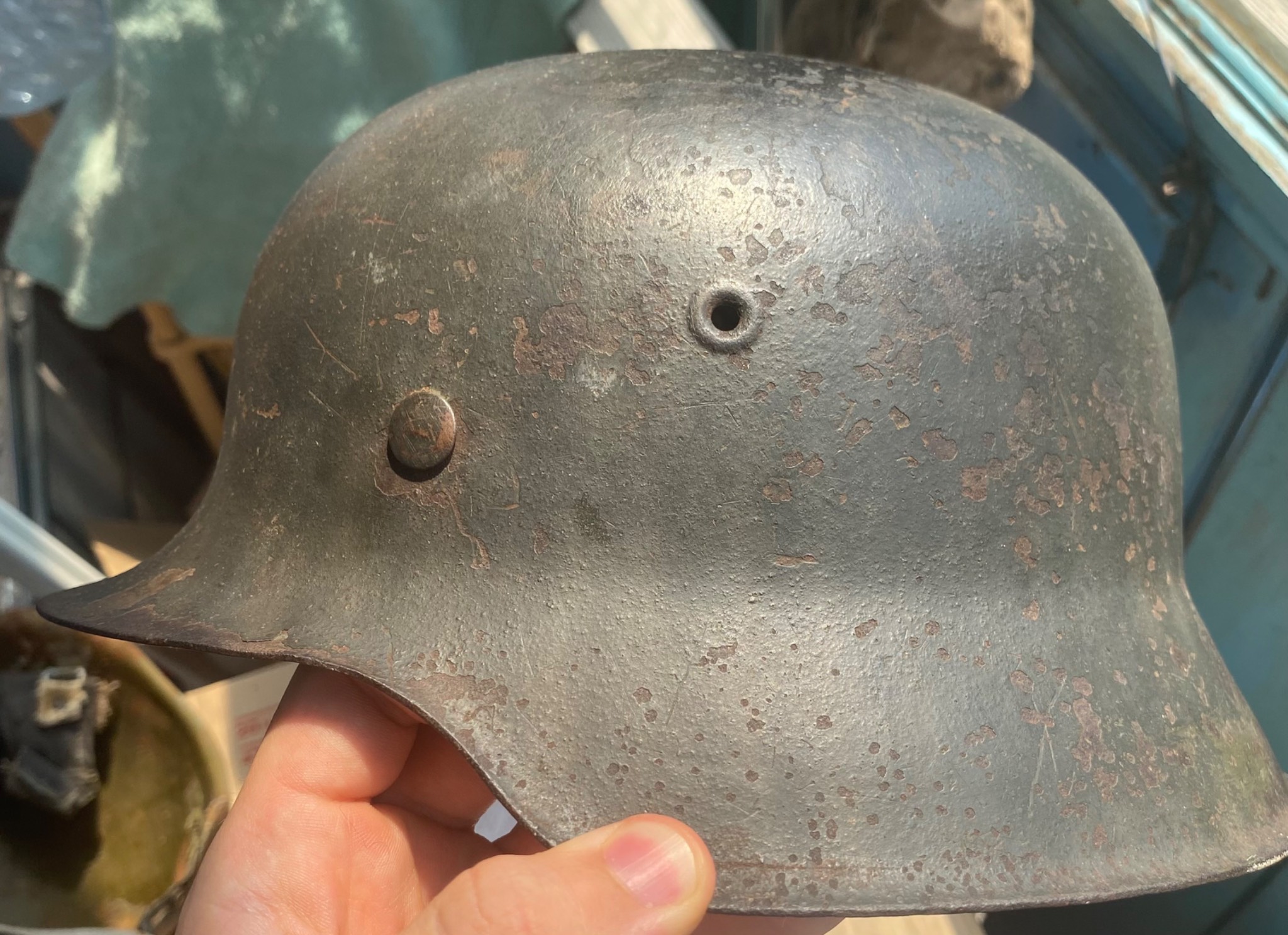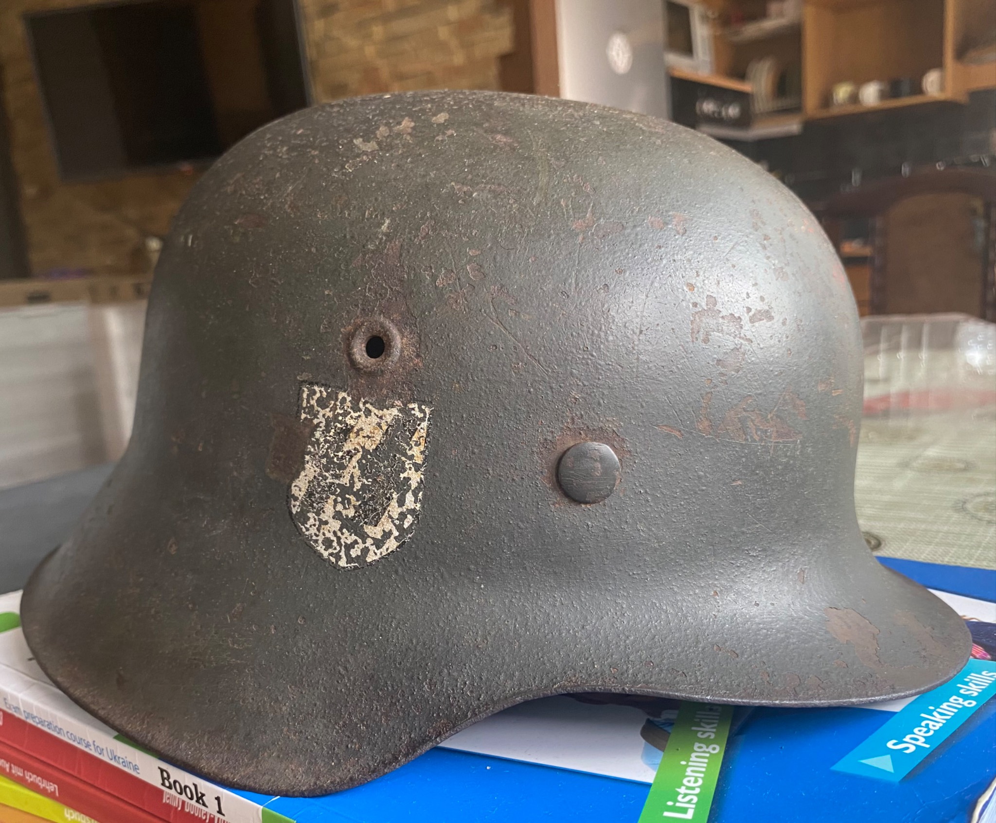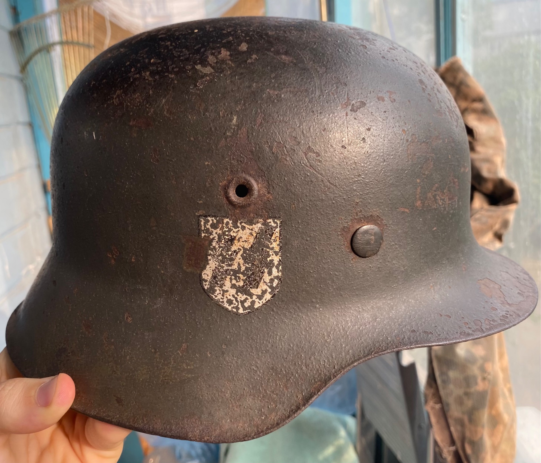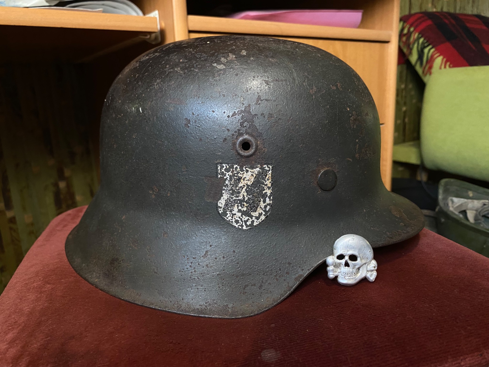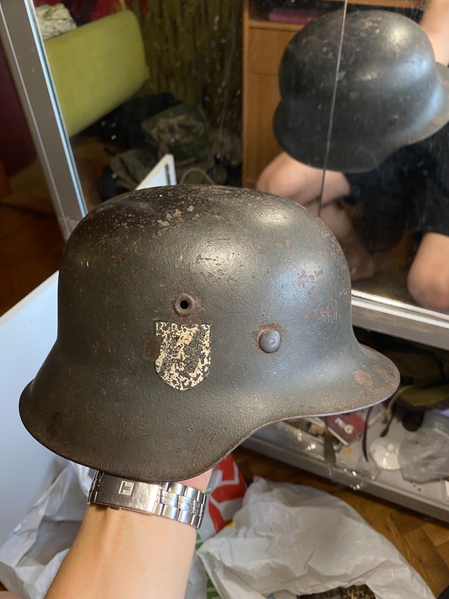 Каска в нечастом домашнем сохране, и что ещё реже — из украинского, а не забугорного собрания. Родная антибликовая краска с крошкой, родной обруч, кламмера и родная, хоть и пострадавшая от рук вандалов, декаль. Размер 64, то есть 66 по окружности. Впрочем, не думаю, что это играет практическую роль, так как образец полочный — любоваться и пылинки сдувать.