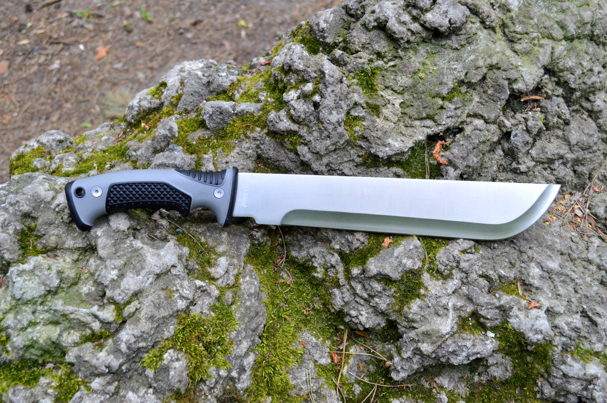 На хвостовике мачете смонтирована резинополимерная рукоять, не боящаяся влаги и намокания. Продуманно-эргономичная, она снабжена выемками и выступами, повышающими комфортность и надежность хвата.