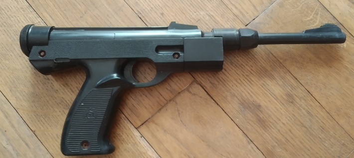 Пластиковий пістолет, виробництва СРСР. Не стріляє, не переламується. Виготовлений з двох половинок, що ксручені гвинтами. Ствол теж пластік.