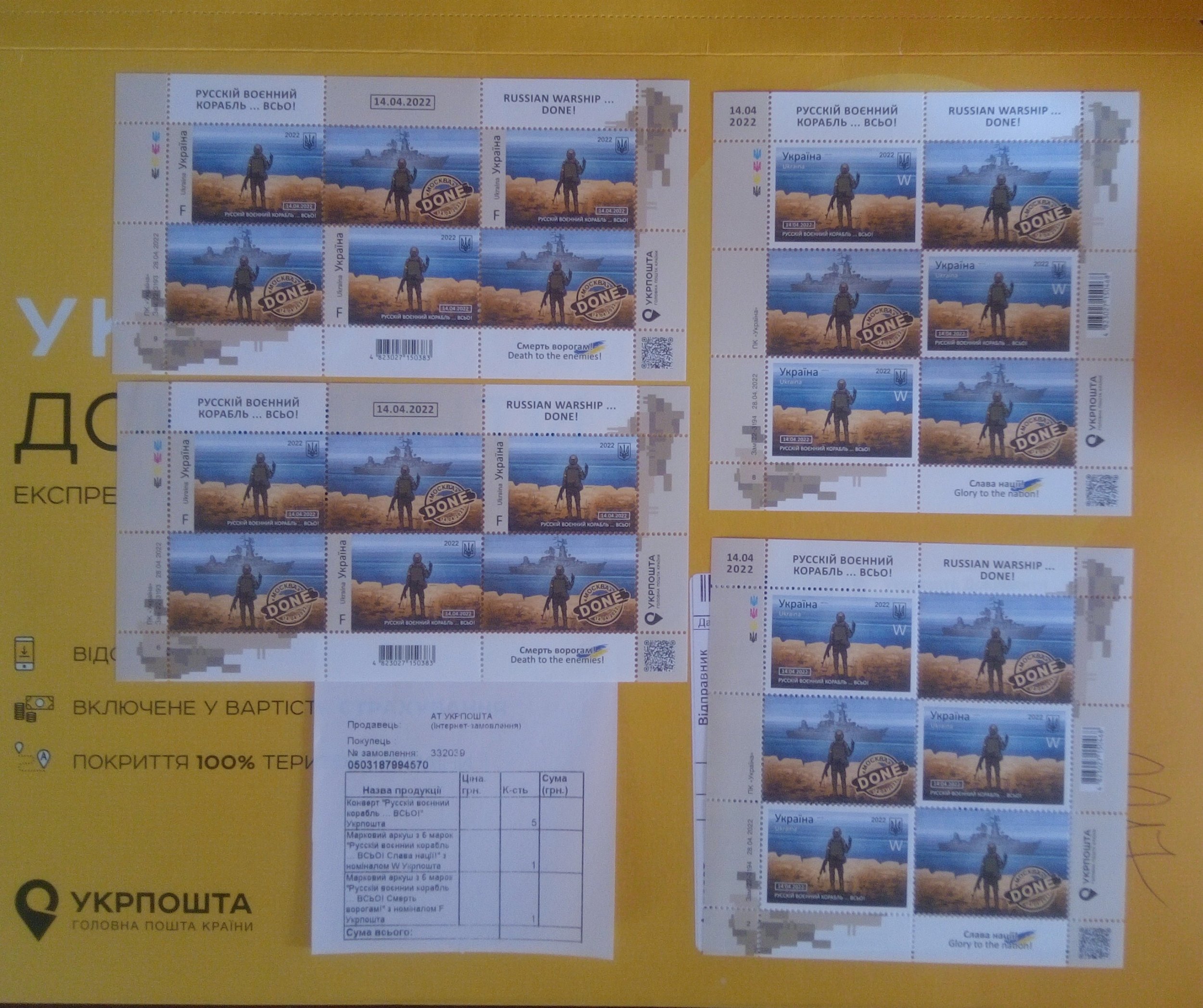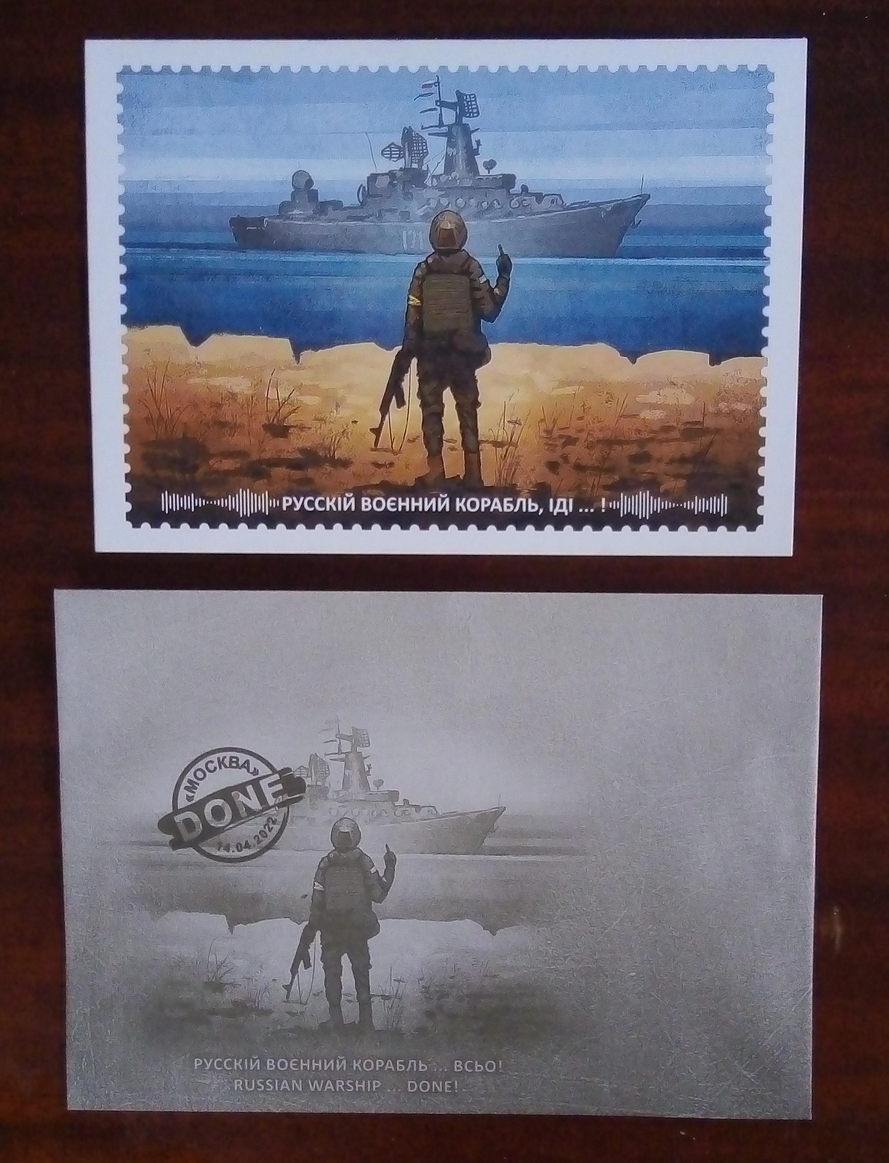 Марки Русскій воєнний корабль... всьо 4 блока + конверт, листівка