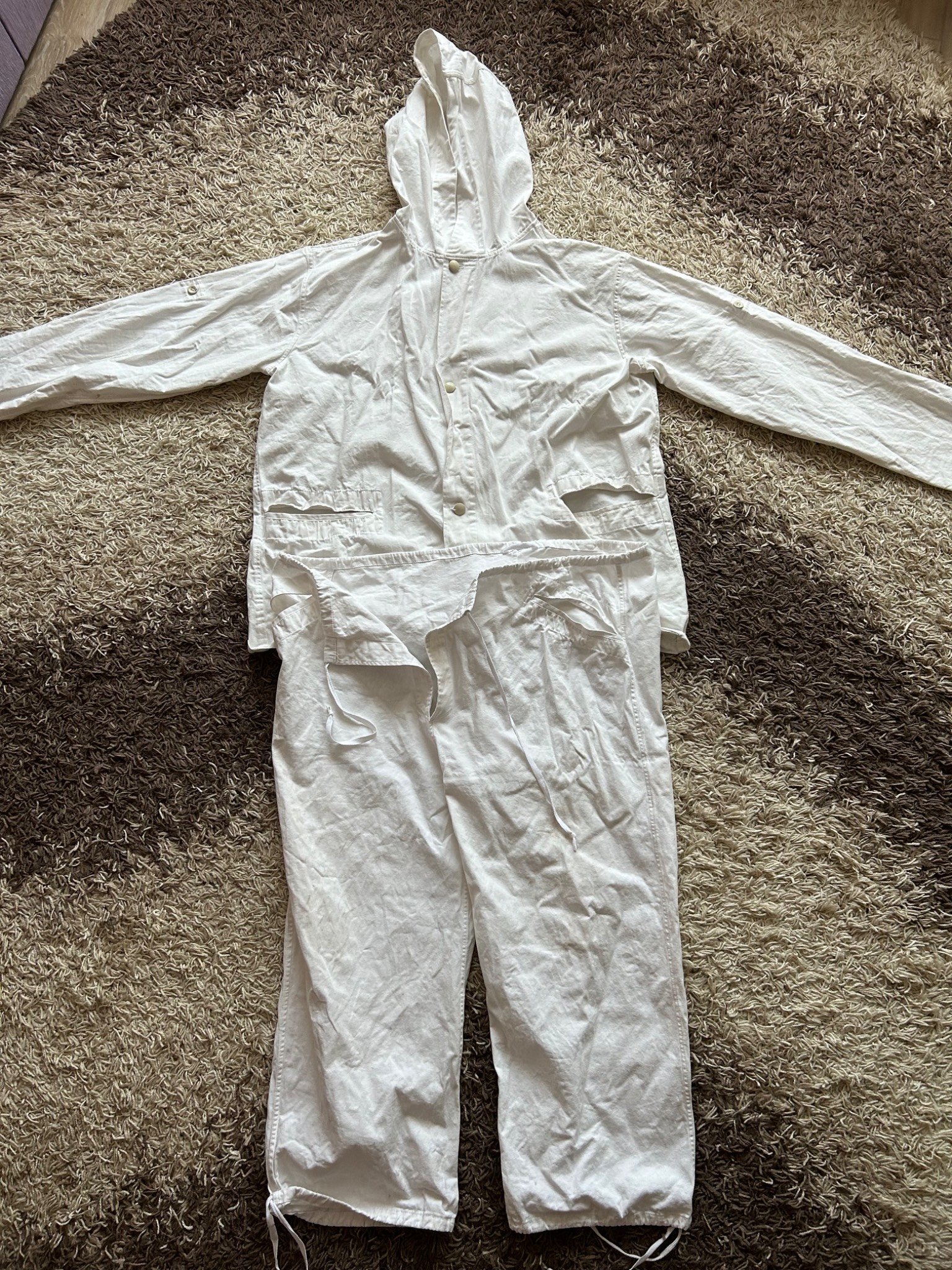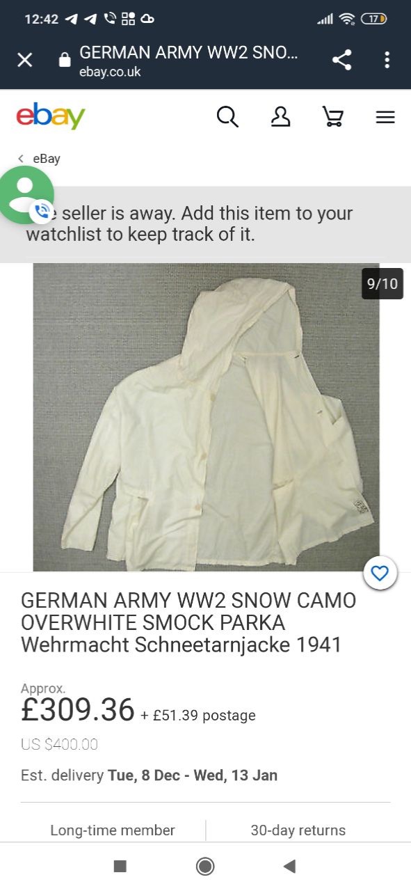 К вашему вниманию такой вот комплект на зиму Вермахта/СС. Было отшито пару экземпляров по фото оригиналов с европейских аукционов. Хорошая плотна хб диагональка. Не ядовито белоснежная. Состояние идеальное, одевался пару раз. Есть малозаметные следы от грязи, которые не отстирались. Очень объемный, штаны широкие, рукава длинные, как в оригинале( можно подвернуть под любую длину рук. Комплект на рост до 175см. Фото оригиналов приложу.