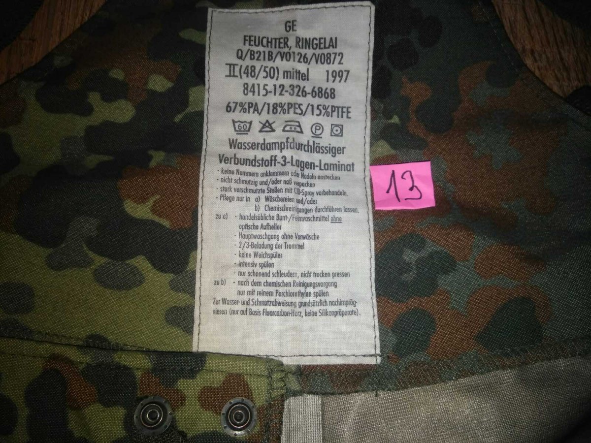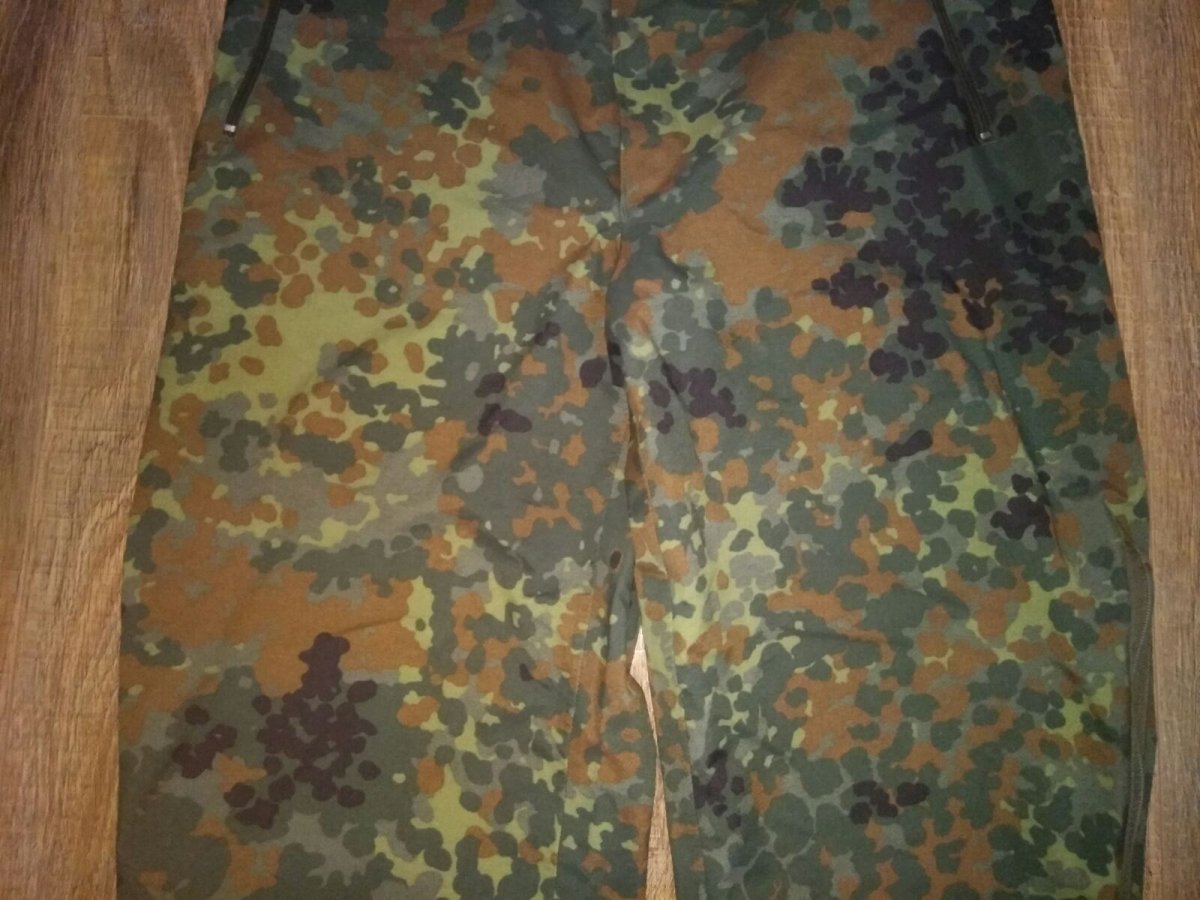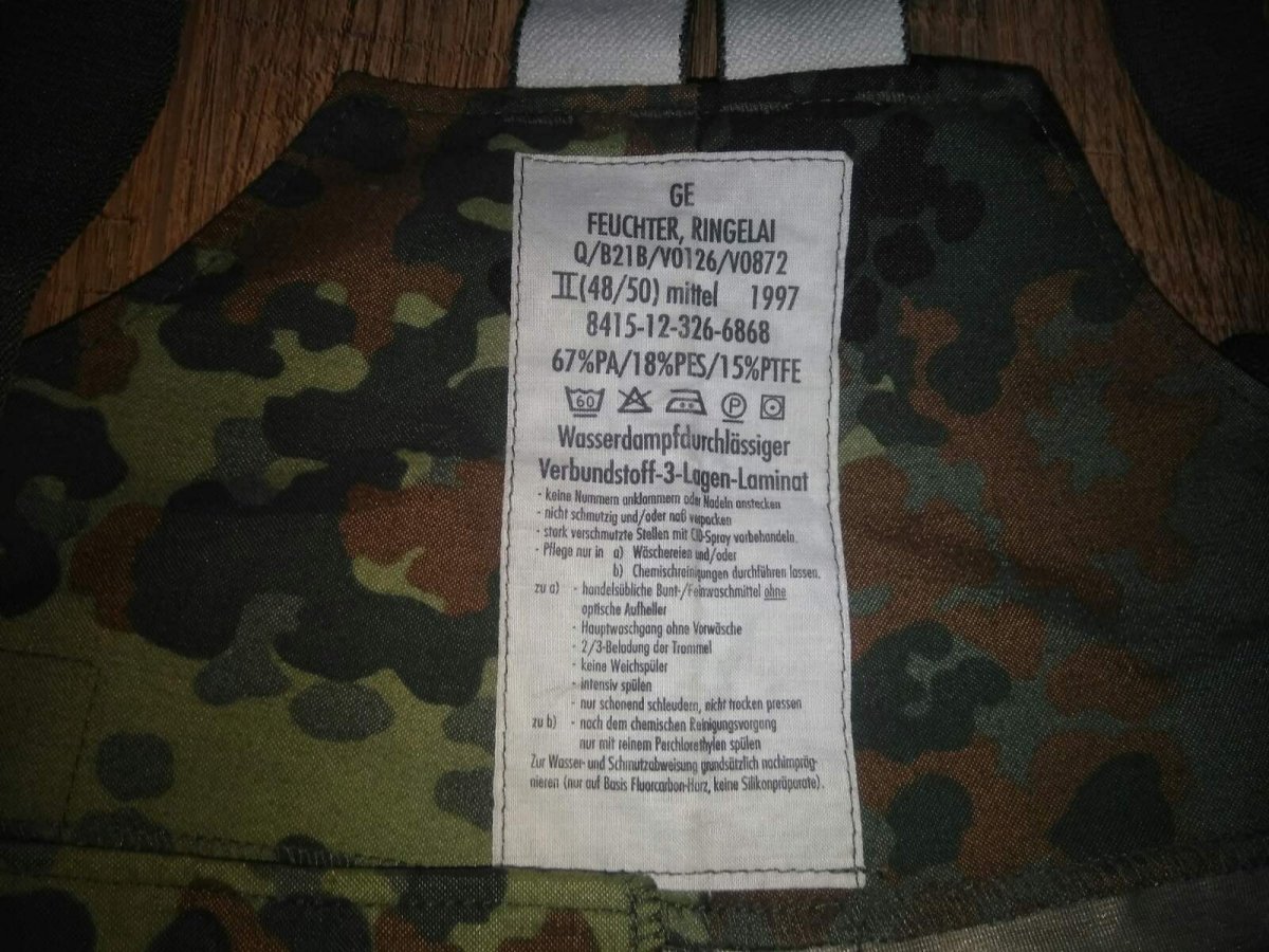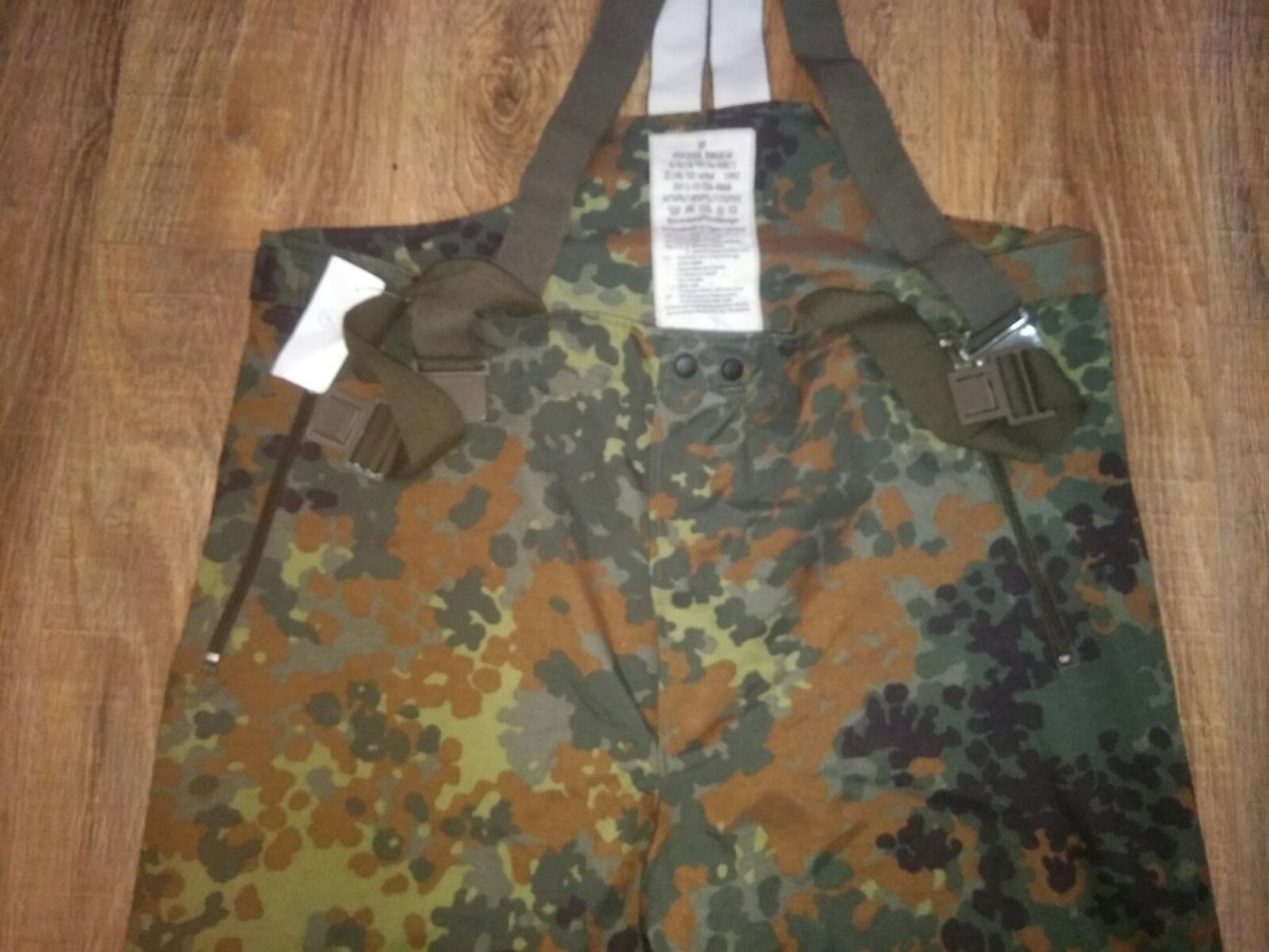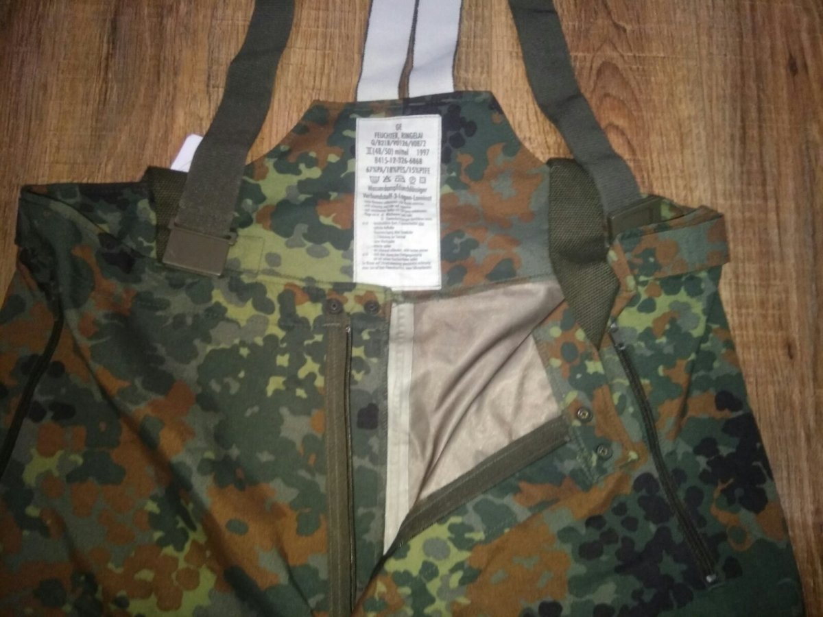 Внутренняя поверхность штанов Бундесвера в камуфляжной расцветке Flecktarn отлично скользит по любым одетым под них брюкам, не электризуется. В ее составе карбон и жироотталкивающее вещество, которое не дает потовым выделениям закупоривать мельчайшие поры мембраны. В штанах можно совершенно свободно двигаться. Все швы проклеены для дополнительной влагоустойчивости. Прочно удерживаются на владельце с помощью широких регулируемых подтяжек.
