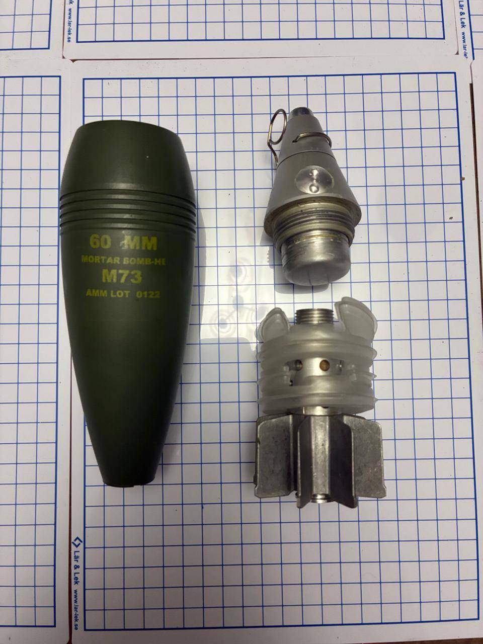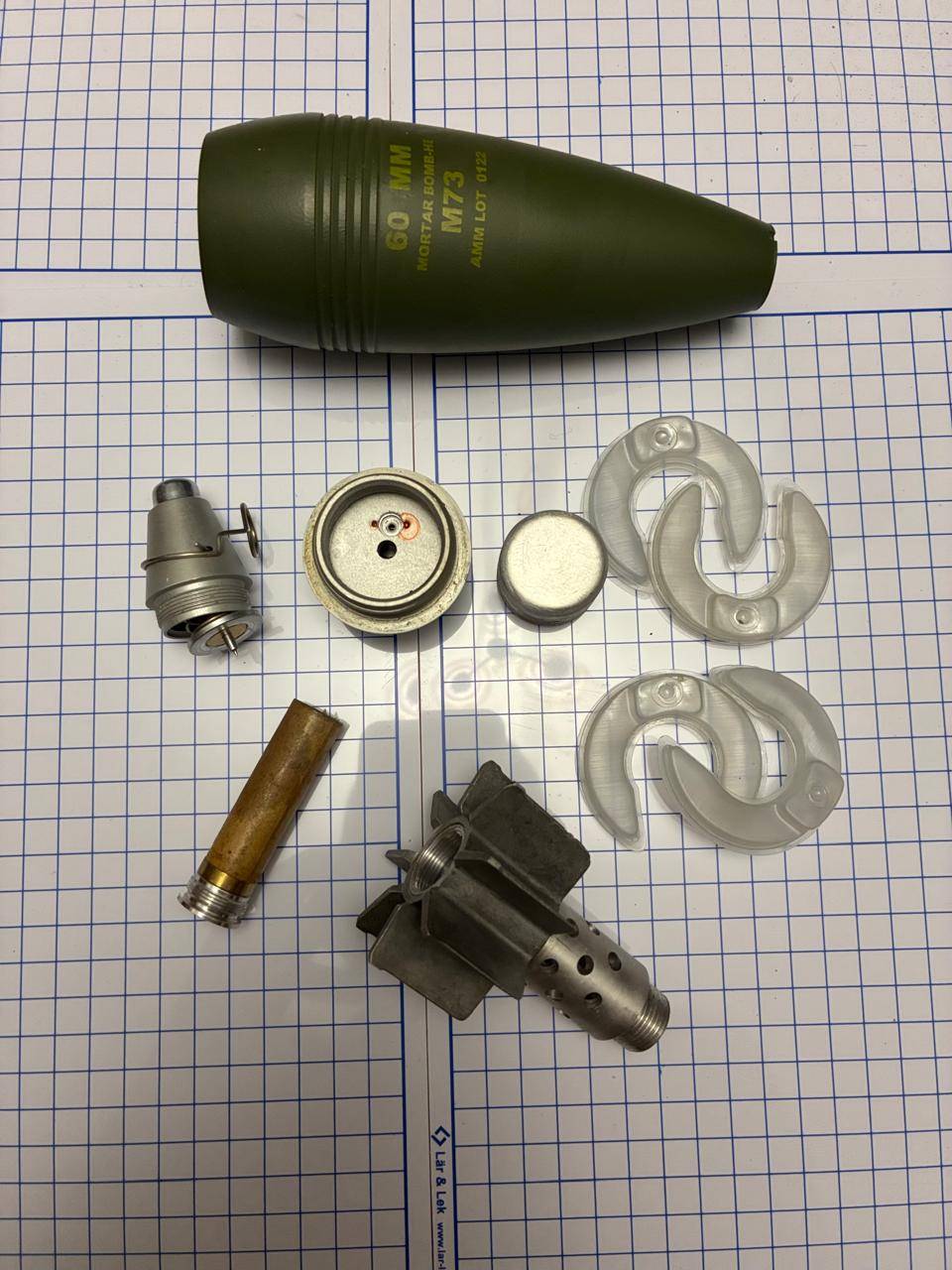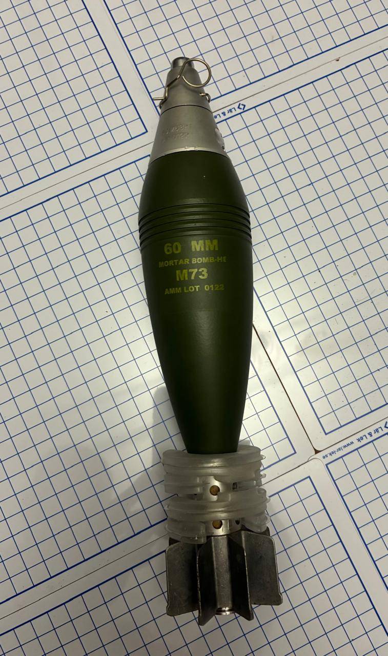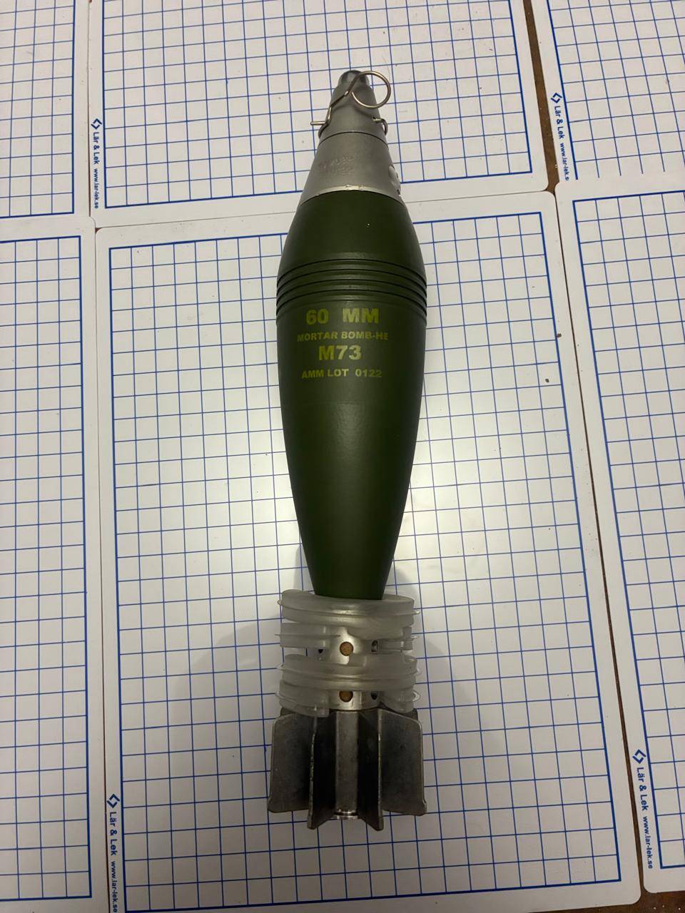 Ммг мінометної міни 60 мм. Міна повністю безпечна деактивована. Видалений основний заряд, деактивований підривник і вишибний заряд.